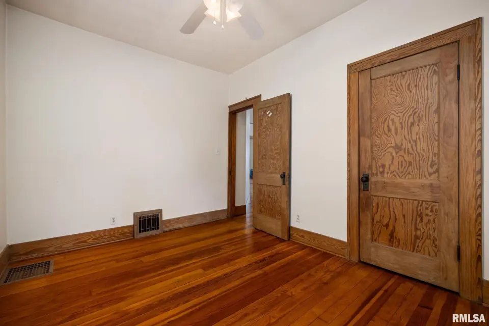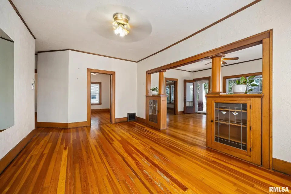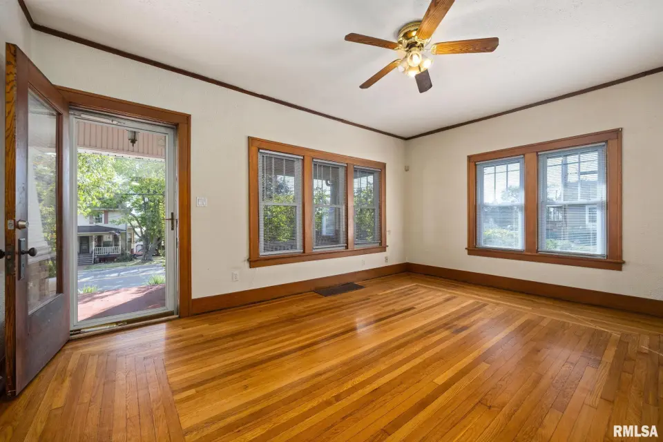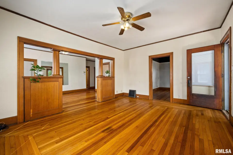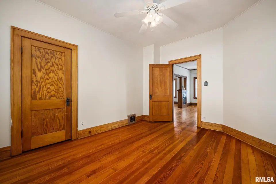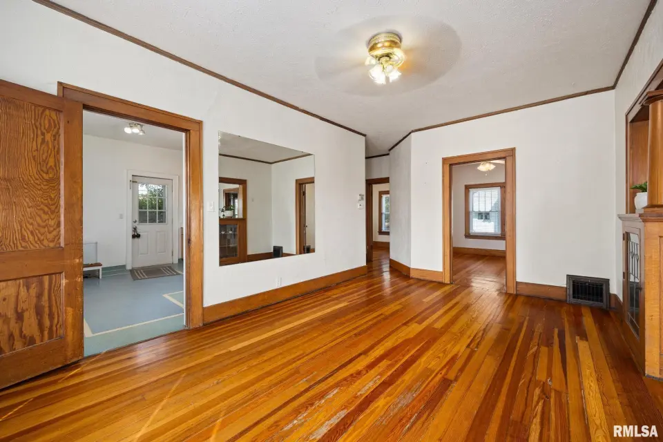 Features include unpainted woodwork, high ceilings, original colonnade bookcases with leaded glass and hardwood floors. The main level offers a spacious living room, a formal dining room with bay windows, a galley kitchen with period-appropriate linoleum flooring, three bedrooms and one full bathroom. The carpeted upper level is dedicated to the primary suite, complete with a walk-in closet and ensuite bathroom. A large basement provides laundry and generous storage space. Furnace, AC and water heater replaced in 2021. Appliances are not warranted and sold as-is.