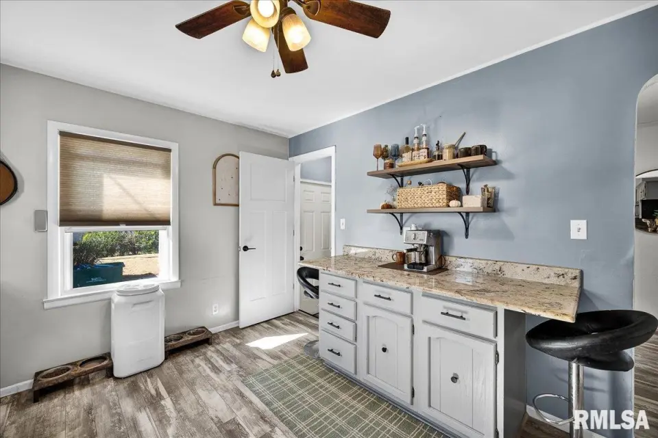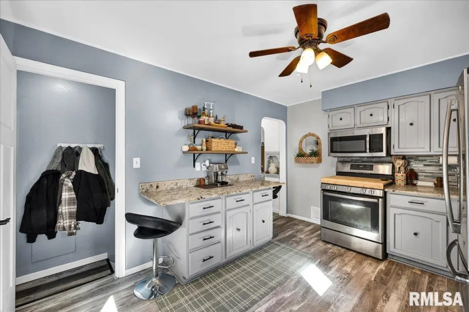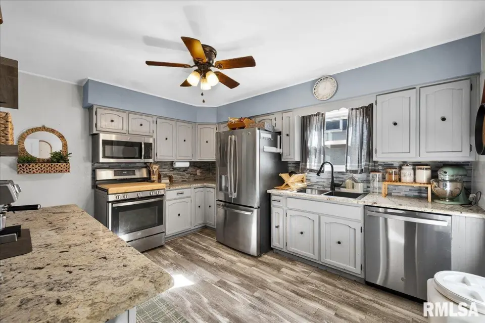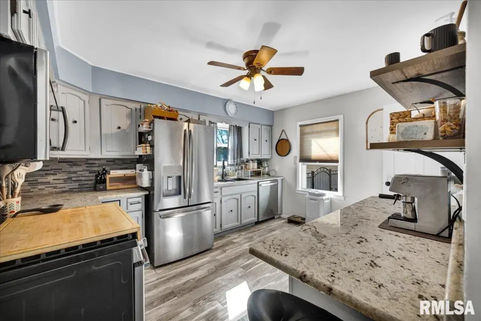 This well-maintained residence offers over 1,500 finished square feet with numerous updates throughout. The main level features two bedrooms, an updated bathroom, and an updated kitchen with modern finishes including granite countertops. The fully finished basement provides a family room with a bar perfect for relaxing and socializing, and a second full bathroom. Recent improvements include a brand-new air conditioning unit, ensuring comfort and efficiency and a new water heater. Exterior amenities include a detached two-car garage and a back patio, perfect for outdoor enjoyment and a fully fenced backyard. Centrally located, this home offers convenient access to shopping, dining, and I74. Move-in ready and thoughtfully updated, this property presents an excellent opportunity in a prime Peoria location. Schedule your appointment today!