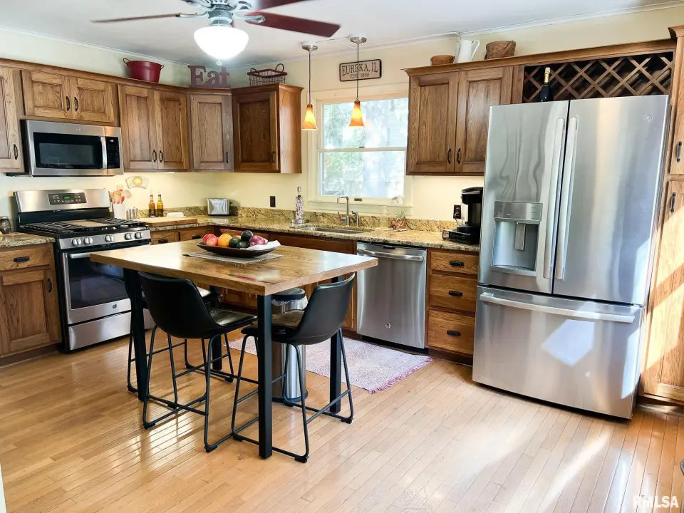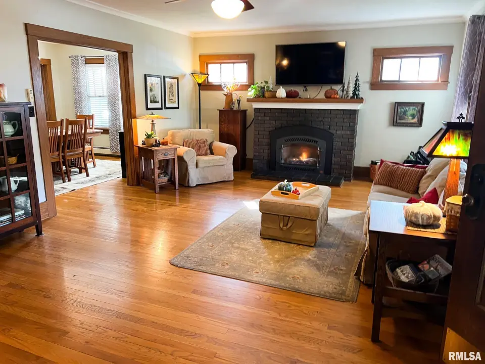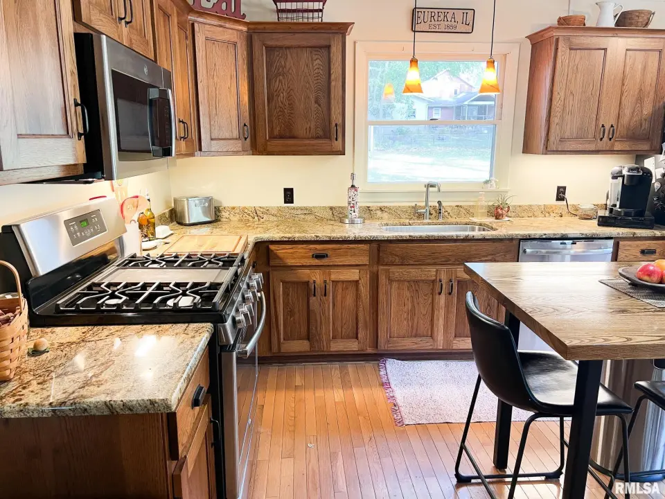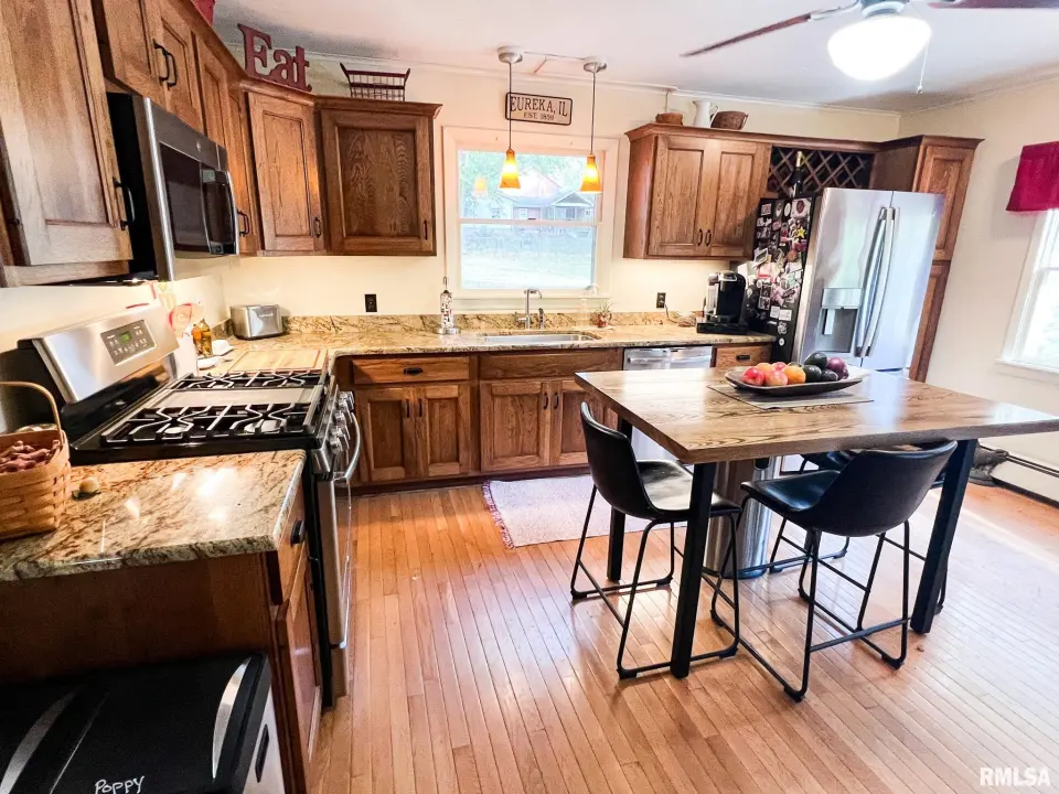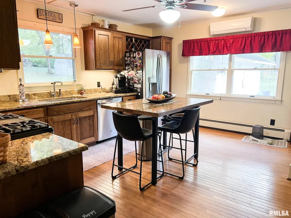 Old-world charm meets modern comfort in this beautiful 4 bedroom, 2 bath Craftsman home ideally located in the heart of Eureka. Enjoy the inviting covered front porch as you drive through the charming carport to the oversized one-car garage leading to the brick patio overlooking the spacious lot. The large yard boasts mature trees a serene backyard, private patio, & a cozy fire pit - perfect for cool fall evenings. Inside, you'll find original well maintained hardwood floors & gorgeous trim work throughout. The spacious living room features a cozy gas log fireplace w/ remote, & the formal dining room flows nicely into the generous sized kitchen. The main-floor primary suite includes a private exit to the backyard patio. Upstairs, you'll find 3 additional bedrooms & a fully remodeled bathroom w/ plenty of space for everyone. The basement offers extra storage, a laundry room area, & a large family room for additional living space. Updates add modern convenience w/out sacrificing character. Metal roof, central air, mini split, updated electrical panel, ceiling fans w/ upper lighting, remodeled bathroom, solid surface countertops, Apothecary cabinet fronts in the kitchen, dewatering system, radon mitigation system, & enlarged front gutters all add to the value & comfort of this home!! Conveniently located within walking distance of downtown Eureka, this home is truly a gem-don't miss your chance to make it yours!