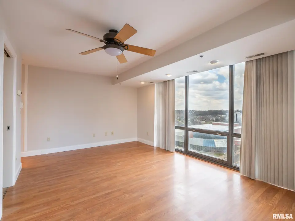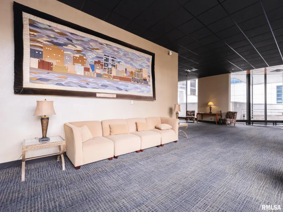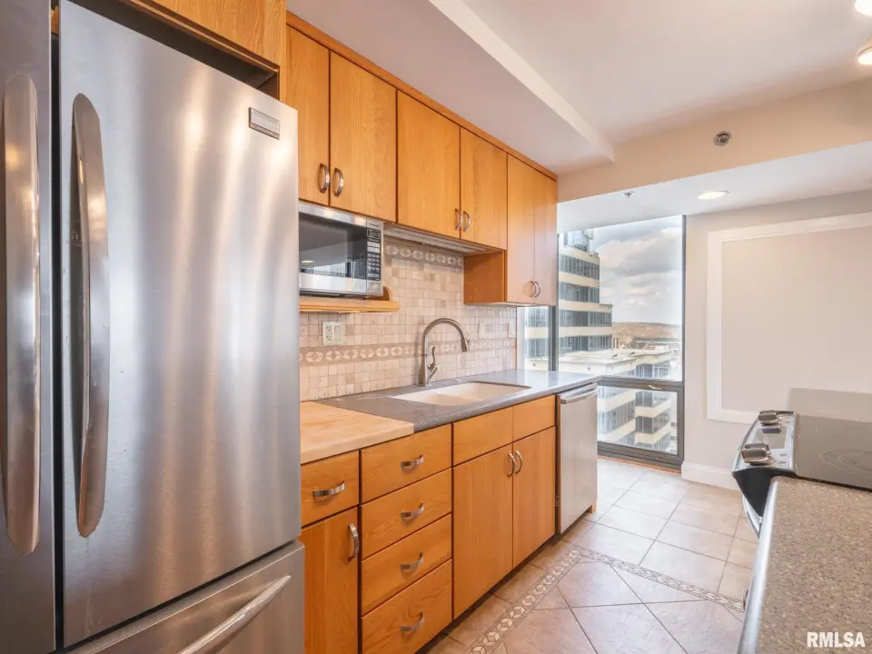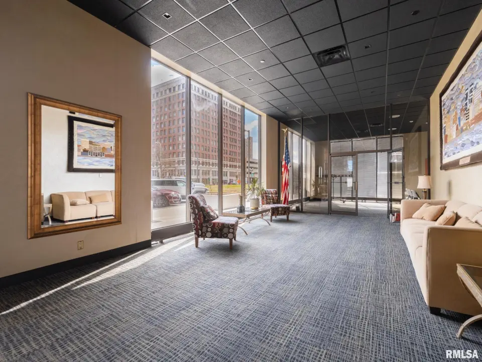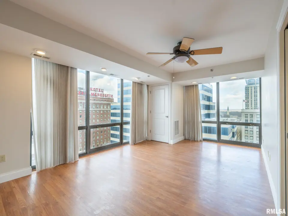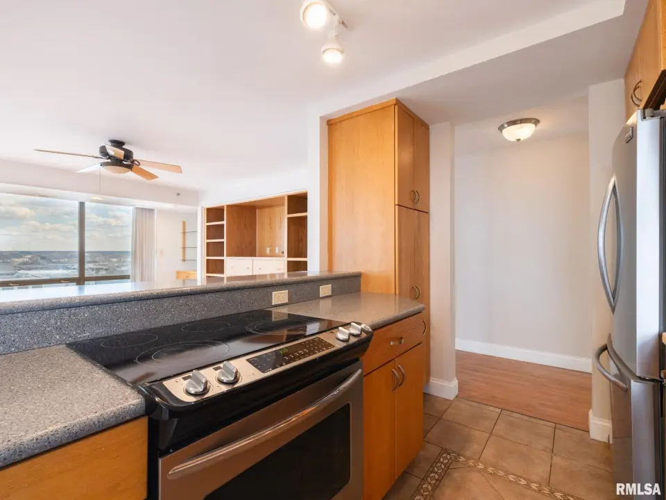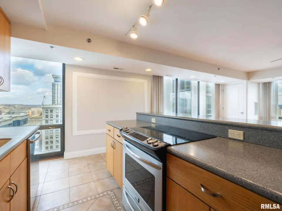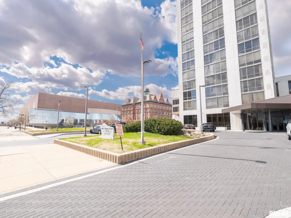 Don't miss this incredible opportunity to own a 16th-floor condo in the heart of downtown Peoria! The Living room has built-in multi-purpose bookshelves and recessed lighting, creating a warm and inviting atmosphere. The kitchen boasts updated flooring, stainless steel appliances, and Corian countertops—perfect for both everyday living and entertaining. The primary bedroom includes a spacious walk-in closet with additional shelves for shoes, sweaters, etc. and an attached full bath with a relaxing jetted tub. There is also a second bedroom and full bathroom. In unit washer/dryer. This condo is truly a must-see! Schedule your showing today! All measurements are approx. & not deemed reliable.