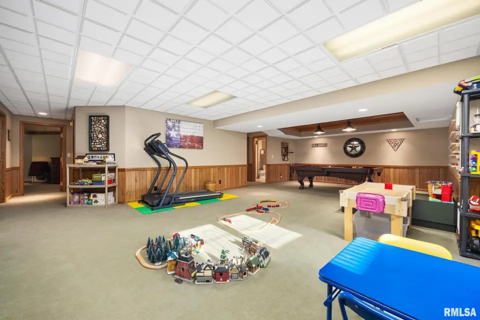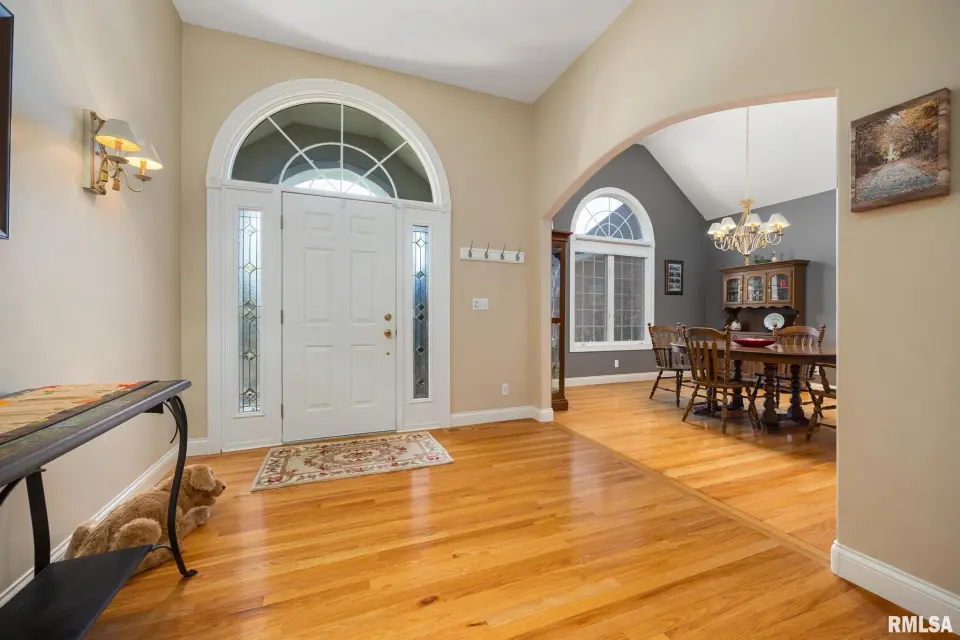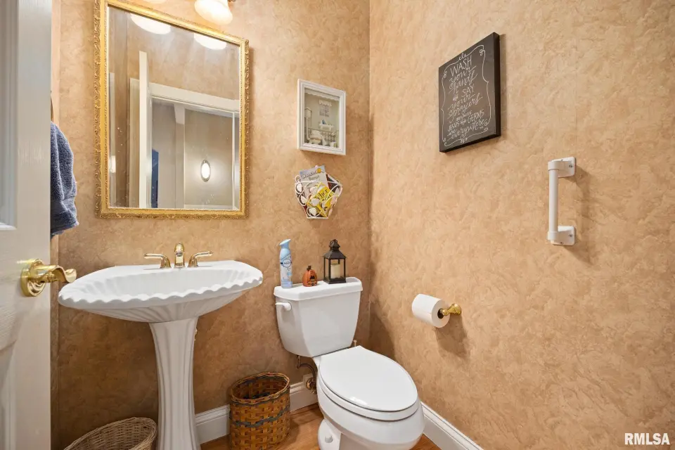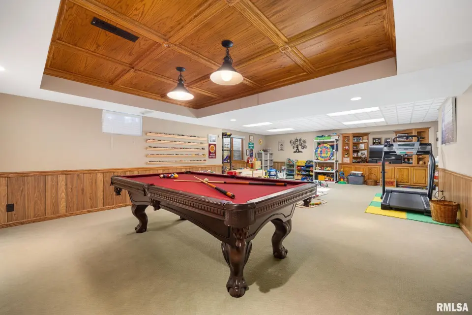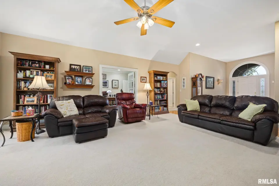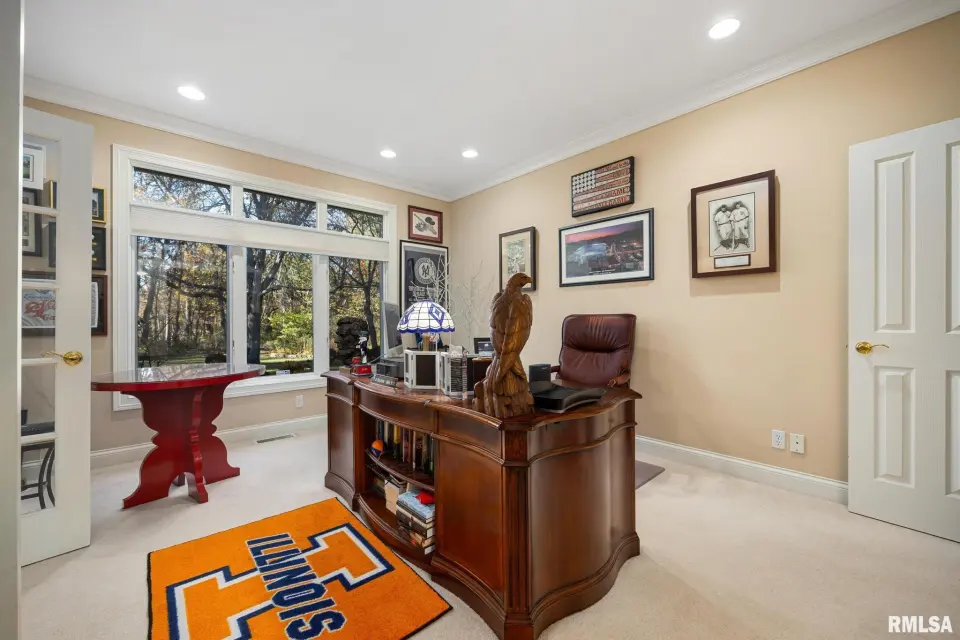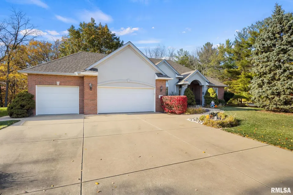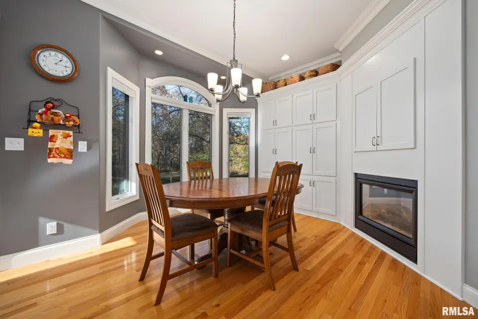 The spacious great room offers a tray ceiling, a see-through fireplace, and French doors that open to a versatile office or second bedroom. The beautifully updated kitchen boasts white cabinetry, quartz countertops, slate appliances, and a generous dining area with a wall of custom cabinets and a cozy fireplace. Sliding doors lead to a patio overlooking a private, wooded backyard, perfect for relaxing or entertaining. Additional features include a pantry closet and a convenient roll-out pantry cabinet. The primary suite is a true retreat, offering a sitting area with fireplace, office space, and access to a private deck. The luxury bath includes double sinks, a jetted tub framed by elegant columns, and a separate shower and toilet room. A main-floor laundry room with cabinetry and a deep sink adds everyday convenience. The finished basement expands your living space with a family room featuring a built-in bar, custom built-ins, a large rec/flex room with egress window, a full bath, and two storage rooms. This home blends comfort, elegance, and functionality, inside and out.