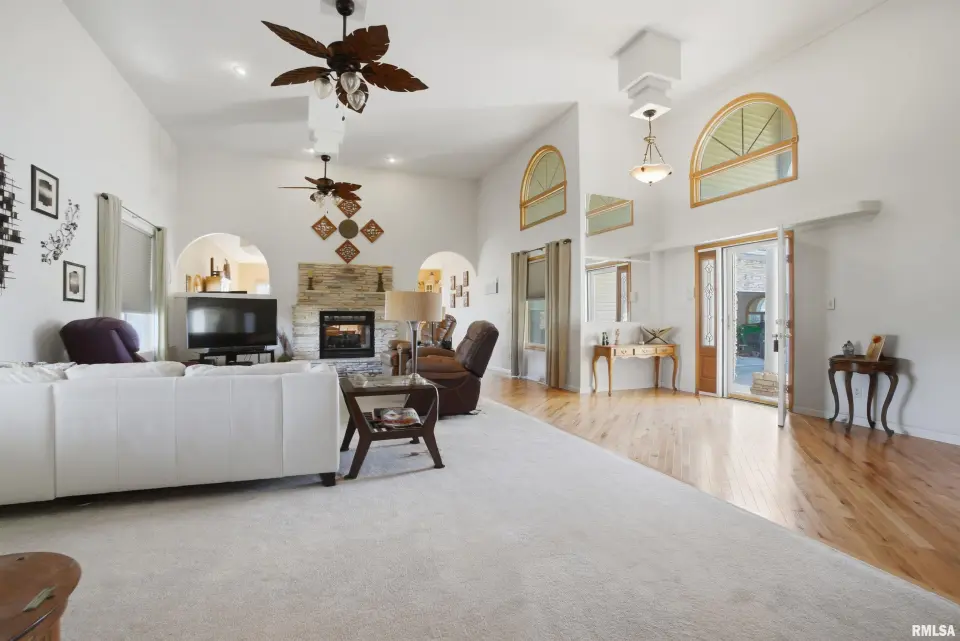 Designed for both comfort and connection, this home features soaring 14-foot ceilings, a two-sided fireplace that warms both the great room and dining area, and a sunny open layout that feels instantly inviting. The primary suite includes a private bath, while the large kitchen offers an island, informal dining, and plenty of cabinet space. Step outside to enjoy the covered deck and patio, perfect for morning coffee or watching sunsets over your own slice of lake frontage. A full walk-out basement with high ceilings offers endless possibilities—finish it for extra living space, a rec room, or a workshop. There’s also a 3-car attached garage plus a 2-car detached garage/workshop with electricity and concrete floors—ideal for hobbies, storage, or projects. Recent updates include new shingles (2022). With peaceful water views, level ground, and the convenience of being just minutes from town, this property offers the perfect blend of privacy, space, and modern comfort. If you’ve been dreaming of a home with land, water, and room to breathe—this one’s for you.