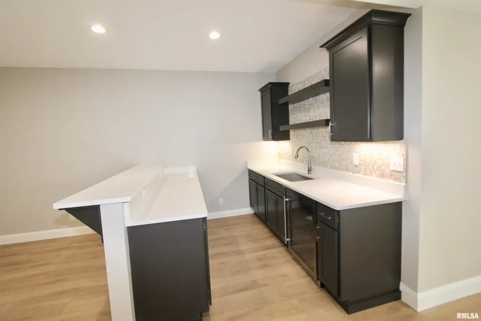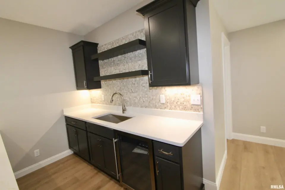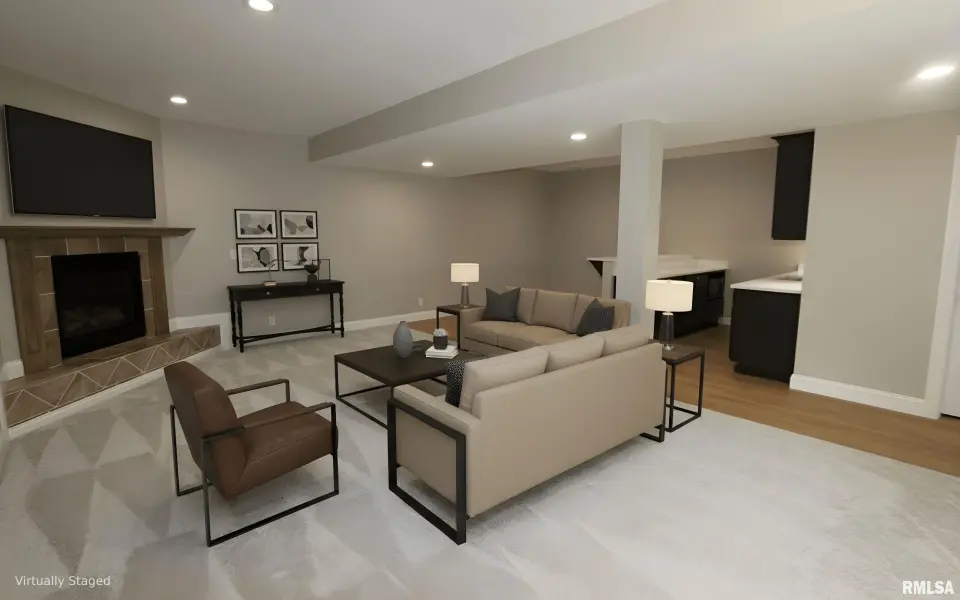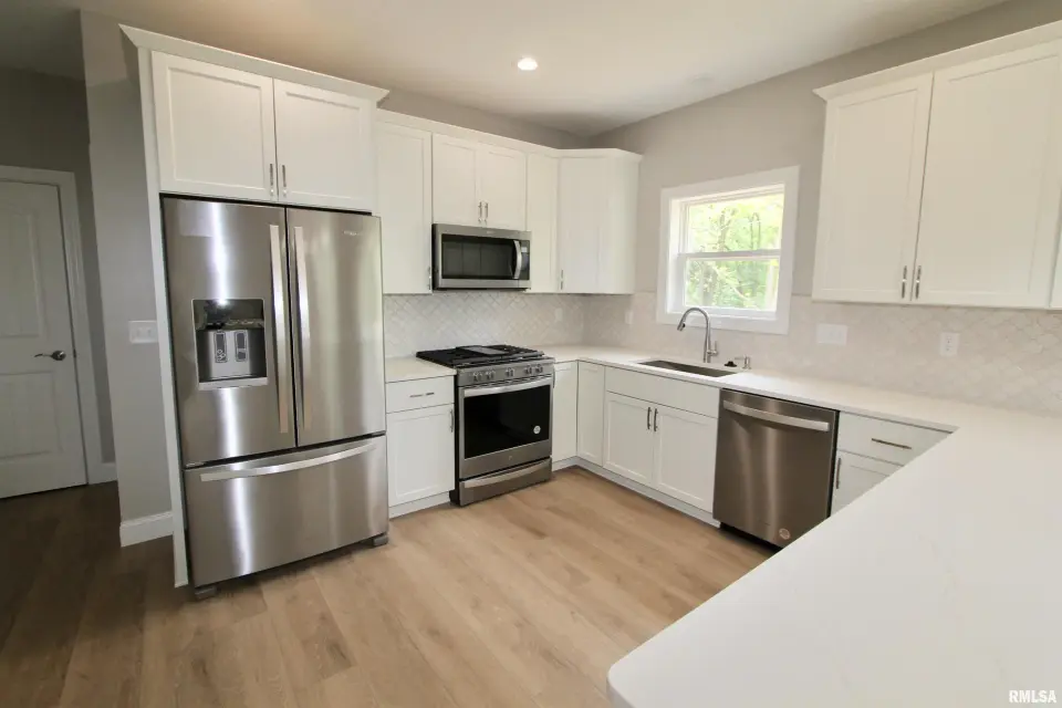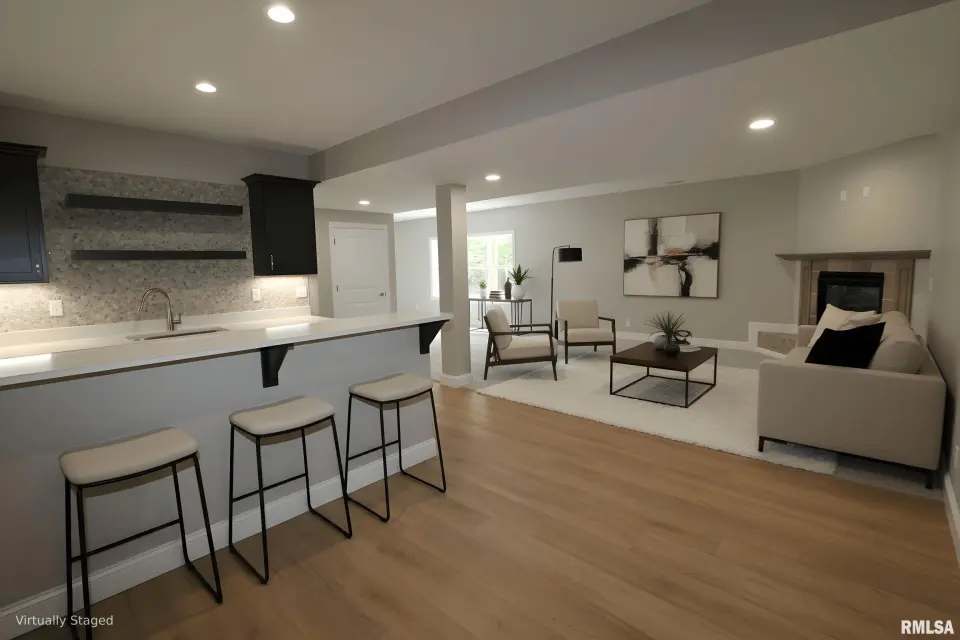 Beautiful and durable luxury vinyl flooring throughout the main floor living space! Generous size main floor laundry/mud room complete with coats hooks, built in bench, cabinetry, and utility sink. Formal dining or office off the great room featuring French doors and additional closet space. You will find Quartz countertops, custom white cabinetry, stainless appliances, huge pantry cabinet, and breakfast bar in the stylish kitchen. Desirable split bedroom floor plan. Lots of storage space including coat, utility and linen closets. Generous size primary suite with tray ceilings and large walk-in closet. Dual sinks, linen cabinets and all tiled shower in the primary bath. Lots of space to entertain inside and out! Upper-level covered deck off the kitchen makes grilling easy! Full, finished walkout basement with a huge rec room featuring a gas log fireplace. All your guests will love the stunning wet bar with custom cabinetry, quartz countertops, stylish backsplash, and stainless appliances. You will also find a full bath and two additional bedrooms in the 9ft finished basement. Step outside from the basement to the covered patio and enjoy the serene, wooded park-like backyard.