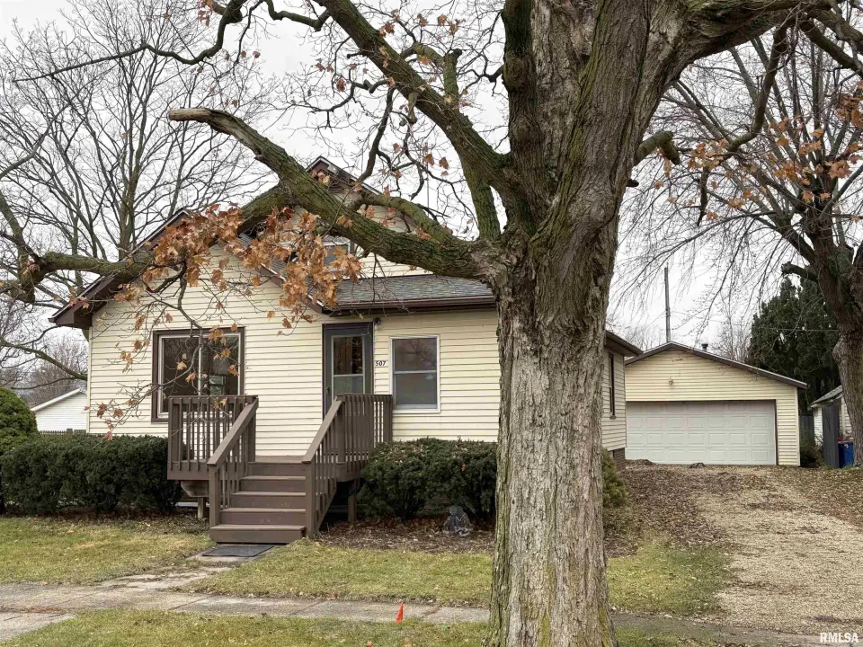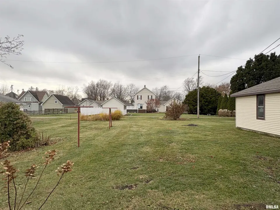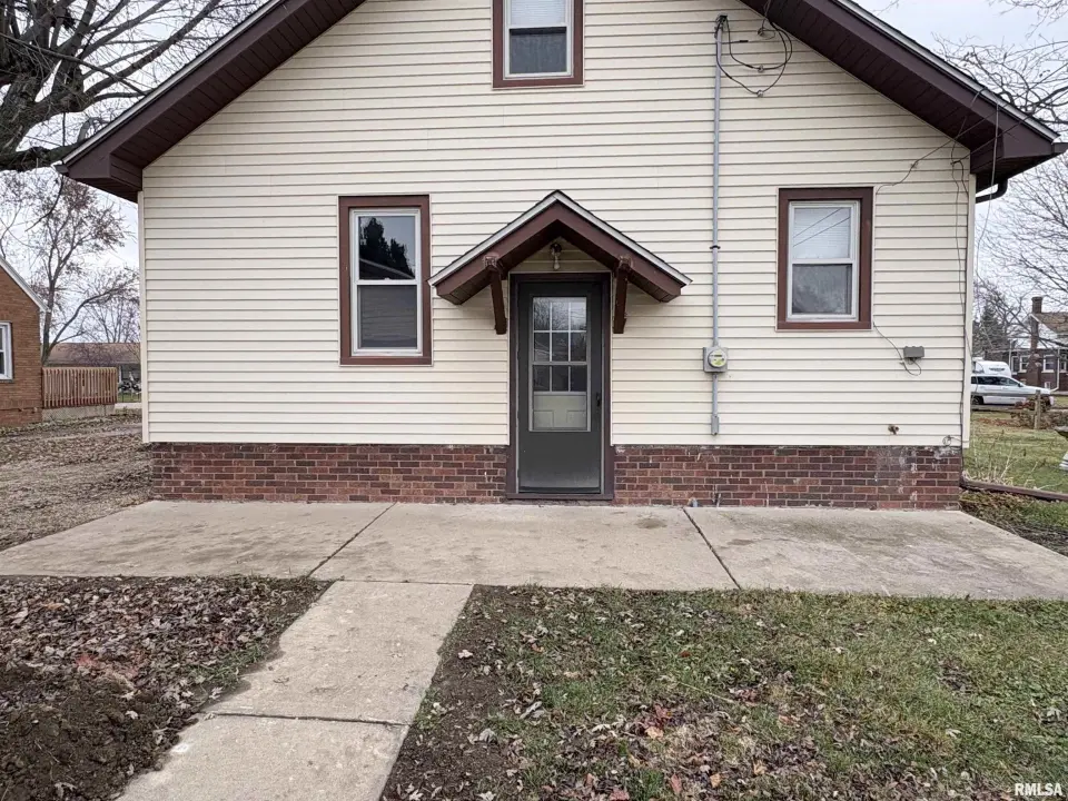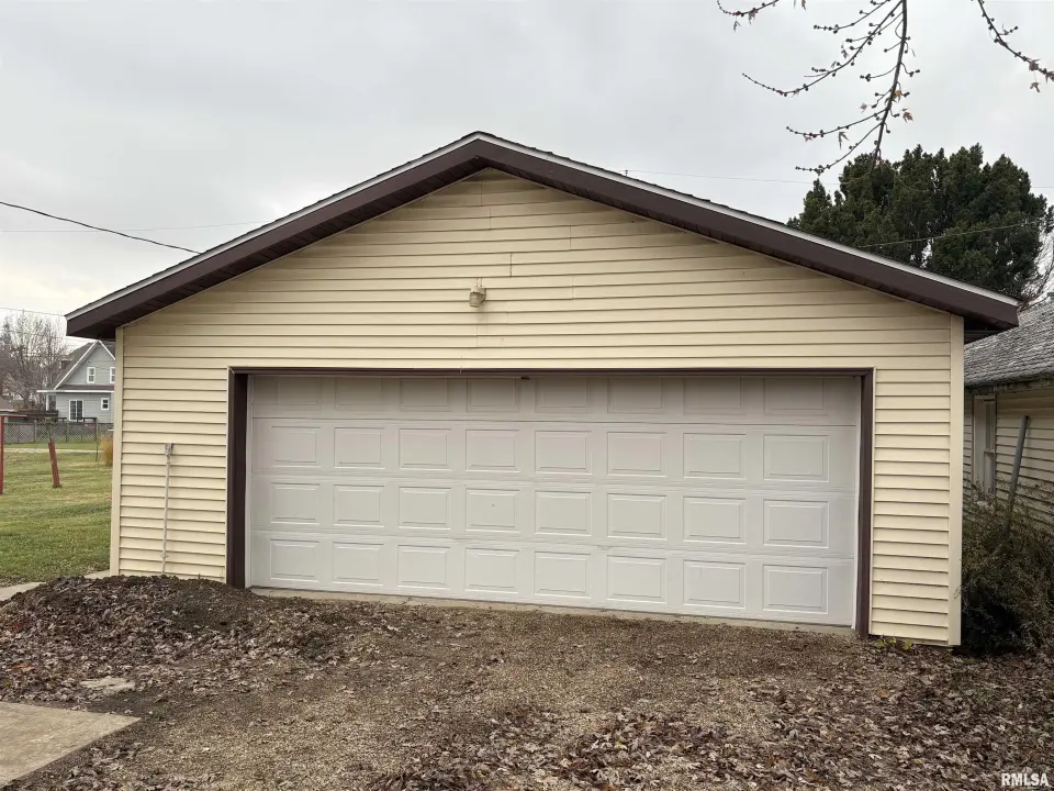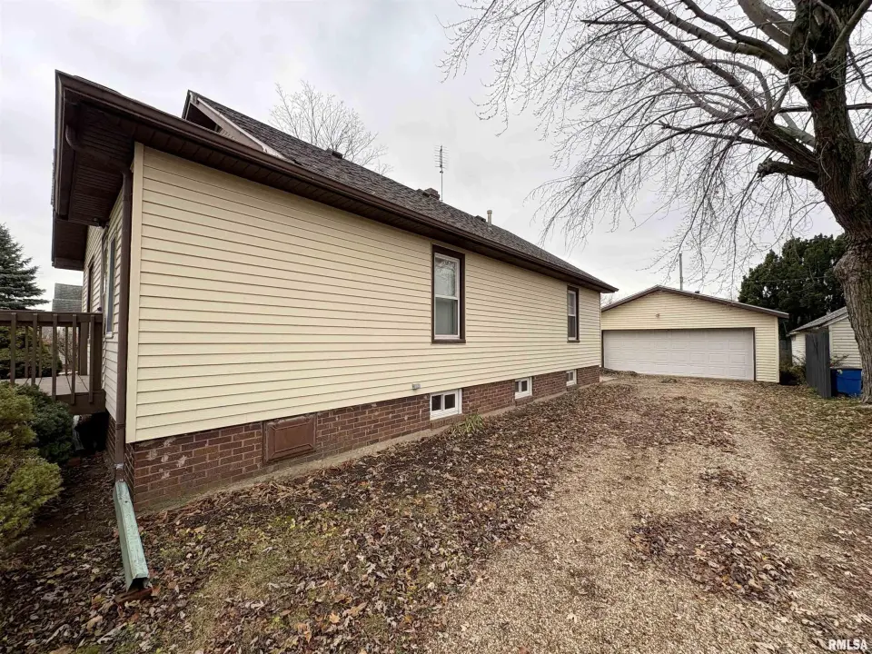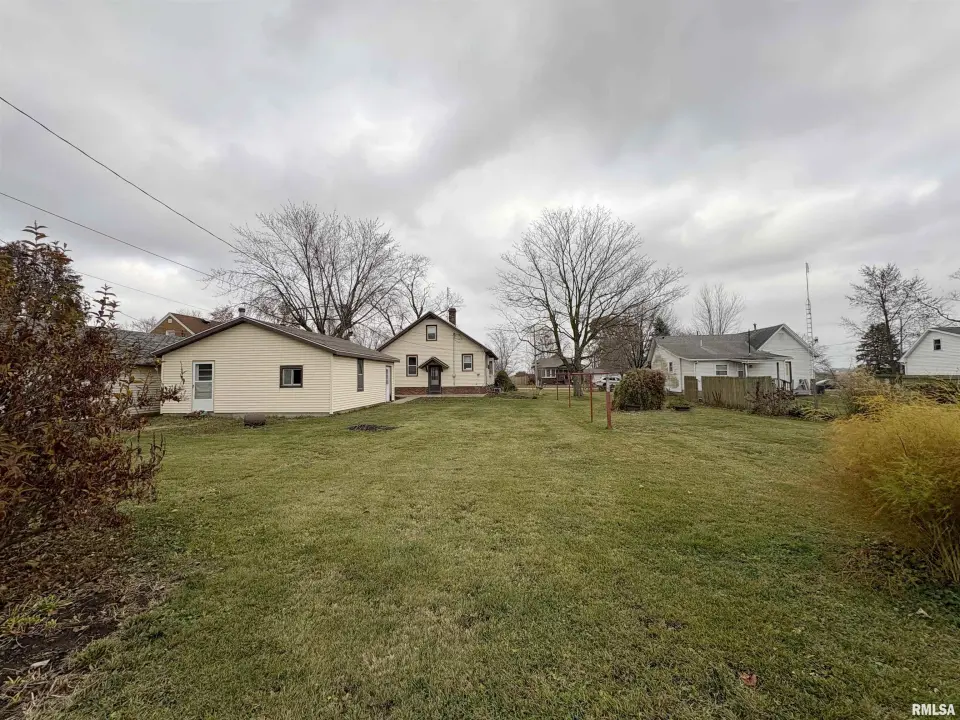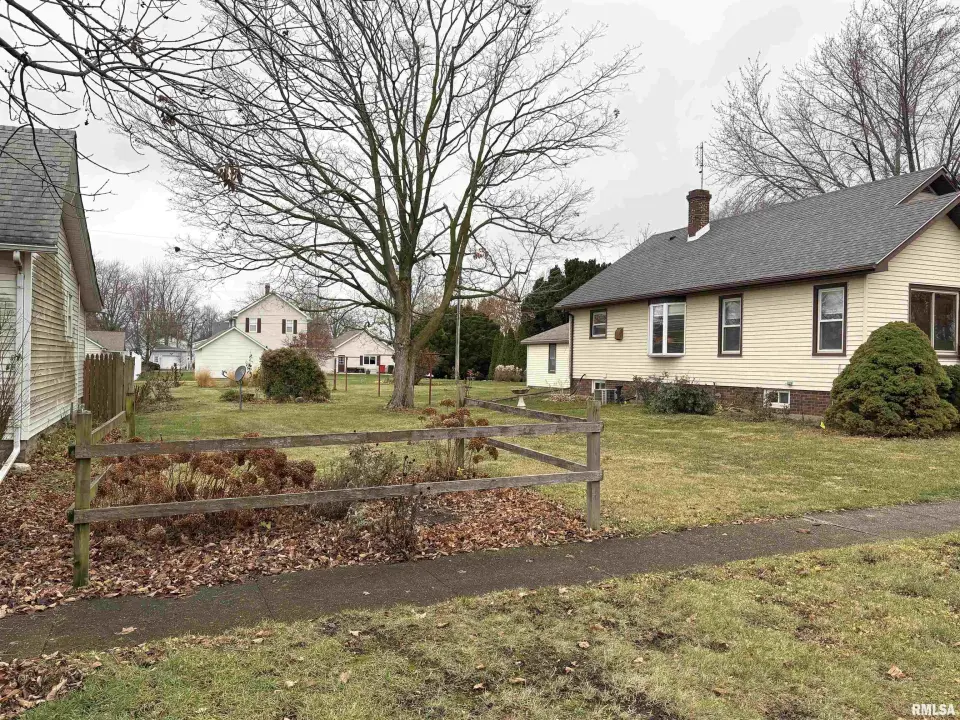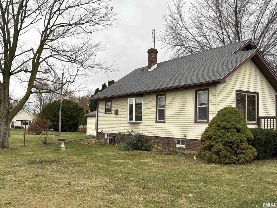 The dining room features a beautiful Andersen bay window that bathes the space in natural light, plus emergency heat for those chilly Illinois evenings. The fully equipped oak kitchen features a convenient breakfast bar with three bar stools included – perfect for morning coffee or casual meals. Both main floor bedrooms offer lighted closets for easy organization, while the large upstairs bedroom provides excellent space and attic storage access. The remodeled bathroom (approx. 5-10 years) and updated oak trim and doors (approx 10 years), add modern touches to this chaming home. Practical features abound, including steel siding, updated windows & a 100 amp electrical panel. The large unfinished basement offers a 11’x7’10” workshop area, original 11’x6’7” coal room plus laundry area with washer, dryer and utility sink. Stay comfortable this winter with the HE furnace. Central air system features a new capacitor 2025. The generous level yard showcases numerous perennial gardens that bloom beautifully throughout the seasons plus a 25’x7’ patio. 2 stall detached garage provides ample parking & storage. Recent septic pumping in 2025. Located near The Pavilion park and convenient to Midland High School.