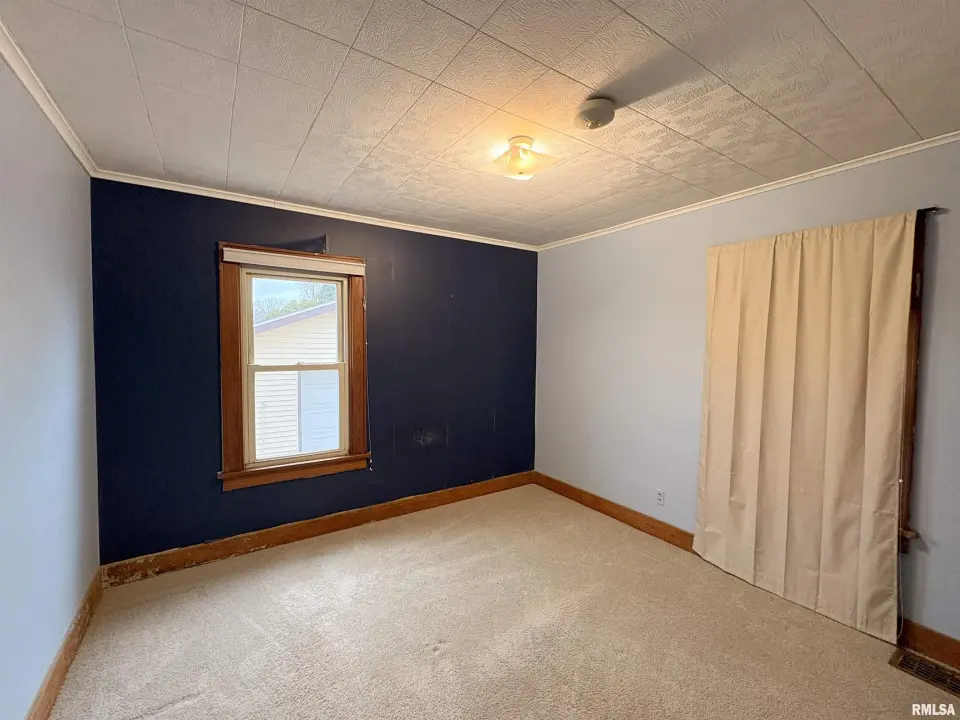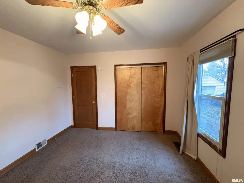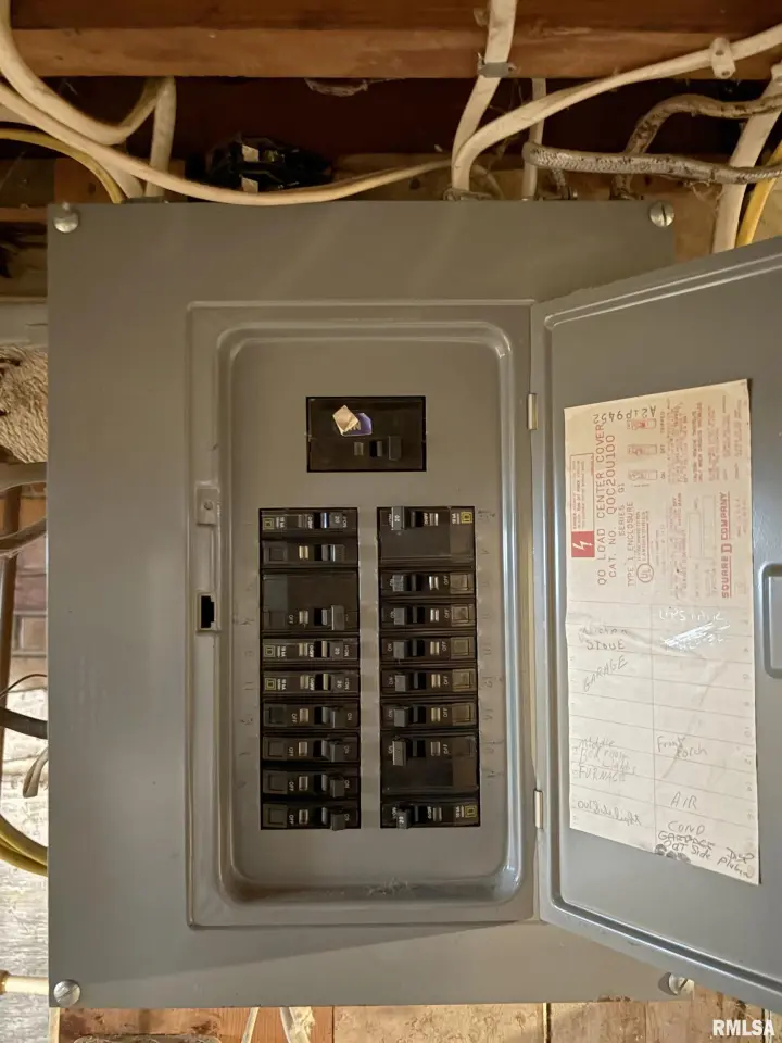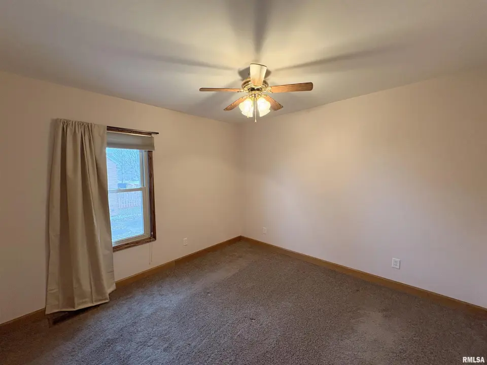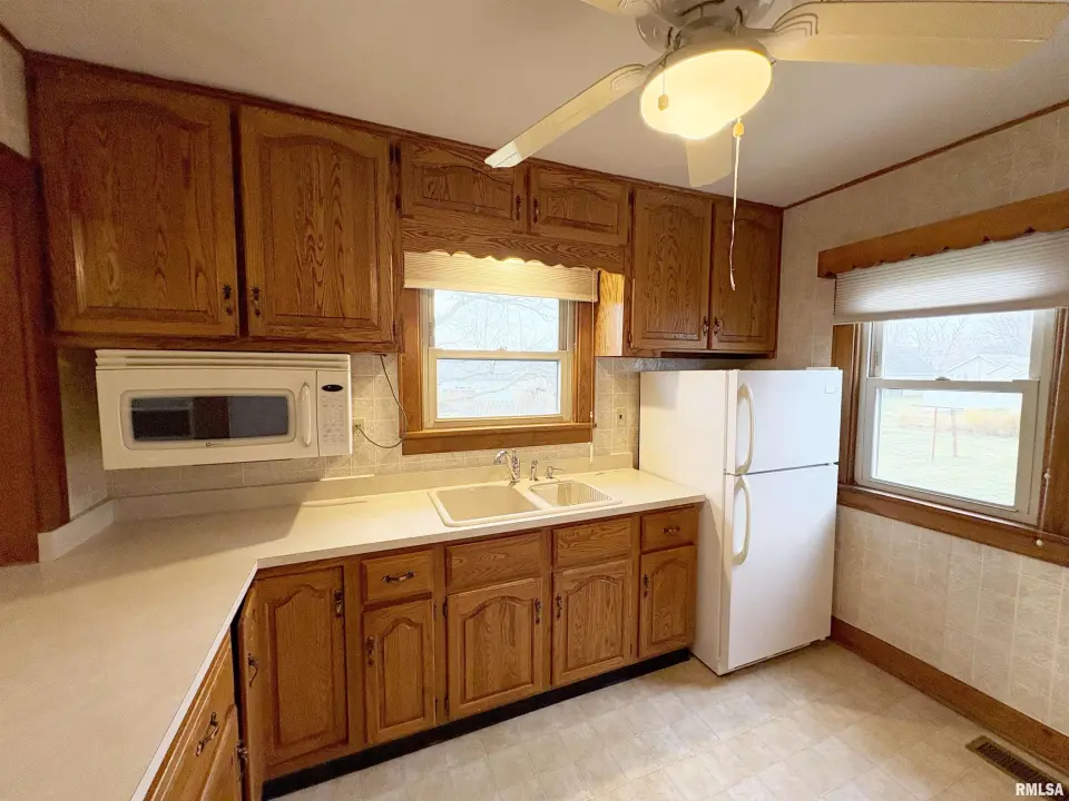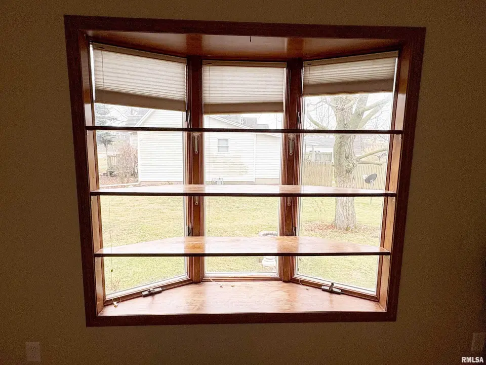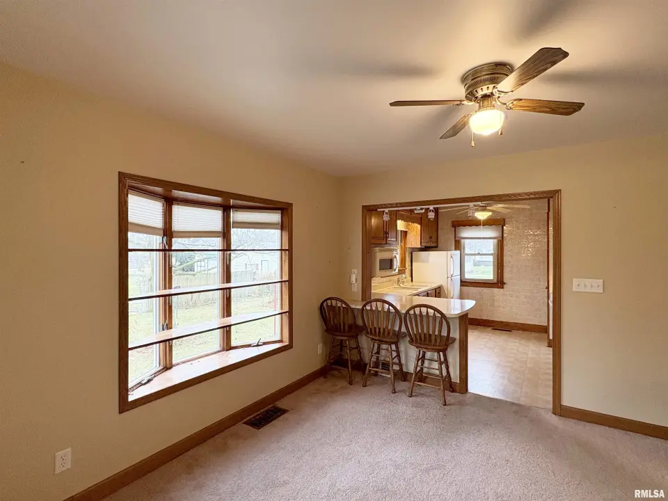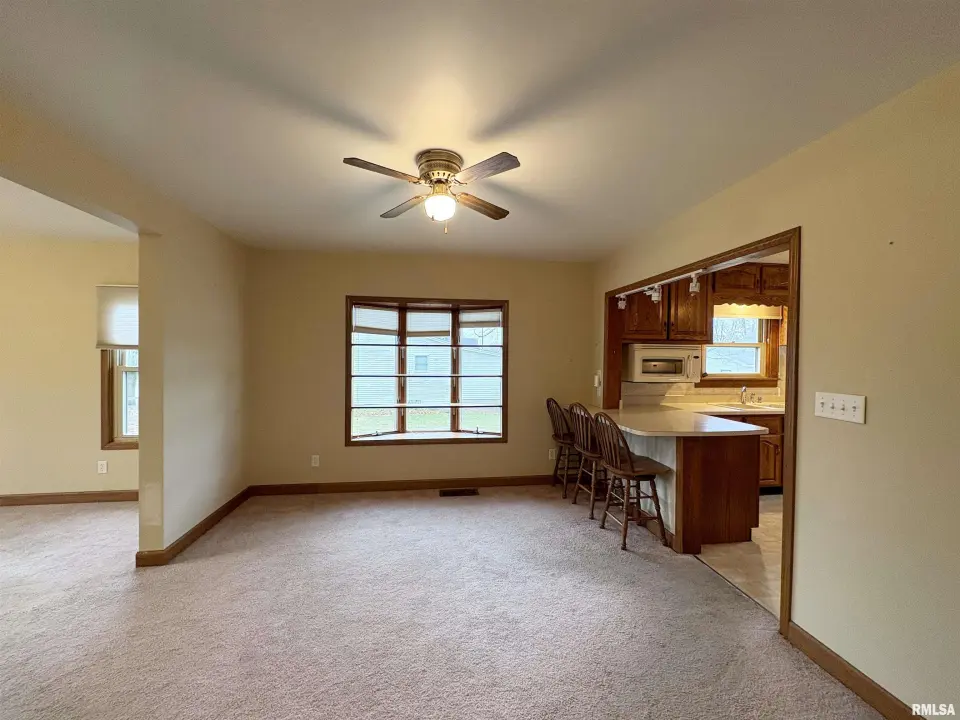 The dining room features a beautiful Andersen bay window that bathes the space in natural light, plus emergency heat for those chilly Illinois evenings. The fully equipped oak kitchen features a convenient breakfast bar with three bar stools included – perfect for morning coffee or casual meals. Both main floor bedrooms offer lighted closets for easy organization, while the large upstairs bedroom provides excellent space and attic storage access. The remodeled bathroom (approx. 5-10 years) and updated oak trim and doors (approx 10 years), add modern touches to this chaming home. Practical features abound, including steel siding, updated windows & a 100 amp electrical panel. The large unfinished basement offers a 11’x7’10” workshop area, original 11’x6’7” coal room plus laundry area with washer, dryer and utility sink. Stay comfortable this winter with the HE furnace. Central air system features a new capacitor 2025. The generous level yard showcases numerous perennial gardens that bloom beautifully throughout the seasons plus a 25’x7’ patio. 2 stall detached garage provides ample parking & storage. Recent septic pumping in 2025. Located near The Pavilion park and convenient to Midland High School.