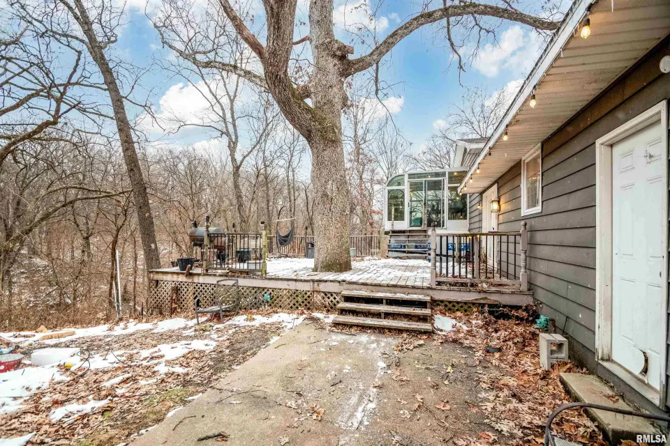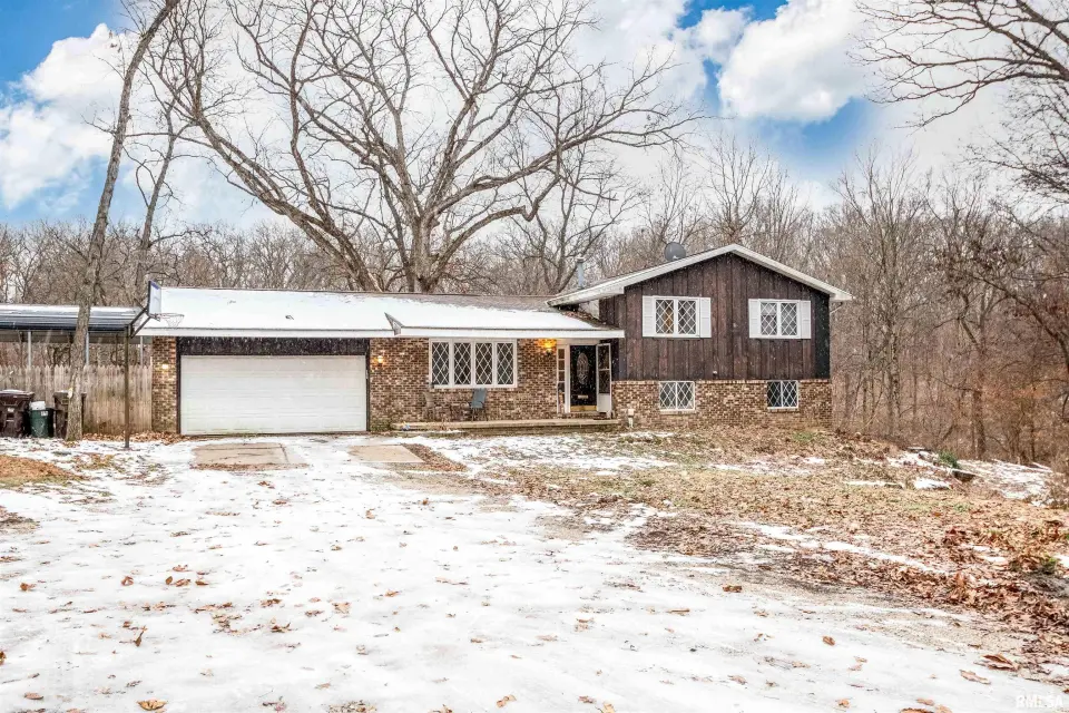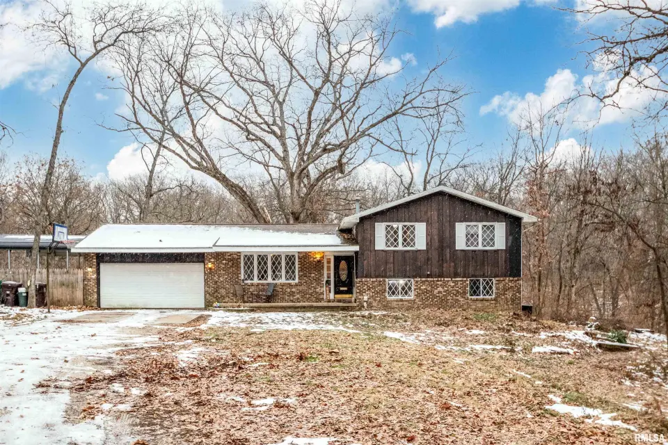 Located only 2 miles off I-74 west of Peoria in the desirable Kickapoo/Edwards area, the property sits within the Elmwood and popular local attractions. Set back on a quiet street, the home is nestled on 1.68 scenic acres with mature trees, a creek, and picturesque wooded views—creating a private, nature-filled retreat. The main and upper levels feature three bedrooms, a full bathroom, a comfortable living room, and an updated kitchen and dining area. The unfinished walk-out lower level offers a large family room with sliders to a covered sunroom, providing great potential for additional living space. The primary suite is a standout, offering a walk-in closet, a second spacious closet, and private slider access to the sunroom—perfect for relaxing, watching wildlife, or enjoying winter snowfall views. Recent updates include a new roof (2020), a complete main-floor remodel with a refreshed kitchen featuring custom tile and soft-close cabinetry, wood-look tile flooring in the living and dining areas, a remodeled main bathroom, and French doors leading to a secluded, expansive deck. All appliances stay. Move-in ready with room to personalize, this home offers a rare private retreat close to everything Peoria has to offer.