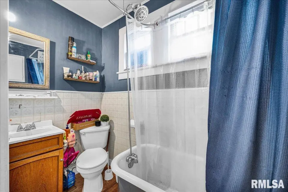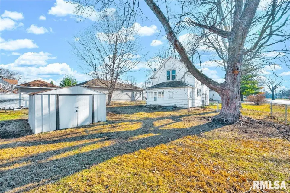 The inviting living room features original hardwood floors and base trim, complemented by updated paint, and flows nicely into the dining room, which also offers hardwood flooring. Just off the dining room, the kitchen has been partially updated with luxury vinyl plank flooring, an updated countertop and sink, and lighting. The main floor also includes a laundry room with vinyl flooring and built-in storage cabinets. Upstairs, you’ll find two bedrooms including the primary, both with hardwood floors and closet space, along with a full bathroom. The basement is unfinished but provides ample storage. Situated on a corner lot, this home offers a fenced backyard and includes a shed that will remain.