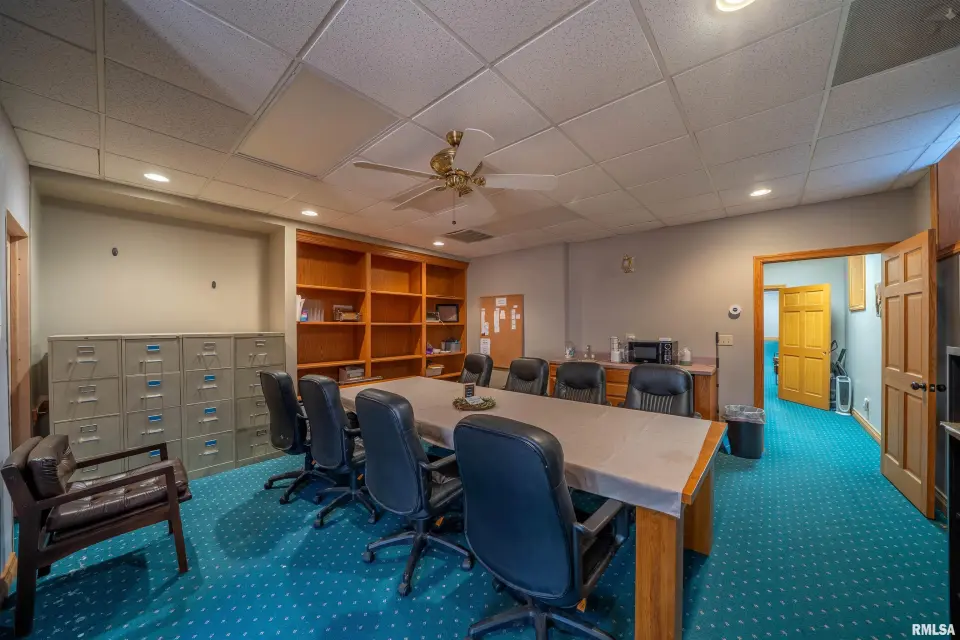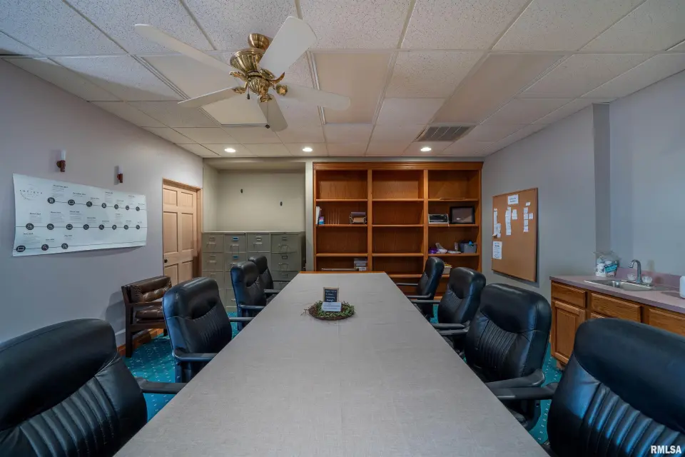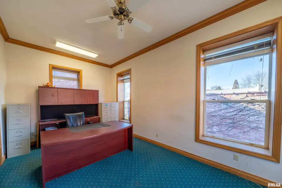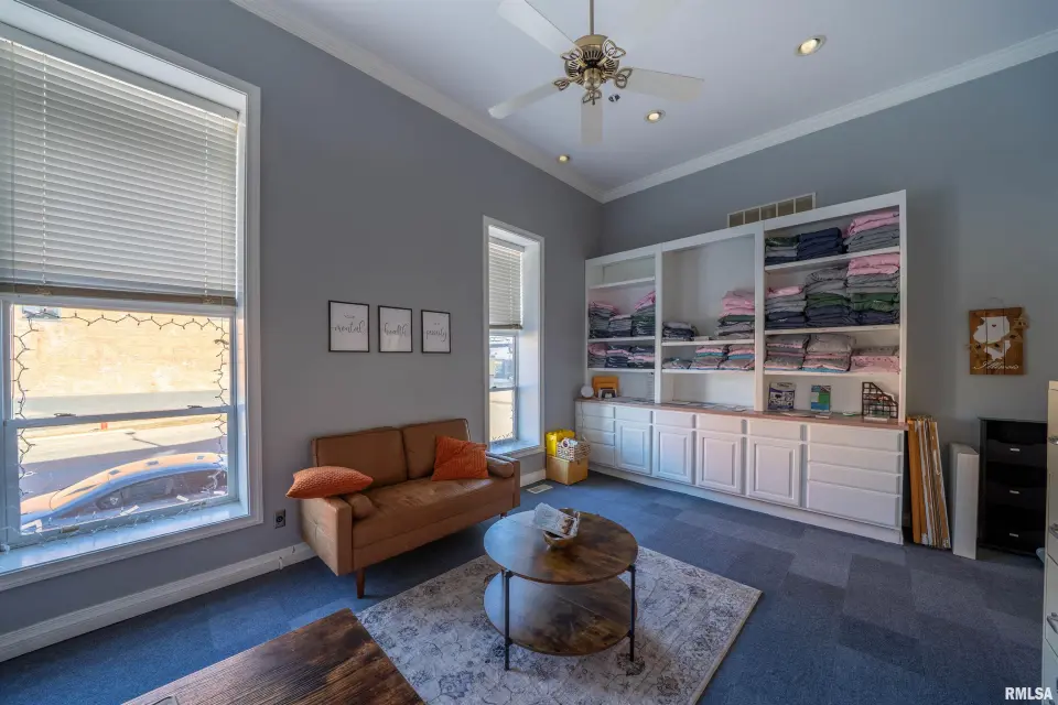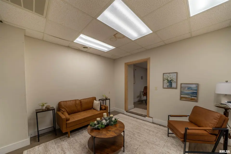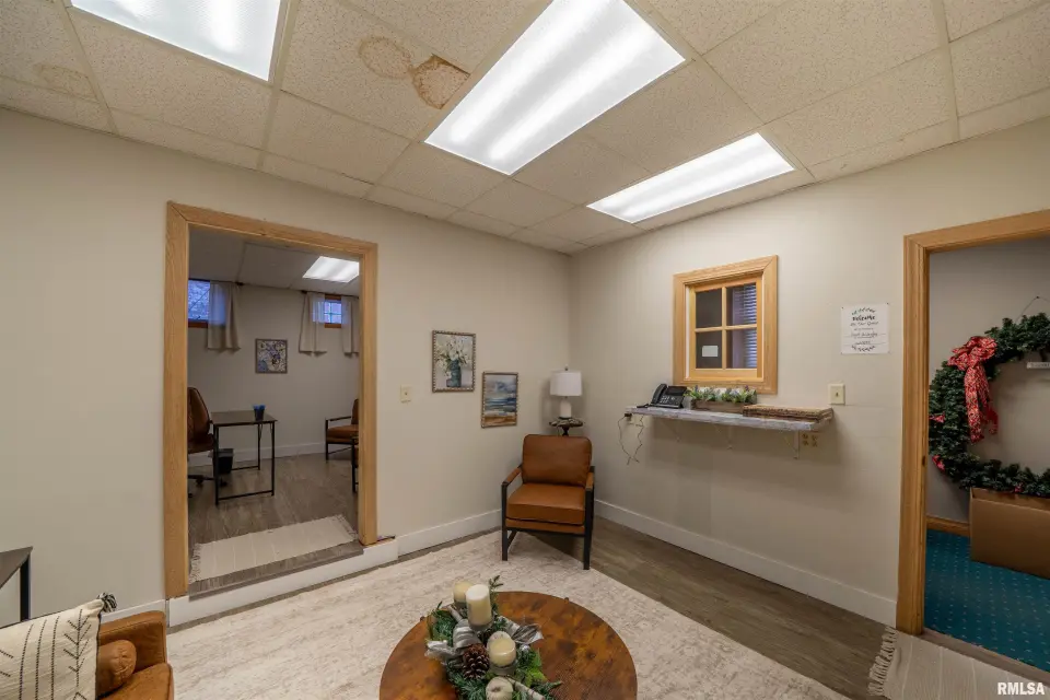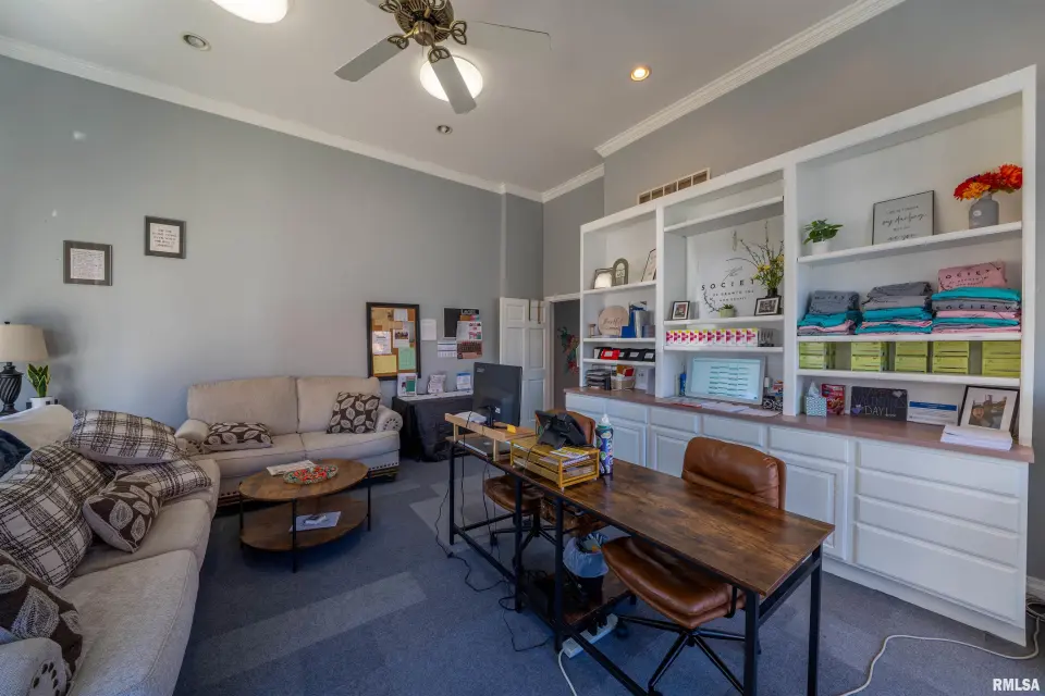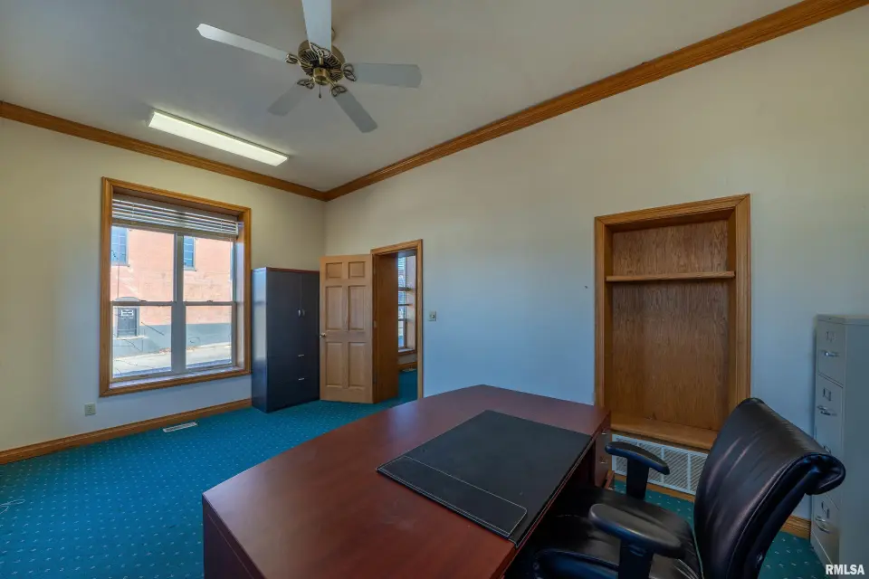 ft.): This high-visibility space features a private corner entrance and a 18'8" x 26'11" store/office area. It includes carpeted floors and a full wall of built-in shelving for displays. Suite 2 (Main Level Rear | 287.5 sq. ft.): Accessible via a handicap entrance, this unit offers two distinct rooms: a 12'4" x 12'2" space with durable vinyl plank flooring and a secondary 10'3" x 11'3" carpeted office. Suite 3 (Upper Level | 1,550.25 sq. ft.): A massive space featuring a stunning storefront window and an open interior staircase. The layout includes a front room (19'2" x 18'11"), a middle room (13'2" x 21'2"), and a large 19'4" x 27'1" room accessed by walking through the original bank safe. It also includes a private kitchenette, a full bath (7'11" x 5'11"), and a quiet 10'7" x 19' back office. Schedule your showing today!