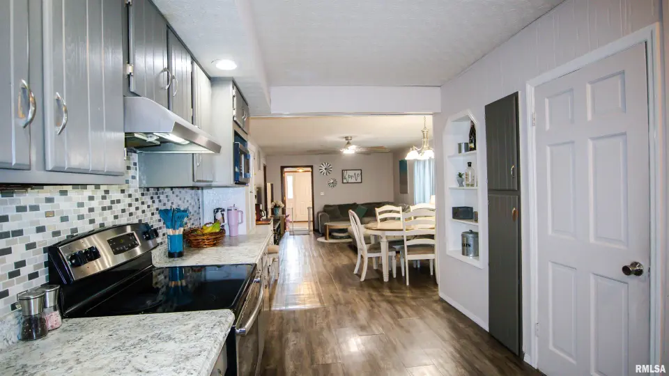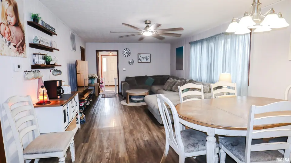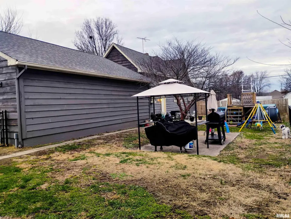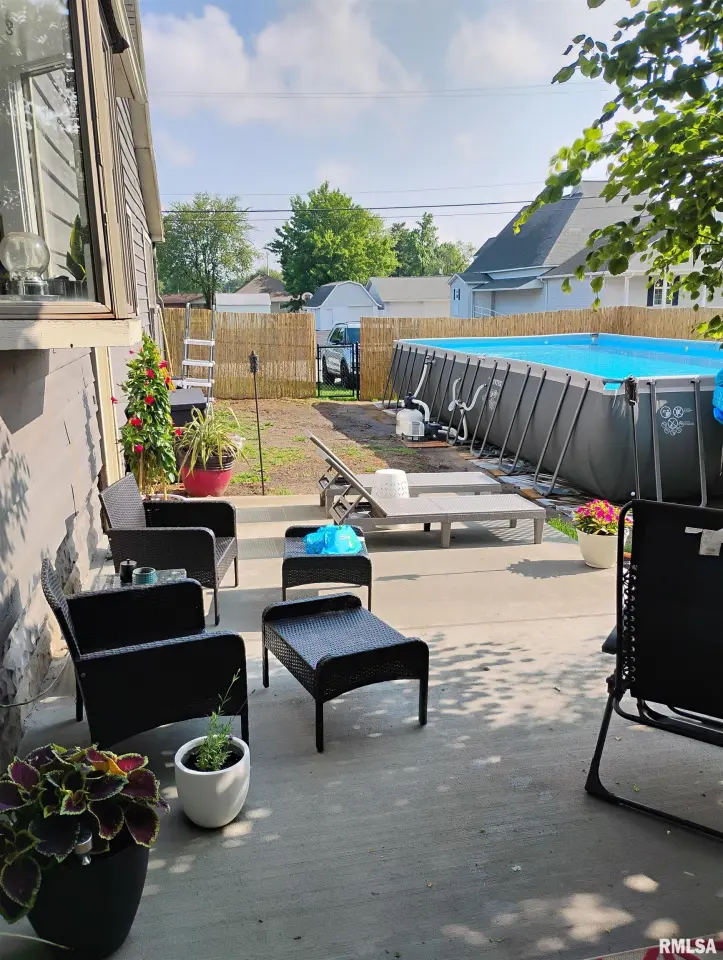 The exterior showcases attractive gray siding with contrasting trim, a welcoming covered front entry, and a fully fenced yard that creates defined and private outdoor areas. Inside, the home features an updated kitchen with ample cabinet storage, tile backsplash, stainless steel appliances, and durable flooring that flows seamlessly into the adjacent living spaces. Recent improvements include updated flooring, fresh paint, and thoughtful additions such as a new kitchen pantry, enhancing both style and everyday convenience. The finished lower level adds valuable additional living space, ideal for a recreation room, home office, hobby area, or guest use. This level has seen numerous recent updates, including new flooring, paint, doors, a newly added closet, and a new toilet. A dedicated laundry area with new washer and dryer provides added functionality, while updated electrical components contribute to peace of mind. Outdoor living is a highlight of this property. Recent improvements include a concrete patio perfect for entertaining, a fully fenced yard, and a saltwater pool added in 2025 for summer enjoyment. The detached outbuilding offers excellent versatility, featuring electric service and insulation—ideal for a workshop, hobby space, or additional storage. With an attached garage and additional storage options.