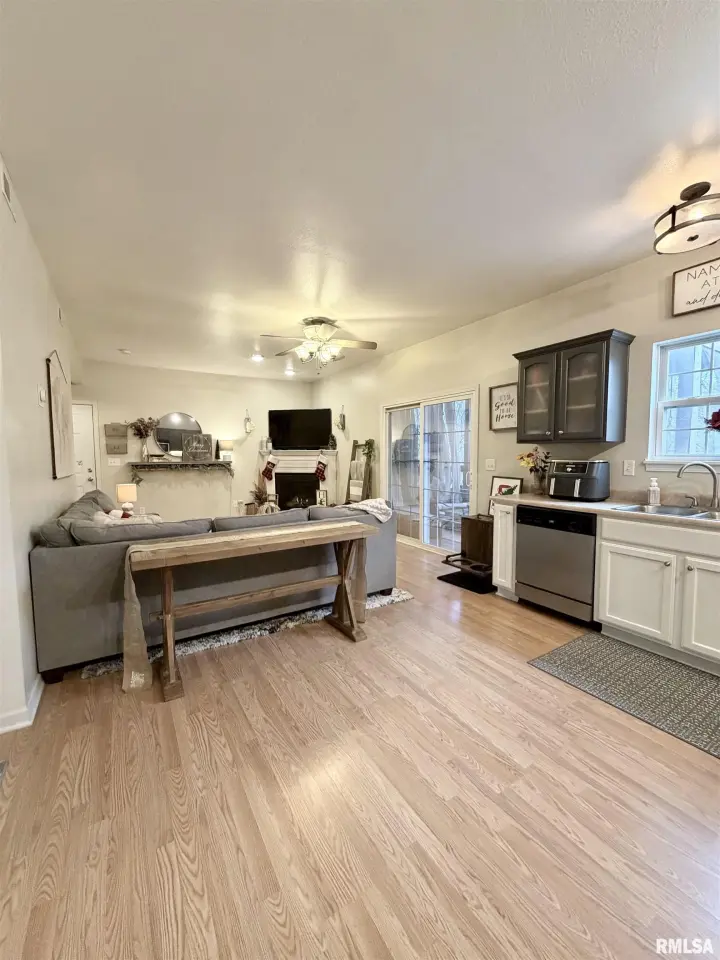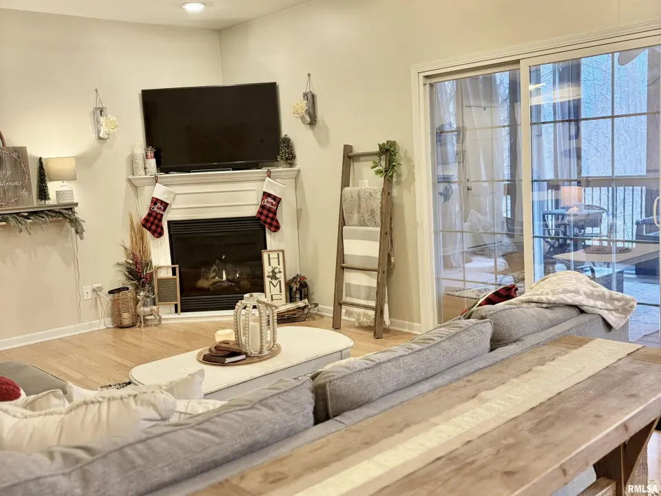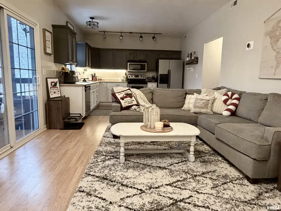 Neutral paint colors, sharp white trim, laminate wood flooring, updated cabinetry, and stainless appliances complement the open-concept design with soaring ceilings and a cozy gas-log fireplace. Just off the great room, a private screened porch overlooks mature trees, providing a beautiful wooded backdrop-perfect for relaxing, reading, or gathering with friends and family. This home offers 2 bedrooms and 2 full baths, including a primary suite featuring a tray ceiling, ample closet space, and private full bath. Additional highlights include a private garage, plus a dedicated laundry room! Lawn care, snow removal, and trash included in HOA! Don't miss this one! Call/text for your showing today!