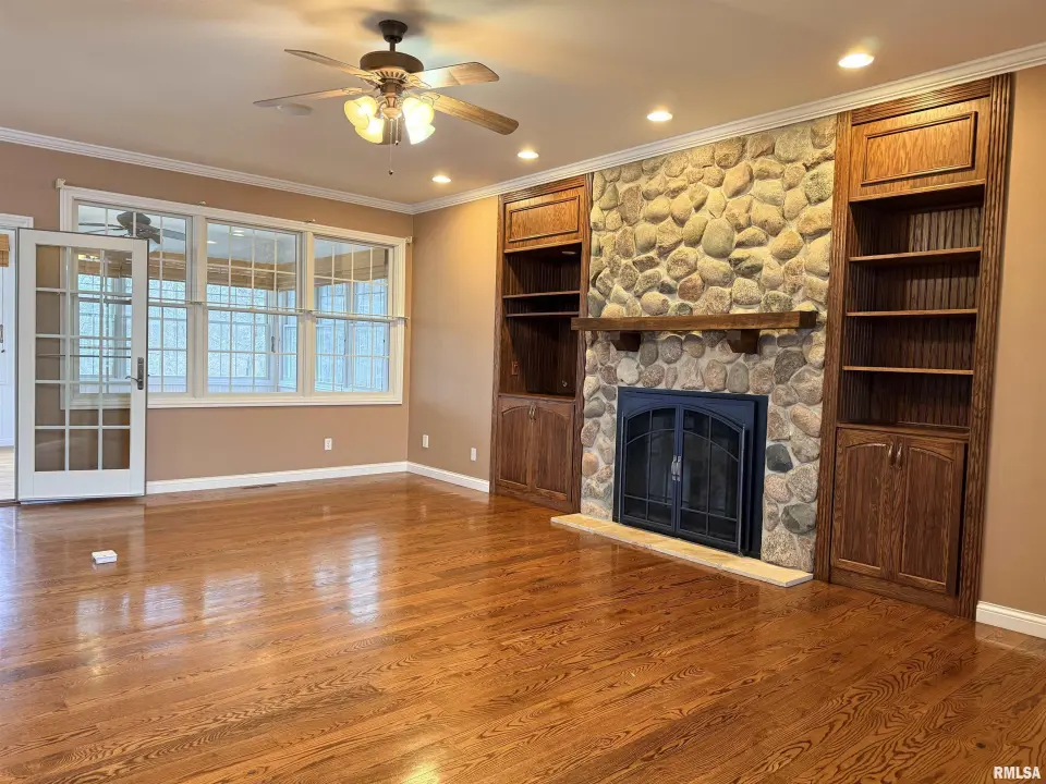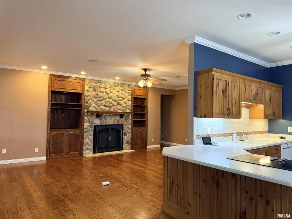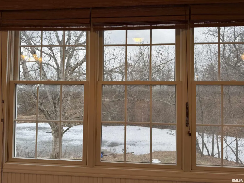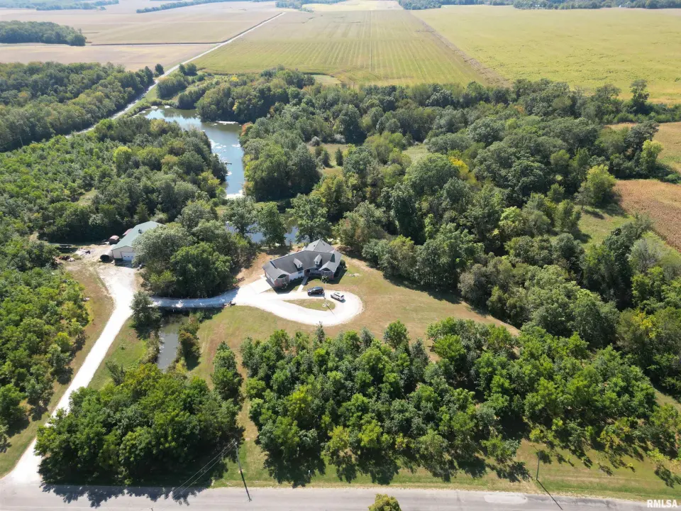 The home features 3 bedrooms and 3 bathrooms, beautiful hardwood floors, custom Amish-made kitchen cabinets, a whole-house central vacuum system, main-floor laundry, and an in-home stereo system. The living room showcases a stunning custom gas fireplace surrounded by built-in cabinetry, creating a warm and inviting gathering space. The primary suite includes a spacious en-suite bathroom with a separate shower and a jetted soaking tub. Off the dining room, a sunroom provides the perfect place to relax and soak in natural light while overlooking the lake. The basement is already roughed in for two additional bedrooms and a full bathroom, offering endless potential for future expansion. Outside, the property includes a 40x80 machine shed with 800 square feet of finished space ideal for a workshop. Enjoy fishing in the stocked lake or watching wildlife around the smaller minnow pond. The front yard is thoughtfully planted with a variety of trees, including oak, walnut, persimmon, and fruit trees. Unwind on the front porch swing and take in the peaceful surroundings as wildlife passes by. This one-of-a-kind property is truly waiting for you to make it home. All measurements are approximate and not guaranteed. Appliances and Solar panels not warranted.