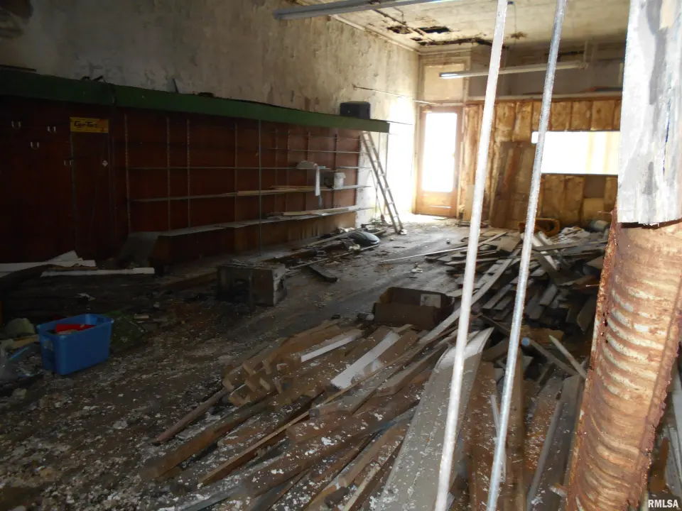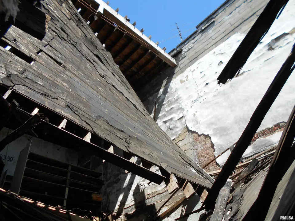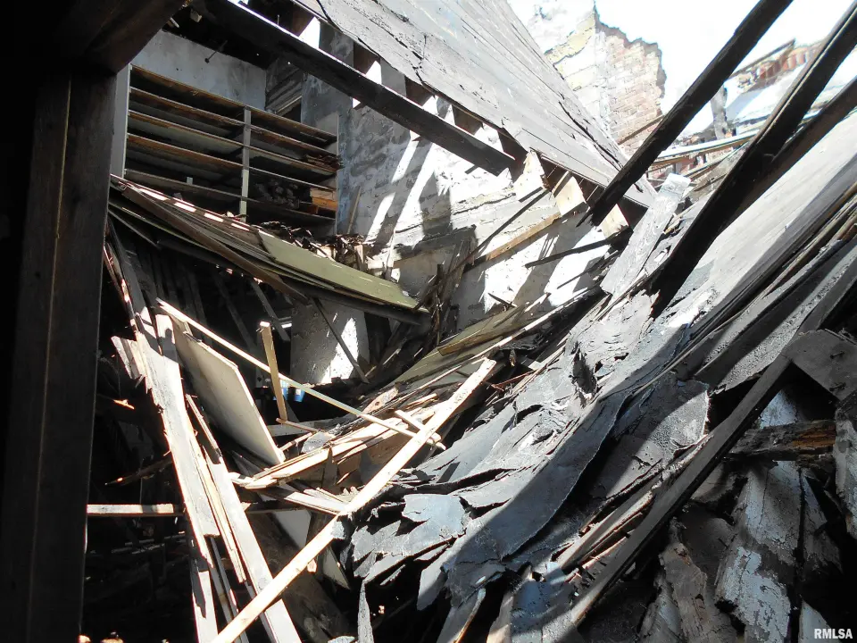Use caution when entering. Part of the roof and second floor have collapsed. Debris is scattered on the first floor.