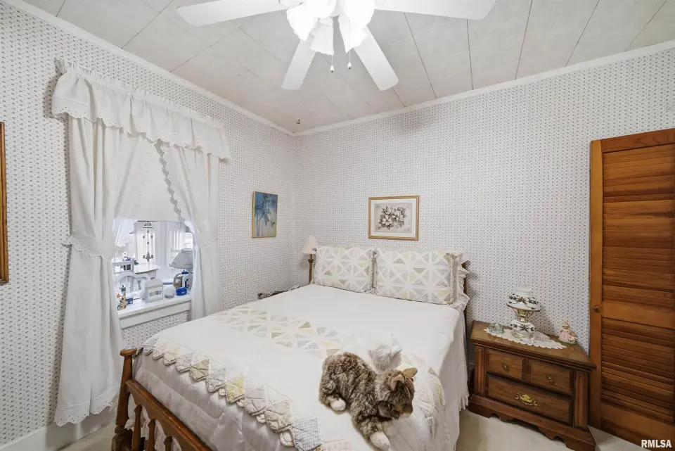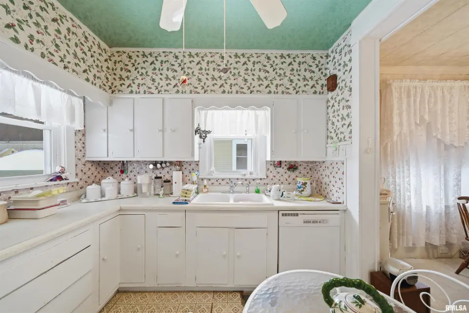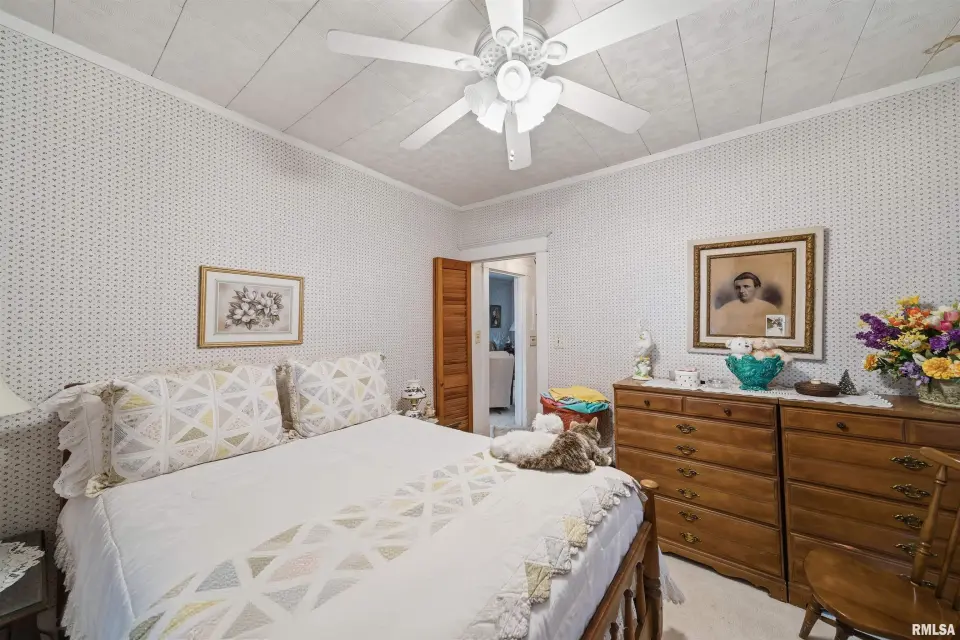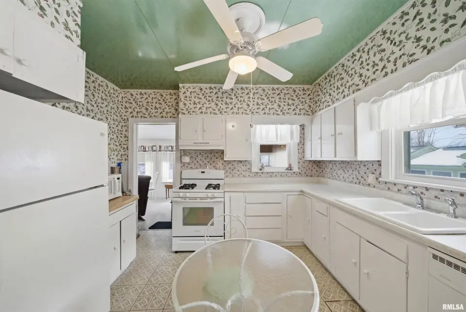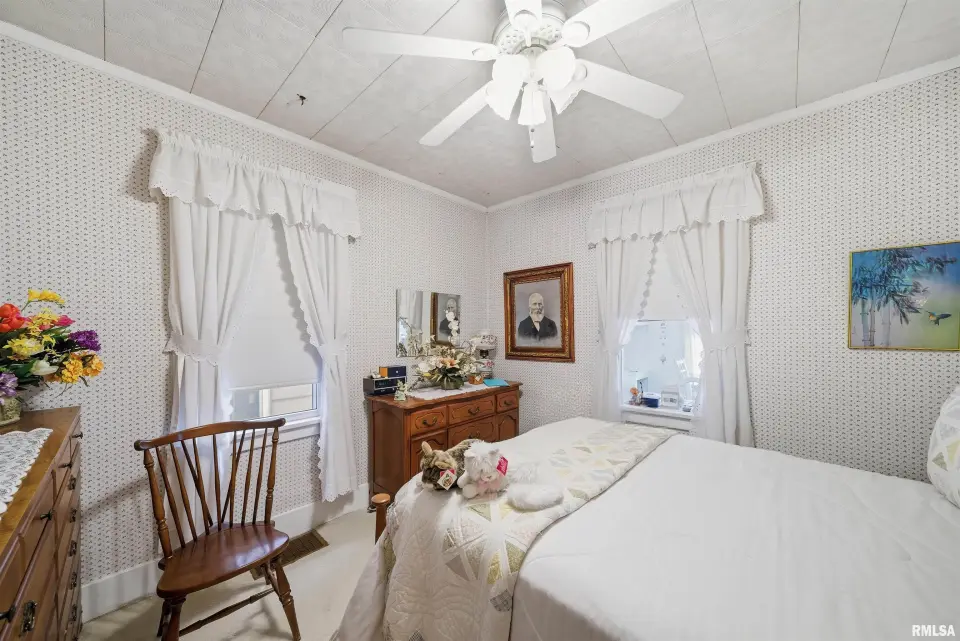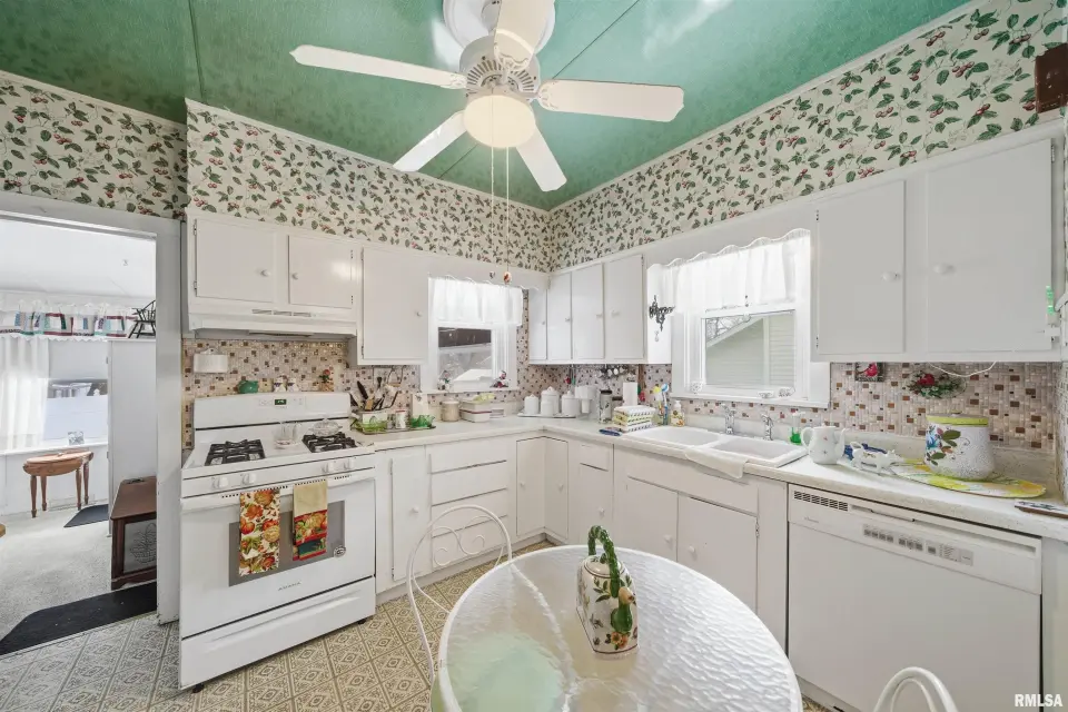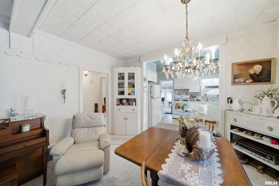 You will love the cozy enclosed porch for morning coffee and relaxing. Darling kitchen has eat in area plus additional informal dining space to host dinners. Full basement is currently set up as a 3rd bedroom (no egress) and offers a large storage room as well. Oversized garage features workshop and a door for alley access. Nice sized fenced yard with a patio to enjoy outdoor gatherings. Updates include: replacement windows, high efficiency furnace, sewer/water line. Come tour this home today!