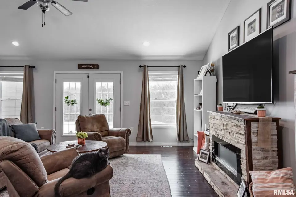 This private setting features mature trees, a scenic pond, and peaceful country views. Inside, the updated home offers vaulted ceilings, hardwood floors, a fireplace, and abundant natural lighting throughout, along with three bedrooms plus an office for added flexibility. A covered porch provides the perfect place to relax and enjoy the surroundings. Property includes a storm shelter for added peace of mind and plenty of space for outdoor enjoyment, gardening, or recreation. A rare opportunity to own acreage with privacy while remaining conveniently close to town.