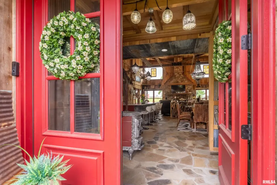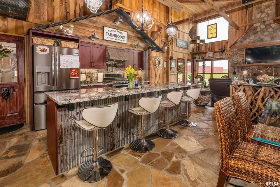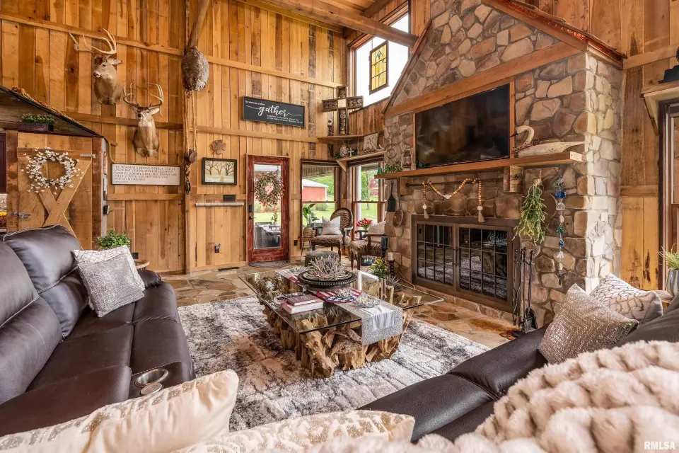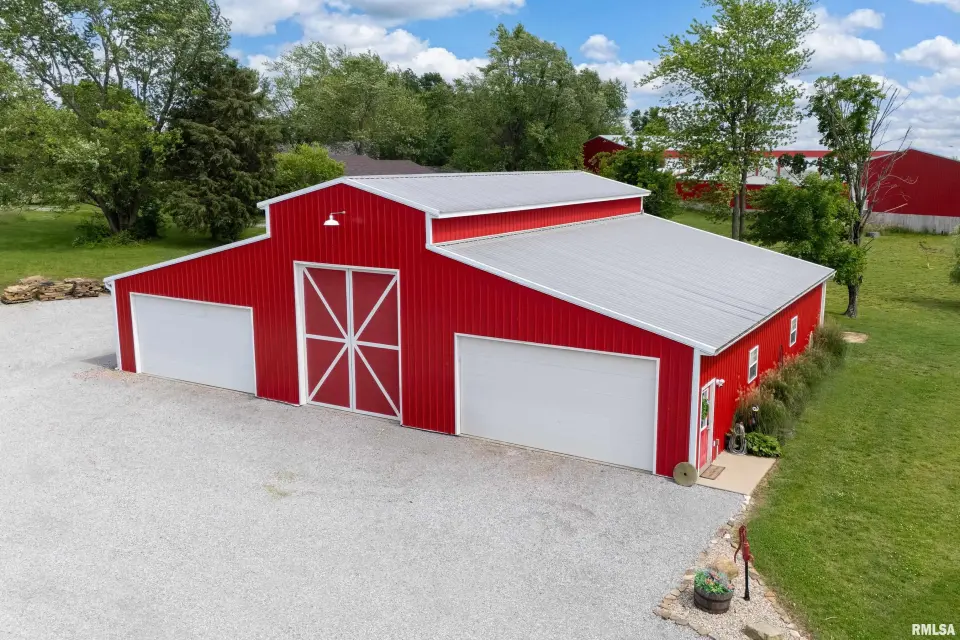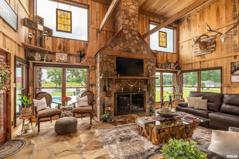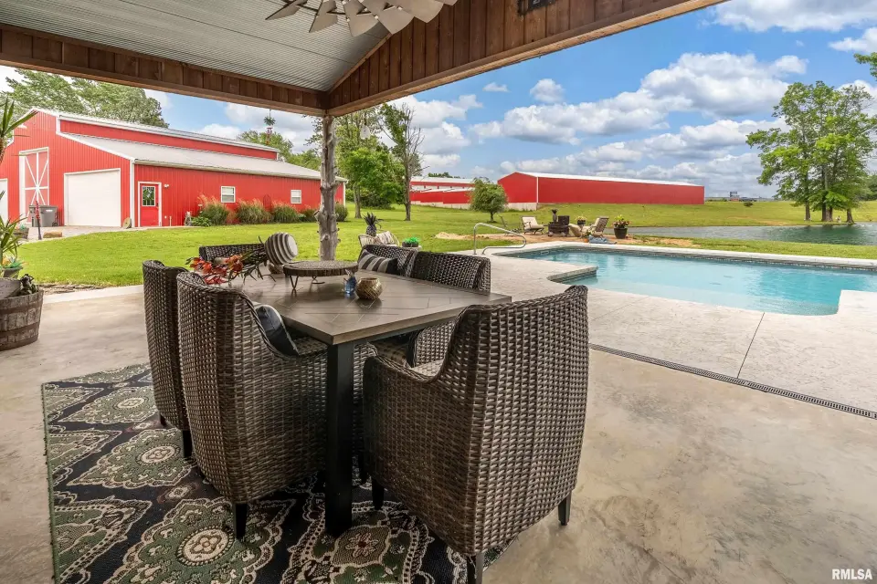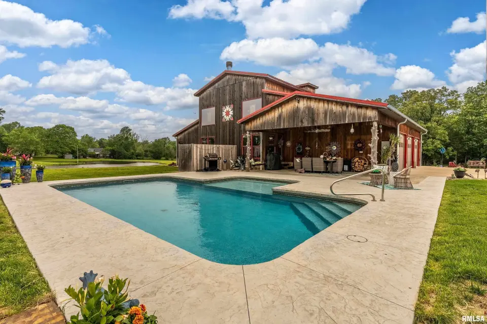 Inside you will find a sandstone wood-burning fireplace and granite surfaces. There are 3 bedrooms and 2.5 baths, plus a large loft as bonus space. The heart of this home is open-concept with an abundance of natural light. Outside the family room is a covered patio and an inground salt-water pool which was constructed in 2023. Beyond the pool deck is a stocked pond, complete with dock and custom fountain. The pole barn consists of 3 separate sections, two of which are heated and cooled. The center bay was built for RV parking, hosting an oversized door and a full hook-up. There is an additional RV hook-up outside. It is impossible to list all of the amenities this property offers. Come see for yourself!