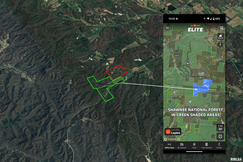 Comprised of 184 surveyed acres, this recreational land is surrounded by the Shawnee National Forest...over 13,000 acres of it. This tract is perfectly set up for trophy management and immediate use. The property features a dense, trail-laced timber block complemented by established food plots and room to expand your plantings. Enjoy year-round water sources with a stocked pond and Cooper Creek running through the acreage, drawing and holding game. Approximately 40 acres are currently being farmed, creating an immediate financial return. There is a silica mine located on this property, as photographed. This is a rare opportunity to secure a multi-faceted property that delivers cash flow, significant timber value, and a unique natural sanctuary. There are 2 barns, a detached garage, storage sheds, and a 2-bedroom manufactured home on this property. It is located approximately 20 minutes from Cape Girardeau, MO, and/or Jonesboro, IL. AN ADDITIONAL 75 SURVEYED ACRES WITH A 4-BED, 3-BATH LODGE, ADJOINING, IS AVAILABLE. See the listing for 2196 Wilderness Retreat, Jonesboro, IL.