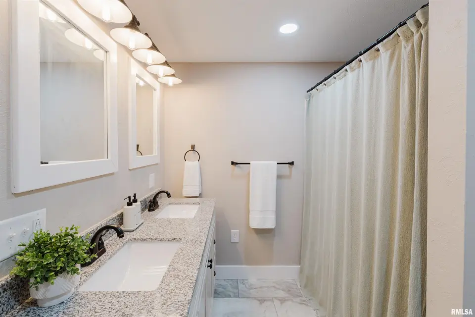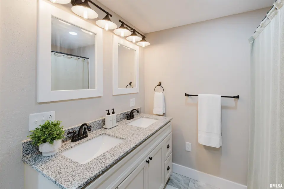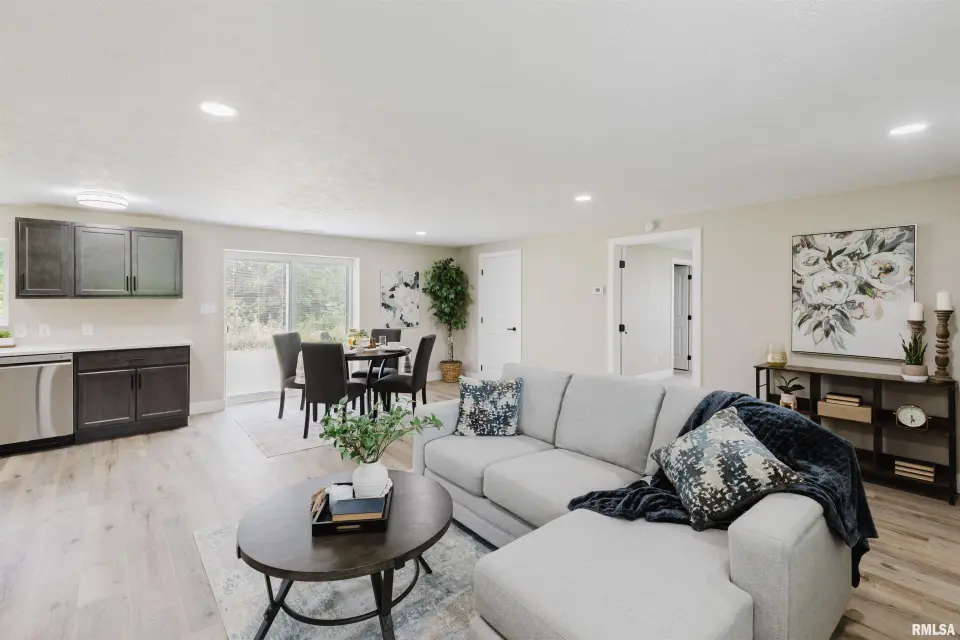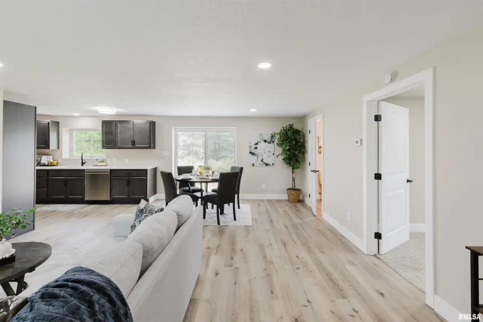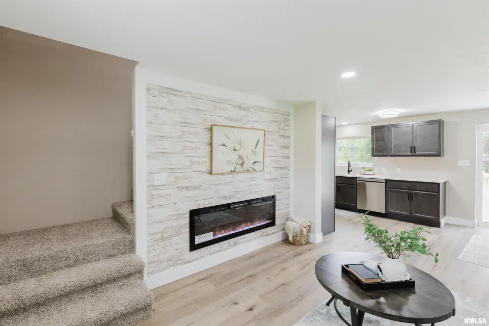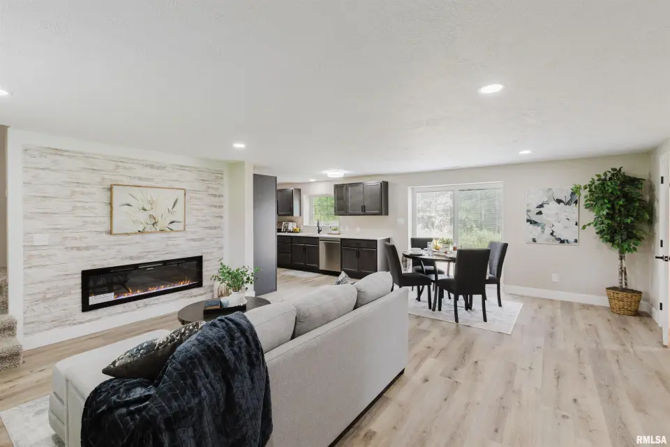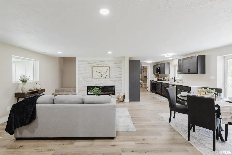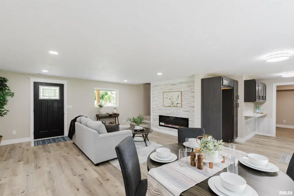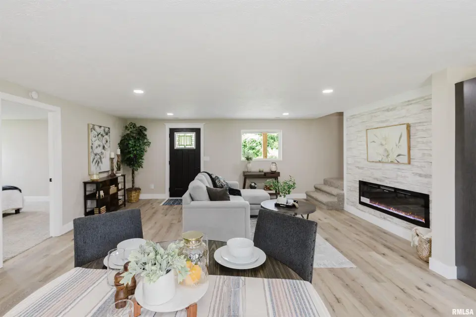 The updates create a clean, modern feel while maintaining a functional floor plan suited for everyday living. A covered front porch welcomes you into the main living area, where an electric fireplace anchors the space and provides a natural gathering point. The kitchen has been fully updated with new cabinetry, hard-surface countertops, and stainless steel appliances, offering ample workspace and storage. The primary bedroom is conveniently located on the main level and includes an attached sitting area along with additional flex space suitable for a variety of needs. A walk-in closet and private full bathroom complete the suite. A half bath and main-level laundry add convenience and practicality to the first floor. Upstairs, a spacious family room separates two generously sized bedrooms positioned on opposite ends of the home, along with a full bathroom. The upper level provides additional living space while maintaining separation between sleeping areas and gathering areas. In addition to the interior renovations, the home features solid concrete exterior construction, offering long-term durability and structural integrity. With updated finishes, multiple living areas, and a flexible design, this property provides space to accommodate a variety of needs.