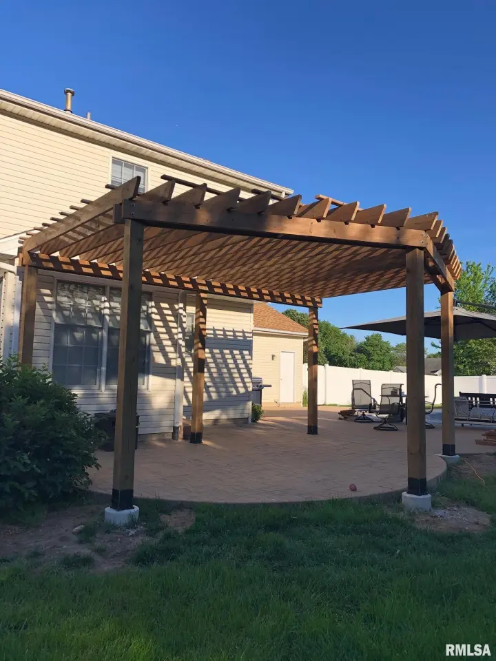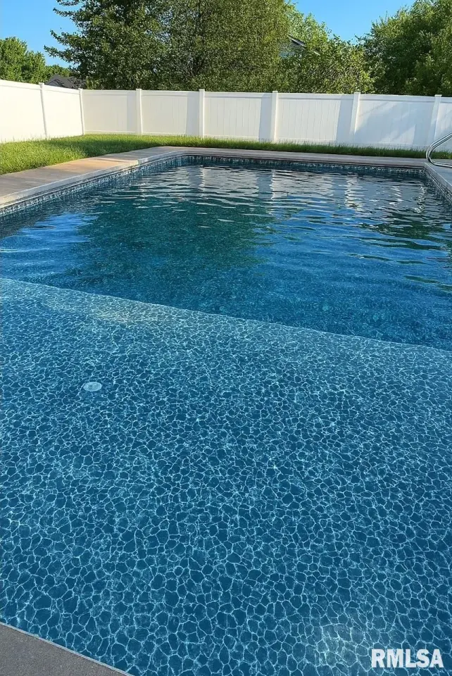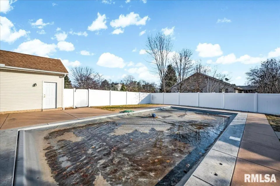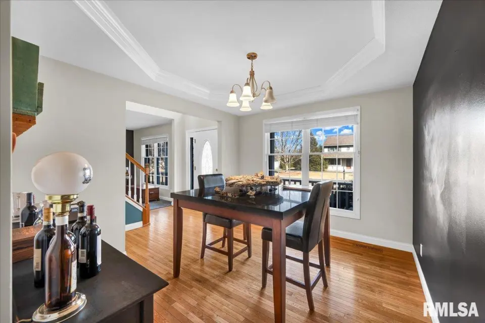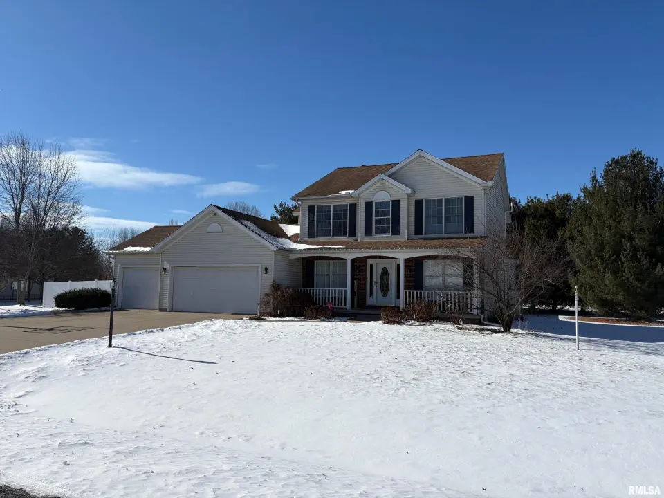 From there you will see a formal living room featuring newer carpet. The spacious family room also has newer carpet, and offers an updated hearth and mantle to go along with the cozy gas log fireplace. The kitchen has hardwood floors, granite countertops, a stylish backsplash, and newer dishwasher (2025). The formal dining room adds elegance with a tray ceiling and hardwood flooring. The main level also includes a half bath, a laundry room, and access to the spacious 3-stall garage. Upstairs you’ll find a spacious primary suite with tub, separate shower, dual vanities, and updated vanity/countertop, plus three additional bedrooms and another full bathroom. The partially finished basement adds extra living space with a built-in bar, rec room, another full bathroom, and an office. Enjoy the backyard oasis with a large fenced yard, heated inground pool (2016) with auto cover, jets, and bubbler, plus a large patio, newer pergola, and shed/1 stall detached garage. Major updates include roof (2013), interior paint (2022), water heater (2015), well pump (2019), septic cleaned (7/24) with new ejector pump.