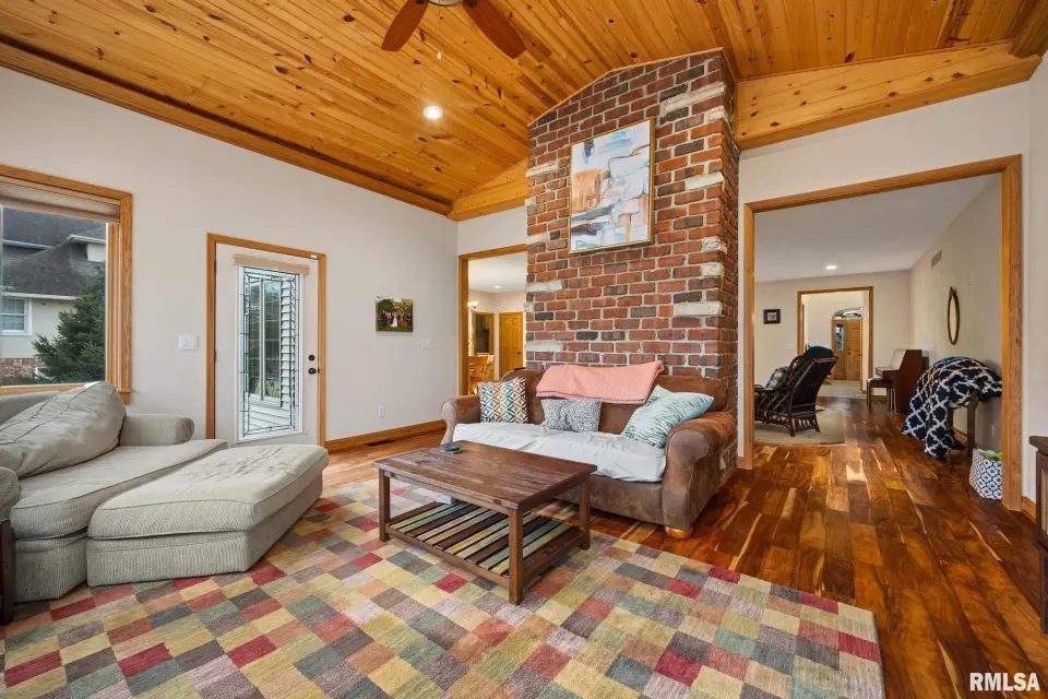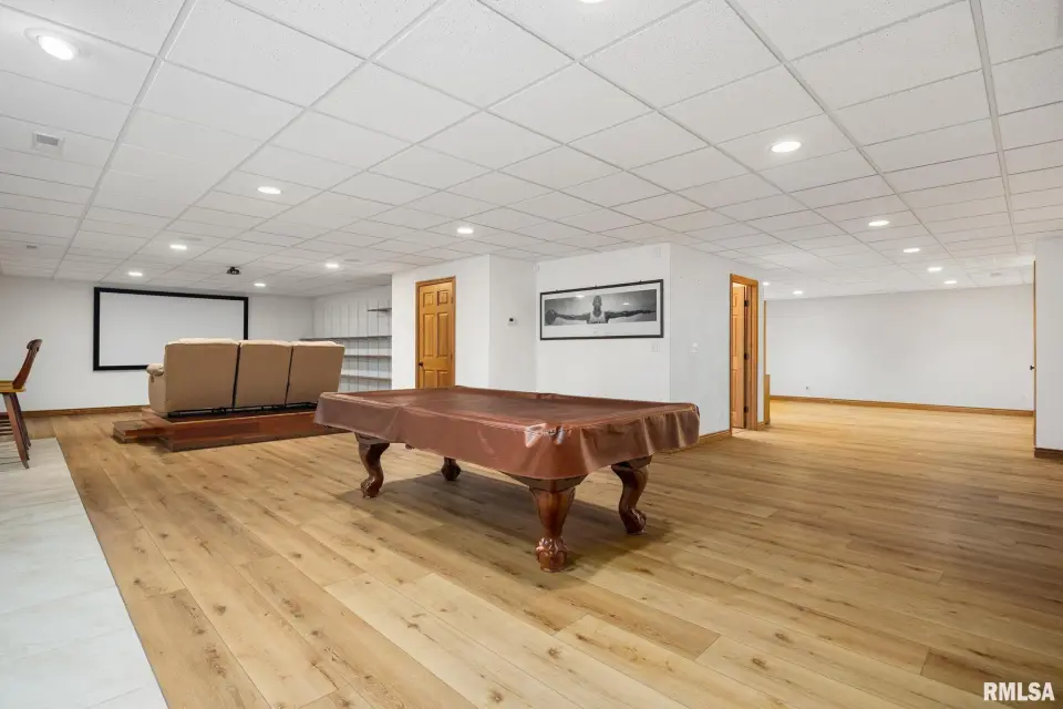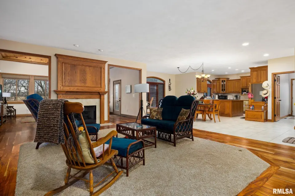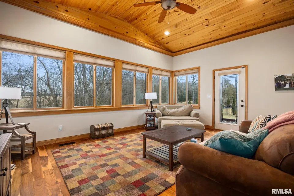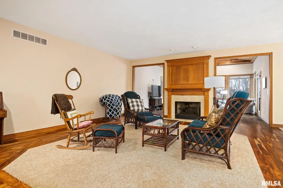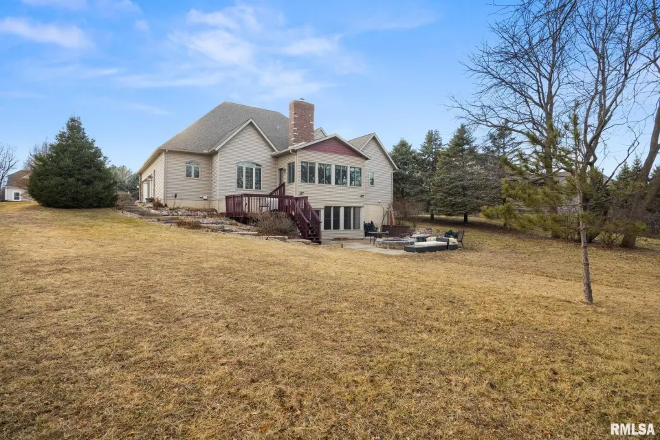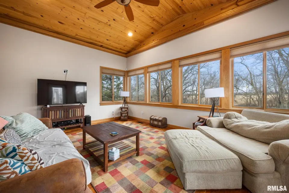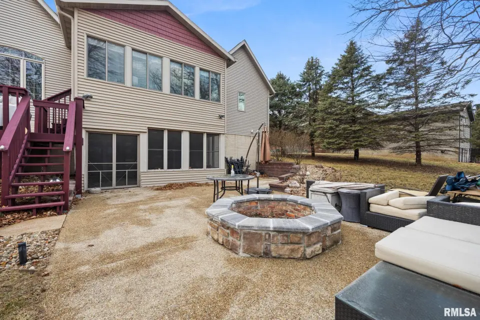 Enjoy 3 total fireplaces, including one in the expansive main floor primary suite with vaulted ceiling, walk-in closet, and spa-like bath with sauna, double sinks, and tiled walk-in shower. A Jack & Jill bath connects to a main floor bedroom/office. Upstairs are 2 bedrooms with another Jack & Jill bath and great closet space. The full finished basement includes a large possible 5th bedroom (no window), full bath, full bar with dishwasher, theater area, rec room, and 2 walkouts to a screened porch under the 4-Season room. Outside features a large patio, fire pit, and 3-stall garage. Spacious laundry/mudroom, and excellent storage throughout. A must-see home for entertaining and comfort! Furniture to stay in the home: basement entertainment center & pool table, office safe & bookcase, basement kitchen appliances stay as well. Updates include; Heat exchanger 2023, A/C unit 2019, and roof 2017, gas water heater 2016.