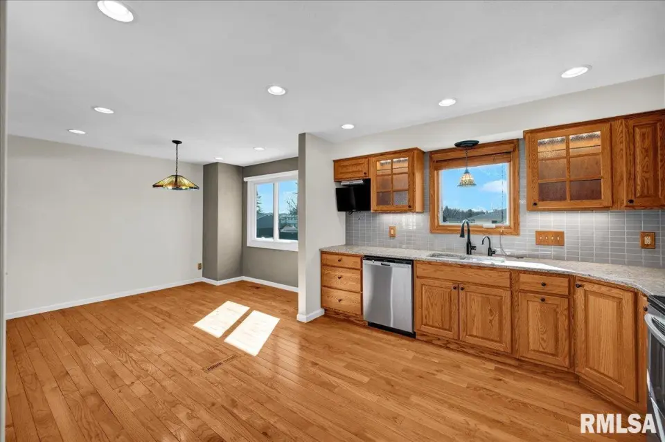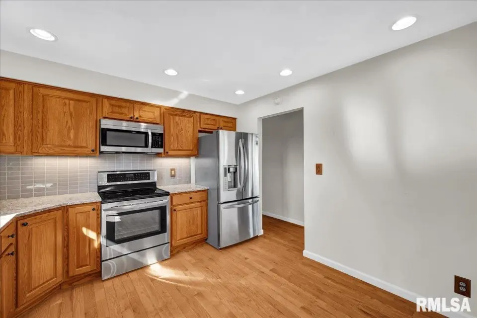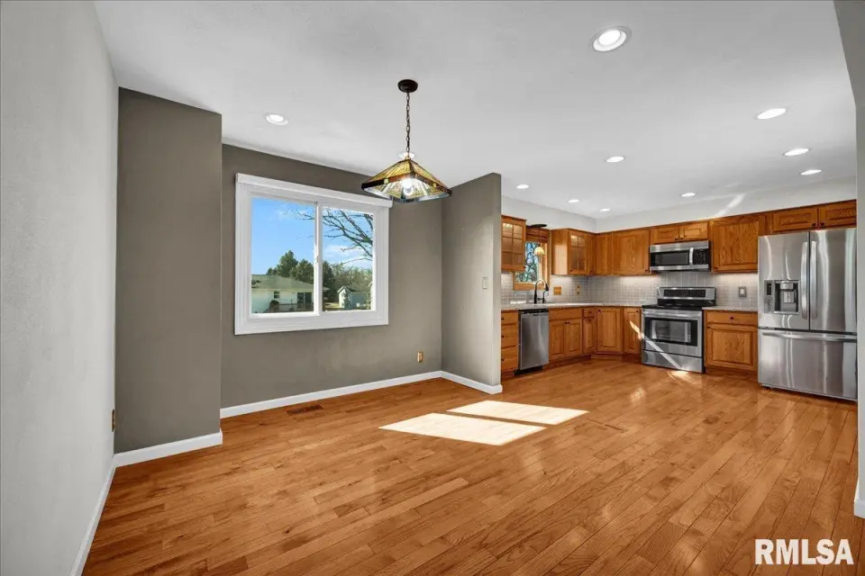 The updated kitchen boasts solid-surface countertops, modern cabinetry, and sleek appliances, while hardwood floors run throughout the main living areas. Downstairs, the cozy family room features a wood-burning fireplace (currently closed off) and opens via newer French doors to the backyard. Outside, you’ll find a partially fenced yard and a large storage shed—perfect for extra space. With updated windows, a newer roof, under-cabinet kitchen lighting, power window shades, and newer concrete on the driveway and patio, this home offers both comfort and convenience, just minutes from Peoria’s amenities.