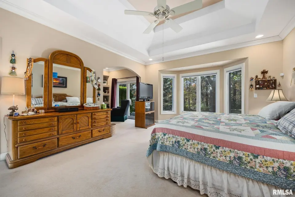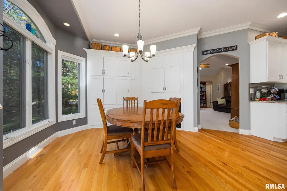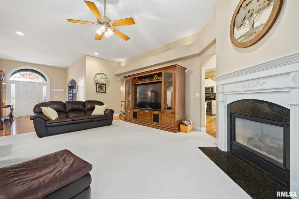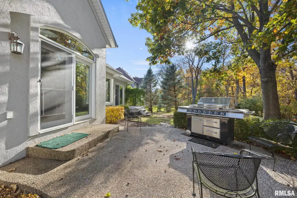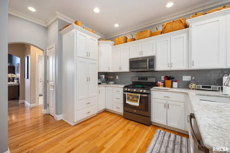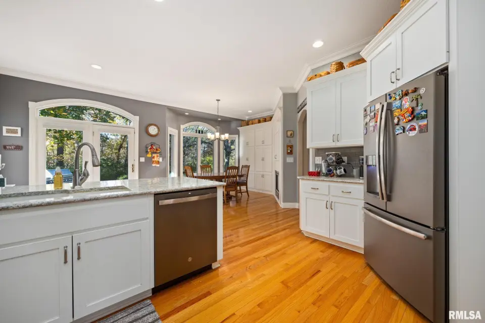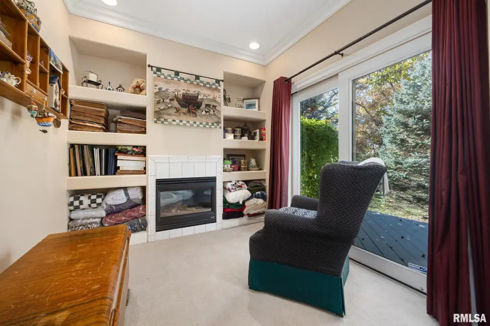 The spacious great room offers a tray ceiling, a see-through fireplace, and French doors that open to a versatile office or second bedroom. The beautifully updated kitchen boasts white cabinetry, quartz countertops, slate appliances, and a generous dining area with a wall of custom cabinets and a cozy fireplace. Sliding doors lead to a patio overlooking a private, wooded backyard, perfect for relaxing or entertaining. Additional features include a pantry closet and a convenient roll-out pantry cabinet. The primary suite is a true retreat, offering a sitting area with fireplace, office space, and access to a private deck. The luxury bath includes double sinks, a jetted tub framed by elegant columns, and a separate shower and toilet room. A main-floor laundry room with cabinetry and a deep sink adds everyday convenience. The finished basement expands your living space with a family room featuring a built-in bar, custom built-ins, a large rec/flex room with egress window, a full bath, and two storage rooms. This home blends comfort, elegance, and functionality, inside and out.
