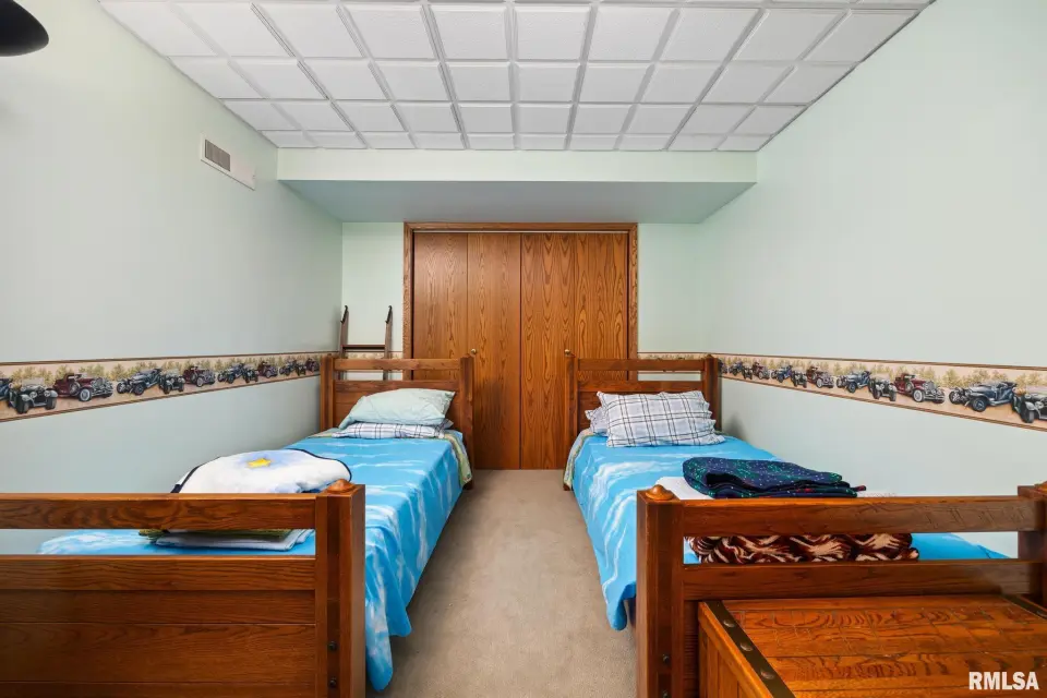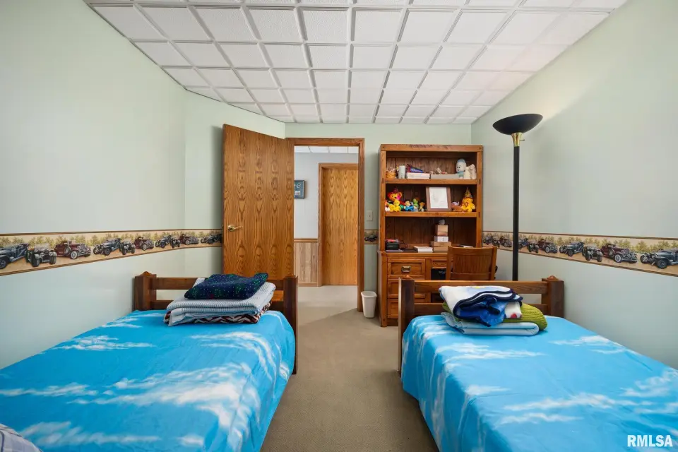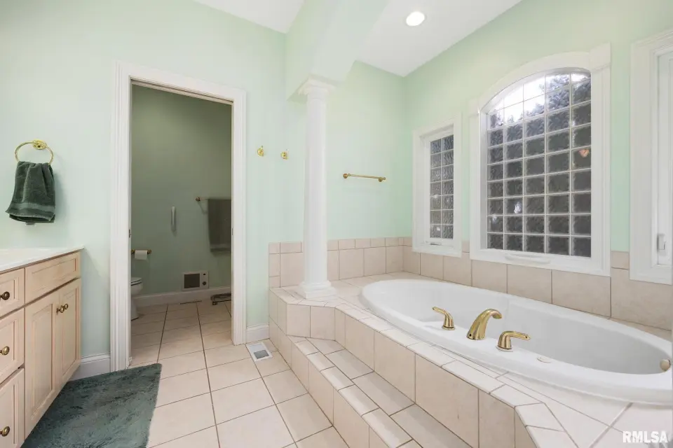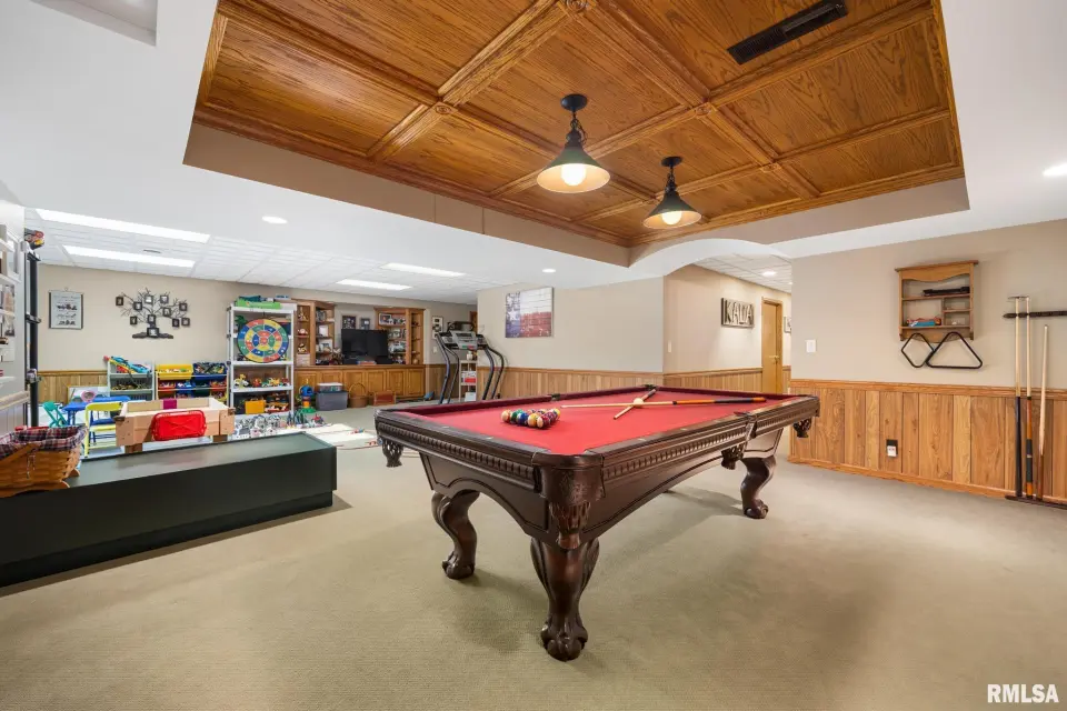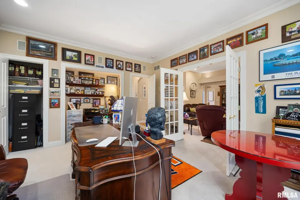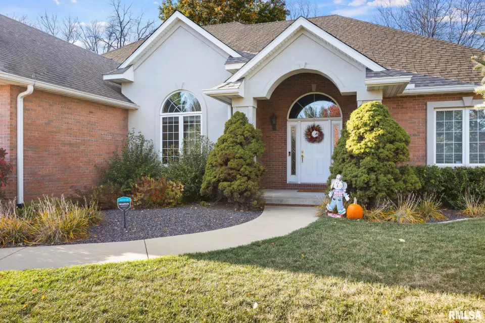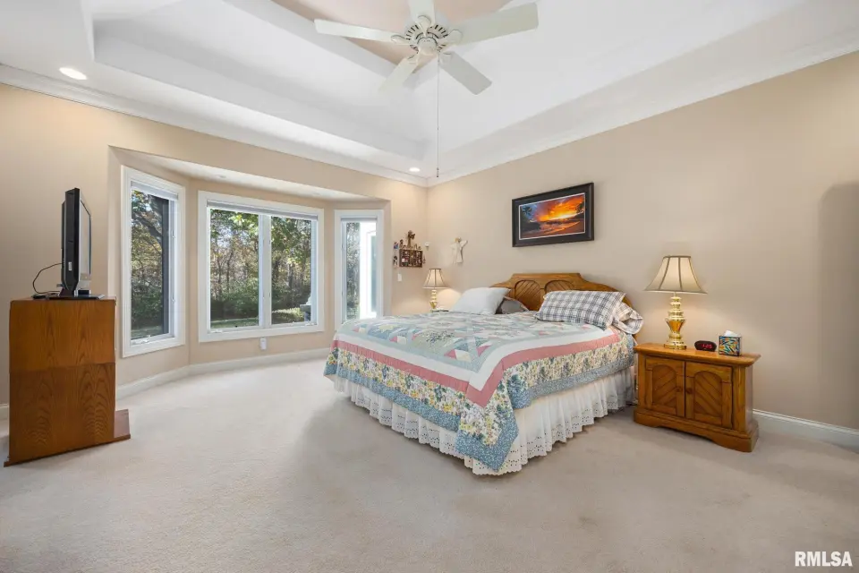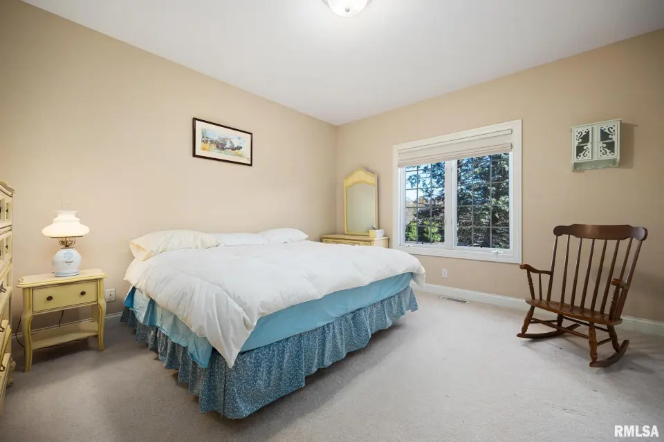 The spacious great room offers a tray ceiling, a see-through fireplace, and French doors that open to a versatile office or second bedroom. The beautifully updated kitchen boasts white cabinetry, quartz countertops, slate appliances, and a generous dining area with a wall of custom cabinets and a cozy fireplace. Sliding doors lead to a patio overlooking a private, wooded backyard, perfect for relaxing or entertaining. Additional features include a pantry closet and a convenient roll-out pantry cabinet. The primary suite is a true retreat, offering a sitting area with fireplace, office space, and access to a private deck. The luxury bath includes double sinks, a jetted tub framed by elegant columns, and a separate shower and toilet room. A main-floor laundry room with cabinetry and a deep sink adds everyday convenience. The finished basement expands your living space with a family room featuring a built-in bar, custom built-ins, a large rec/flex room with egress window, a full bath, and two storage rooms. This home blends comfort, elegance, and functionality, inside and out.