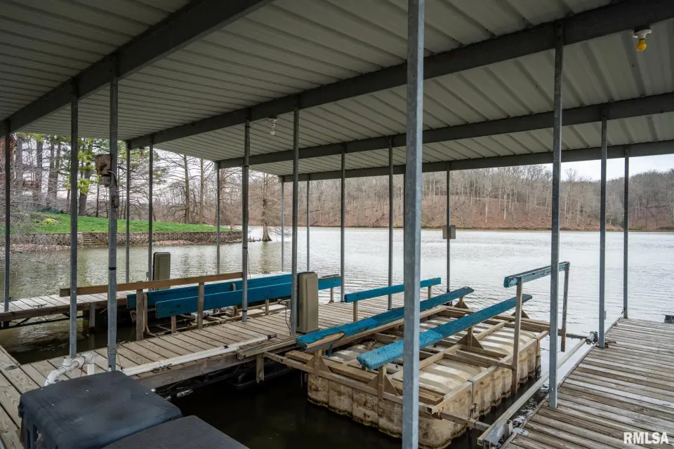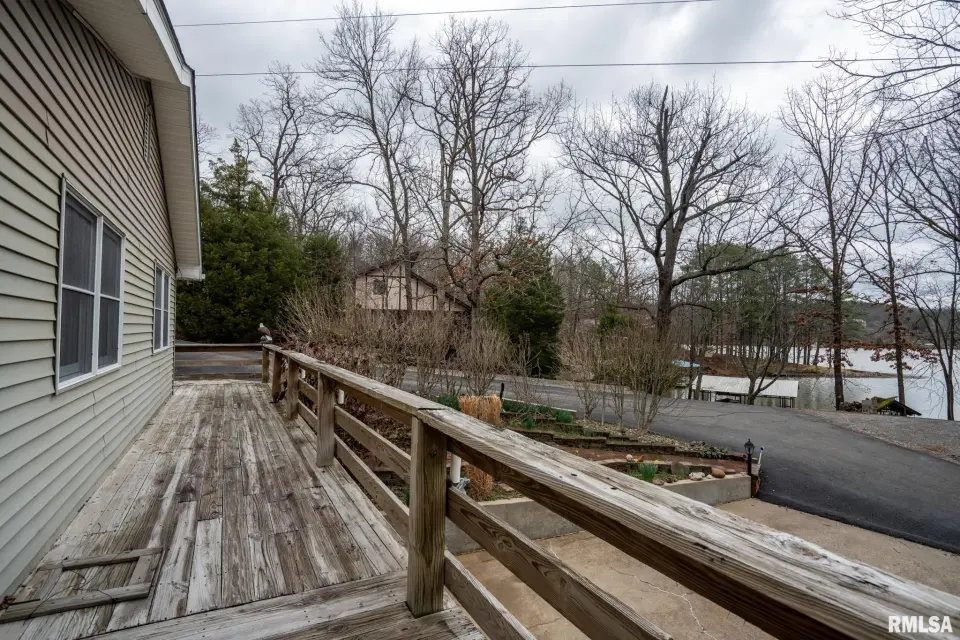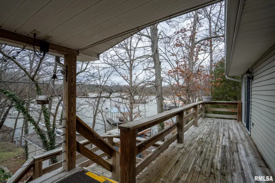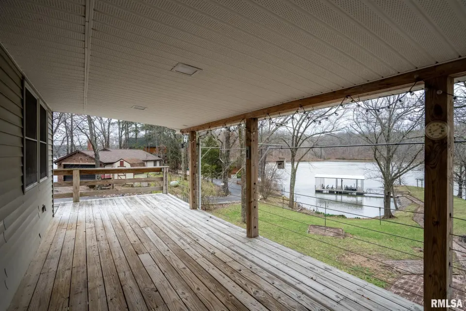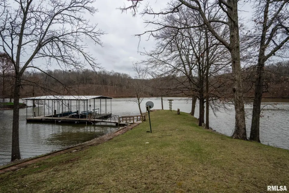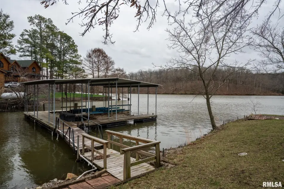 Tucked into a quiet private cove, this property sits on its own peninsula of shoreline in Eagle Point Bay, providing stunning water views from nearly every angle and a peaceful setting perfect for relaxing or entertaining. The home features 3 bedrooms, 3 bathrooms, and nearly 2,500 square feet of finished living space with 1,248 sq ft on the main level and 1,236 sq ft on the walkout lower level. A spacious wraparound deck overlooks the lake, creating the perfect place to enjoy morning coffee, sunset dinners, and lake life at its best. Designed with versatility in mind, the home includes two kitchenettes—one on each level, making it ideal for short-term rental potential or separate upper and lower living spaces. Short-term rentals are allowed, offering excellent opportunities for investment income or hosting guests. Step outside to your covered two-slip boat dock, perfectly positioned in the protected cove for easy lake access and calm water. Additional highlights include a 520 sq ft garage, cellar space for storage and storm safety, and a shed with electricity. Major improvements provide peace of mind, including a new roof in 2020 and central HVAC systems installed in 2021. Whether you're looking for a private lake retreat, full-time residence, or income-producing lake property, this Lake of Egypt gem offers a unique combination.