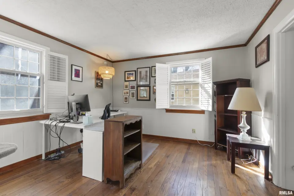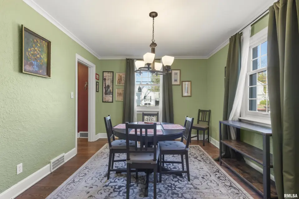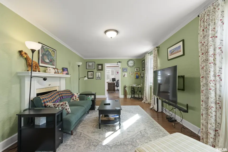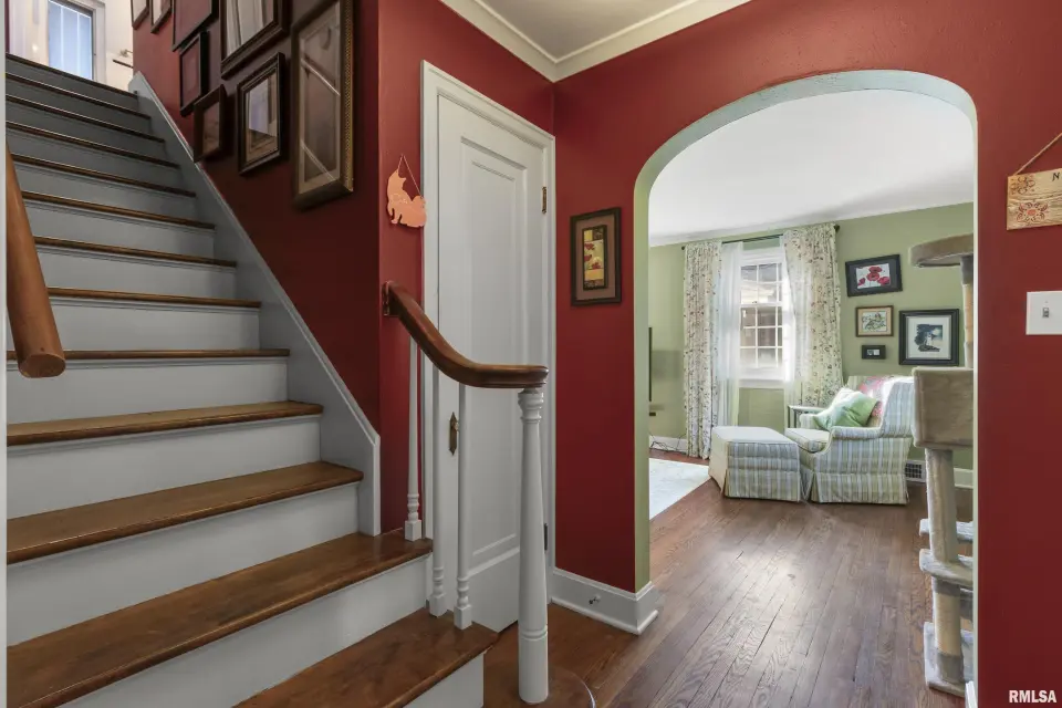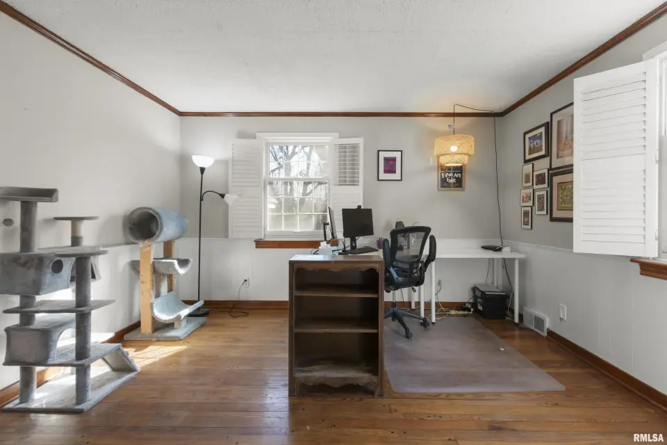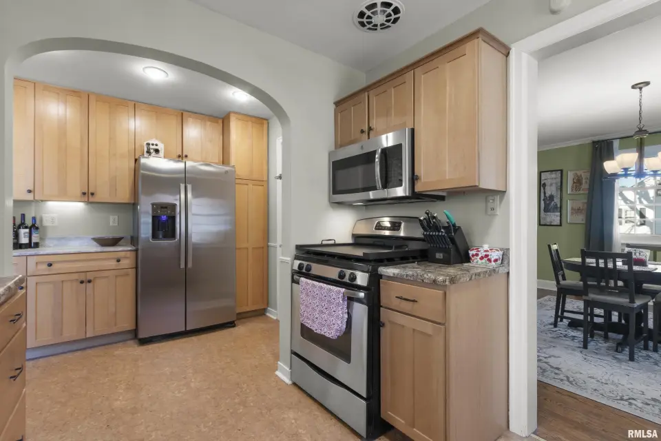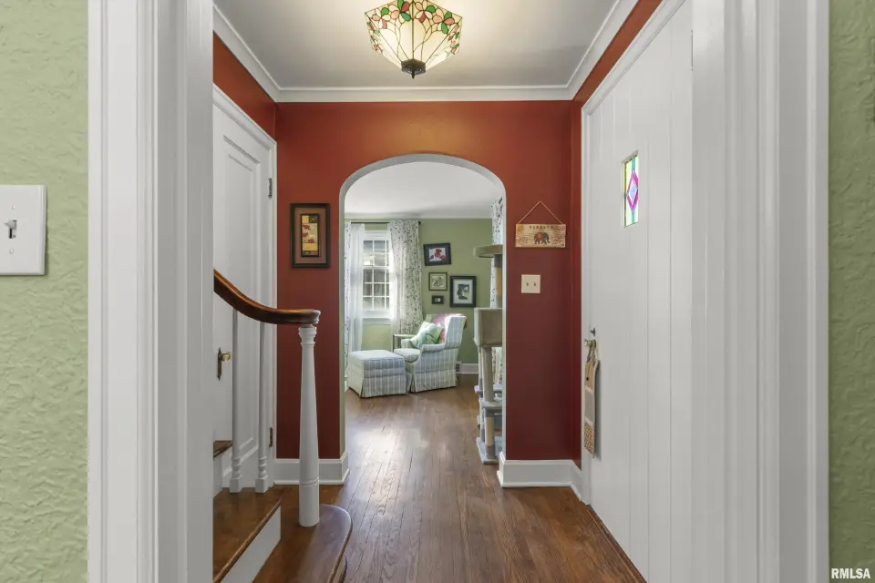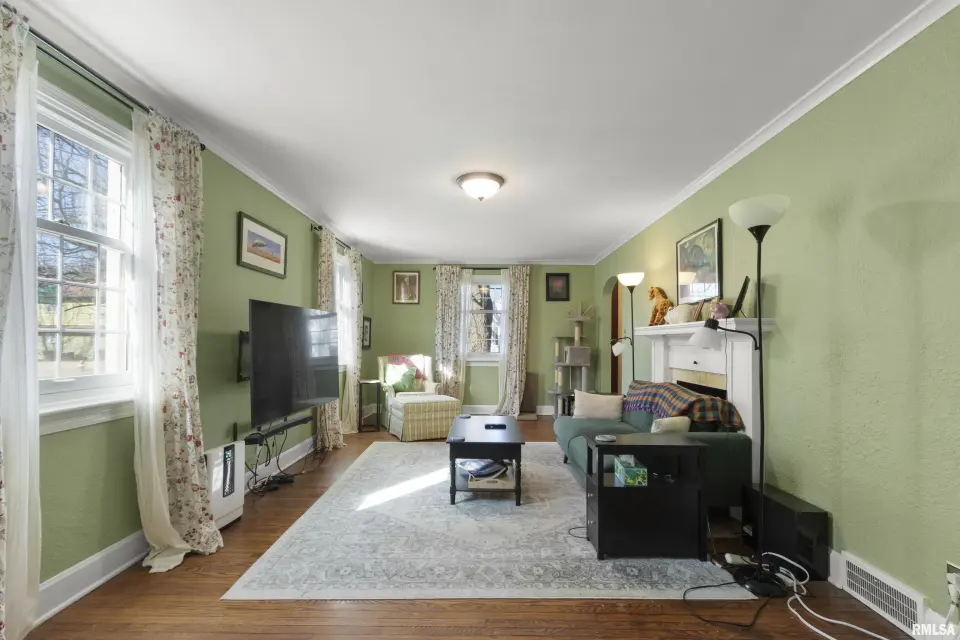 The living room is warm and inviting with plenty of space to spread out and relax. Just off the living room is a great bonus space that works perfectly as a home office, hobby room, workout area, or playroom—whatever life calls for. Nearby you’ll find a convenient powder room and a thoughtfully updated kitchen featuring cork floors and generous counter space. The kitchen opens to a formal dining room that connects back to the front entry, creating a layout with excellent flow throughout the main level. Upstairs you’ll find three well-sized bedrooms, charming dormer windows that create cozy nooks, and an updated full bath. Each bedroom offers hardwood floors and surprisingly generous closet space. The finished basement expands the living space even further with a large family room, a second full bath, laundry area with utility sink, and additional storage. Outside, the backyard feels like its own private retreat with mature trees, established landscaping, multiple brick patio areas, and a covered patio off the one-car garage—perfect for relaxing or hosting on warm evenings. Conveniently located in the heart of Peoria with easy access to key roadways, this home blends classic charm, practical space and everyday comfort in all the right ways!