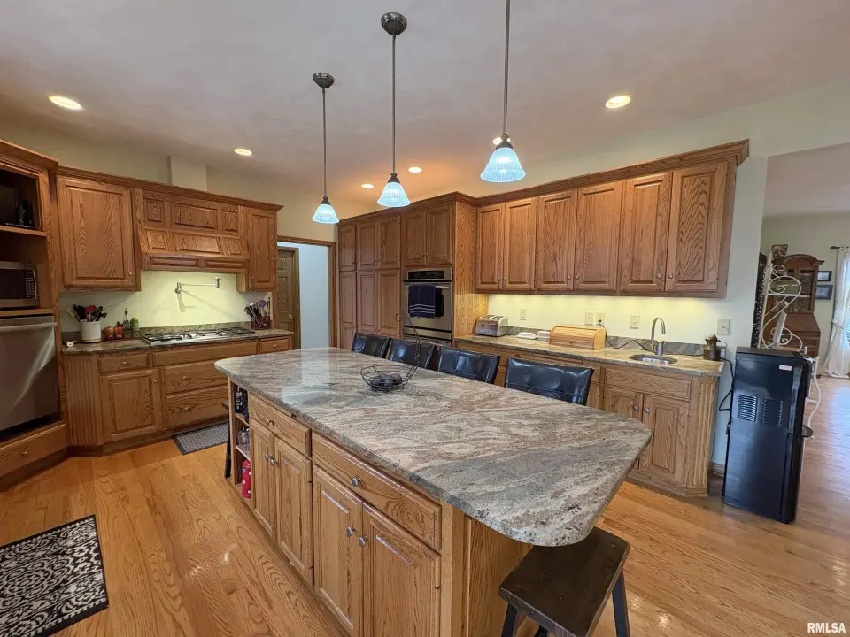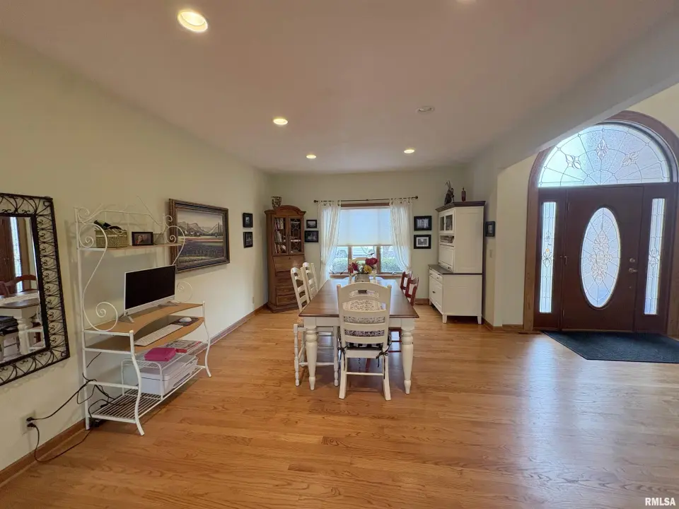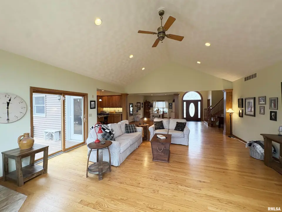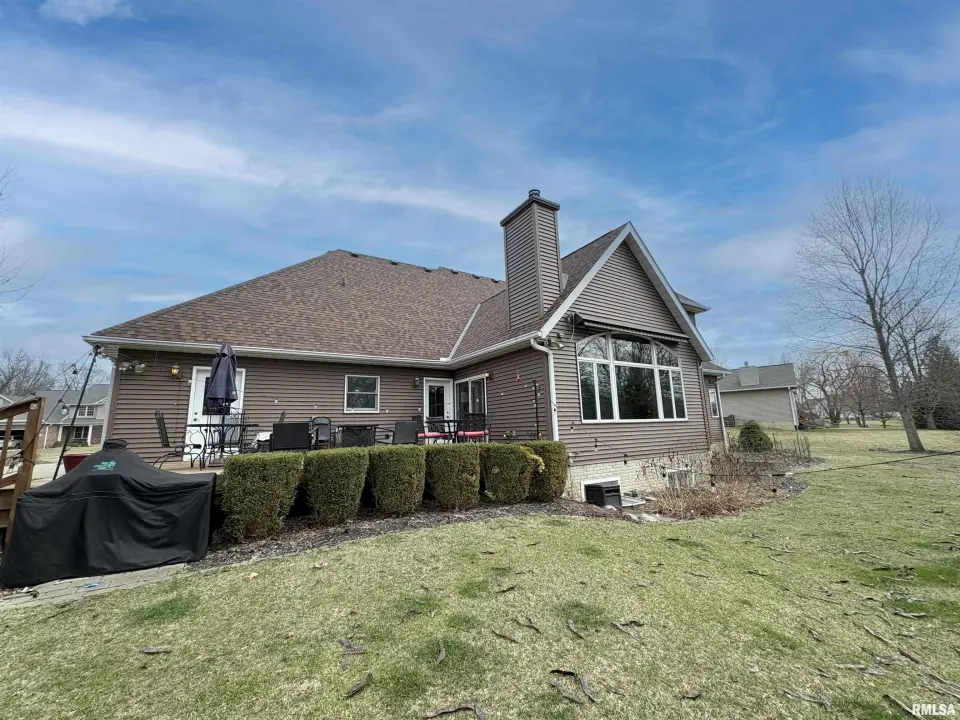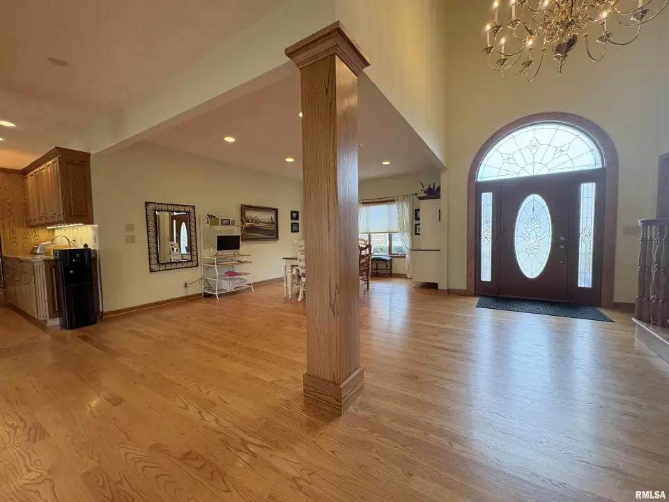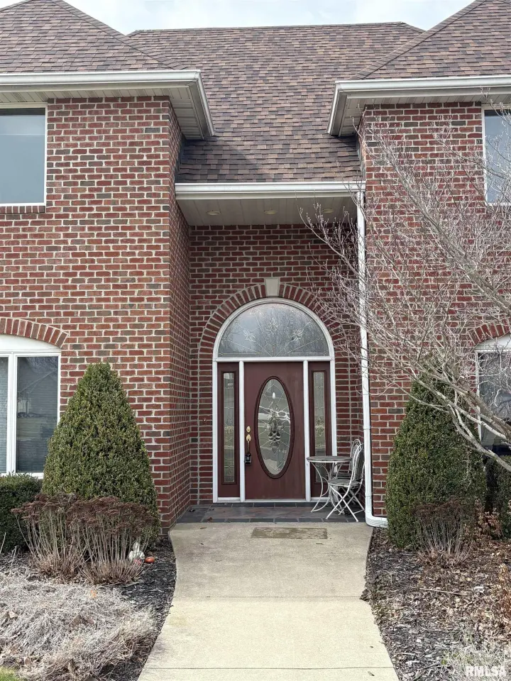 **COMING SOON** Prepare to be impressed by this Tim Beutel custom-built 5BR/4.5BA masterpiece nestled on nearly an acre with wooded privacy behind. With over 3,300 square feet of living space, this home was built to last and built to love. Step through the grand 2-story entry foyer, where a sweeping curved staircase & motorized chandelier set the tone for what lies ahead. The great room stuns with soaring 14’ cathedral ceiling, a Waterford wood stove & an exterior retractable awning for comfortable living. The oak kitchen delivers serious culinary charm with an island breakfast bar, granite countertops, double ovens (one is convection), a gas range with pot filler faucet and a wet bar area. The main floor primary bedroom suite features a spa-like bathroom & custom walk-in closet, while a 5th bedroom doubles perfectly as a home office. Three additional bedrooms & a full bathroom await upstairs, and the partially finished lower level offers even more potential. Quality craftsmanship shines throughout - custom oak hardwood floors, solid interior doors, Andersen windows, lighted closets plus oak trim & cabinetry. Energy-efficient geothermal heating & cooling across 3 zones. Convenient main floor laundry room. New shingles were installed in 2024. 3-stall side-load garage also includes a 2nd basement access. 14x26 deck. Custom designed landscaping with an English Knot Boxwood garden. Oak Ridge Park, grocery stores, Walmart, Menards, eateries and numerous conveniences nearby!