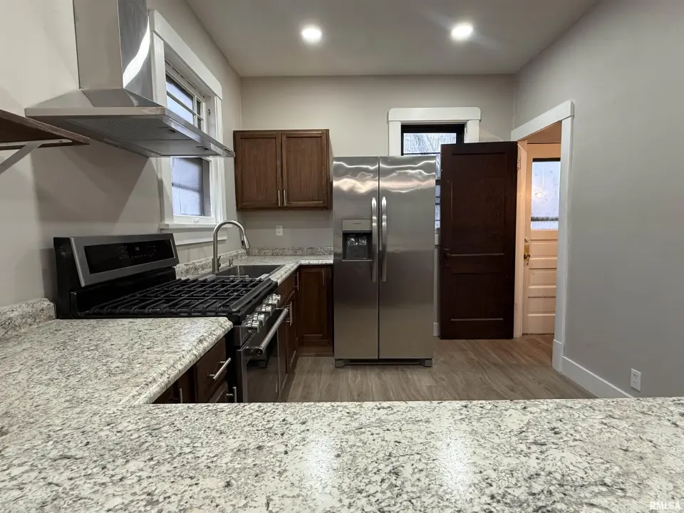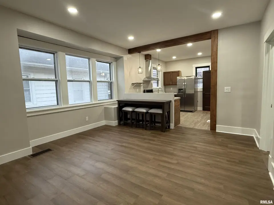 Fully remodeled in Fall/Winter 2025, this move-in-ready home features 2 bedrooms plus a versatile 3rd room ideal for an office or guest space. Updates include new LVP flooring, fresh paint, and updated electrical fixtures throughout. The open kitchen offers wood cabinetry, stone-look countertops, stainless steel appliances, gas range, and breakfast bar flowing into the living area. The updated bathroom features a subway-tile tub surround, modern vanity, and updated fixtures. The basement includes a second bathroom and offers great potential for additional living space, storage, and laundry area. Enjoy the deck, shed, and welcoming front porch, plus new alley access to a backyard parking slab for convenient off-street parking. Move-in ready and full of potential!