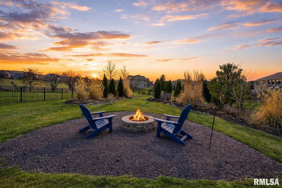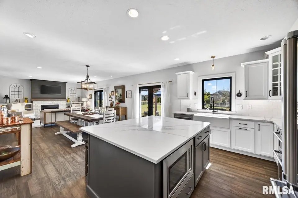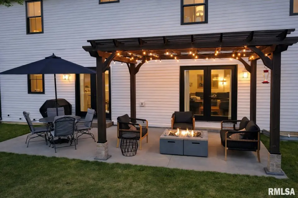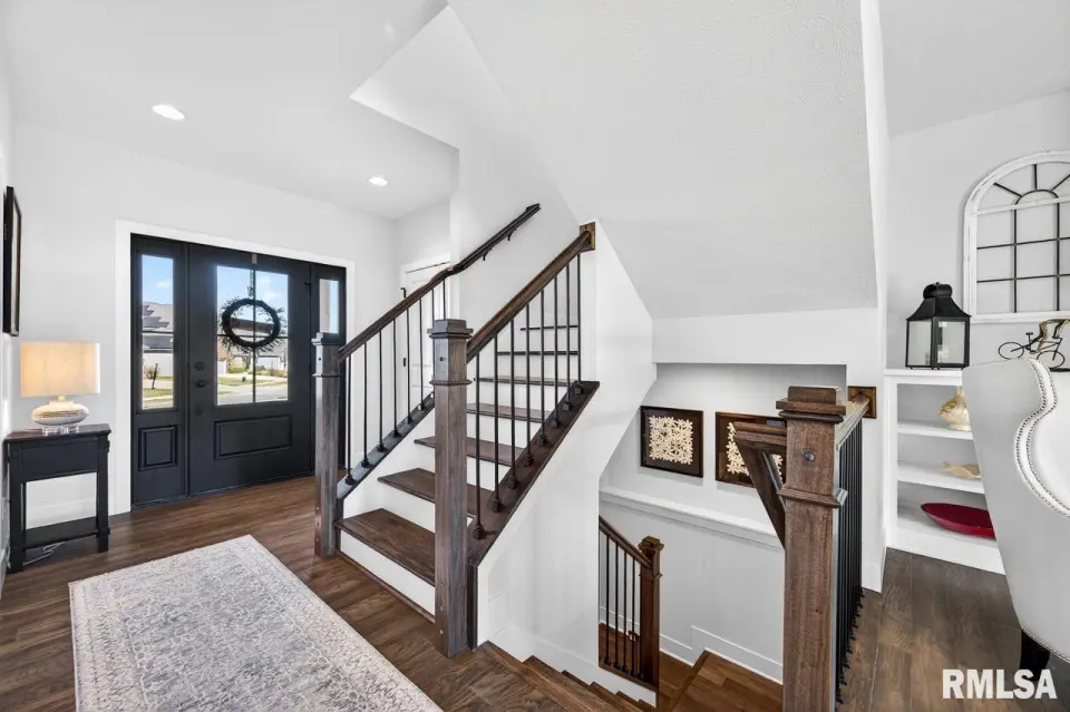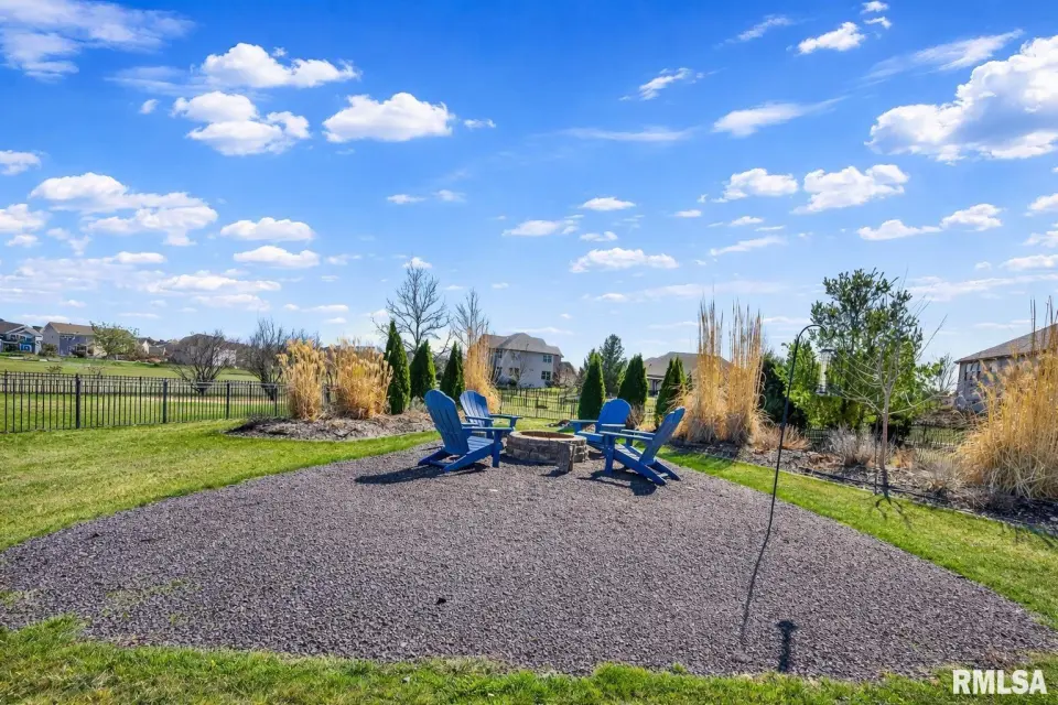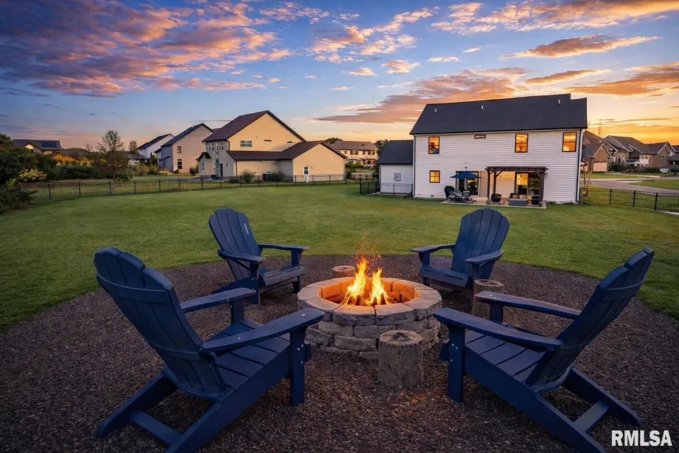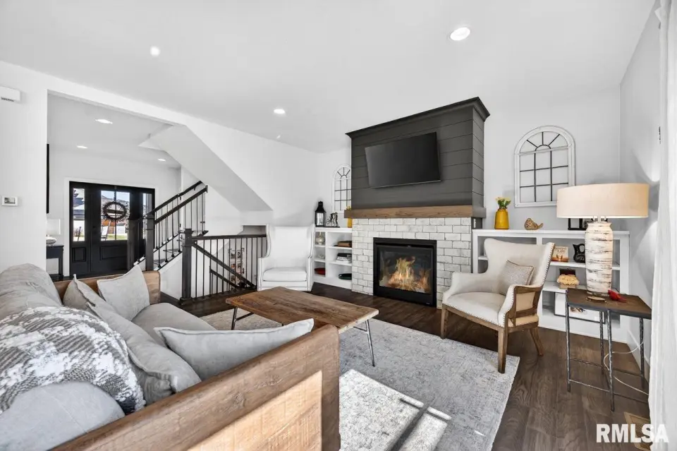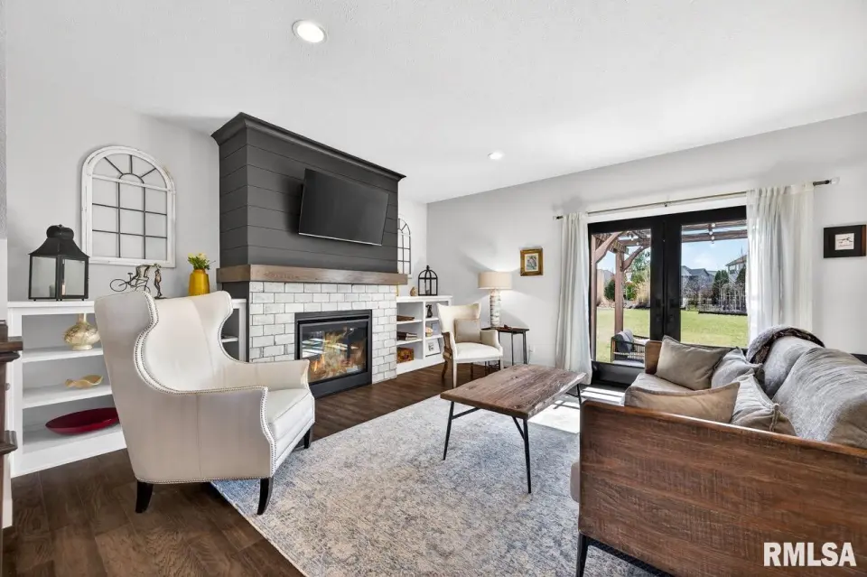 Designed for both comfort and style, the open-concept main level features a light-filled great room with a stunning shiplap and tile gas fireplace, custom built-ins, and French doors leading to the backyard. The informal dining area flows into a beautifully appointed kitchen with an oversized quartz island, white shaker cabinetry, stainless steel appliances, tile backsplash, and a spacious walk-in pantry. A versatile main-floor flex room with French doors is perfect for an office, dining room, or retreat. The three-stall garage includes slat wall panels and a built-in pet wash station. Upstairs offers four bedrooms, a full bath with double vanity, and convenient laundry. The primary suite features vaulted ceilings, pond views, a large walk-in closet, and a luxurious bath with double vanity, custom tile shower, and built-in vanity. A secondary bedroom with French doors and sink adds flexibility. The finished basement includes 9’ ceilings, a rec room with wet bar, full bath, and fifth bedroom. Enjoy outdoor living with a stamped patio, pergola, gas fireplace, fenced yard, fire pit, garden beds, shed, and Monarch Waystation.