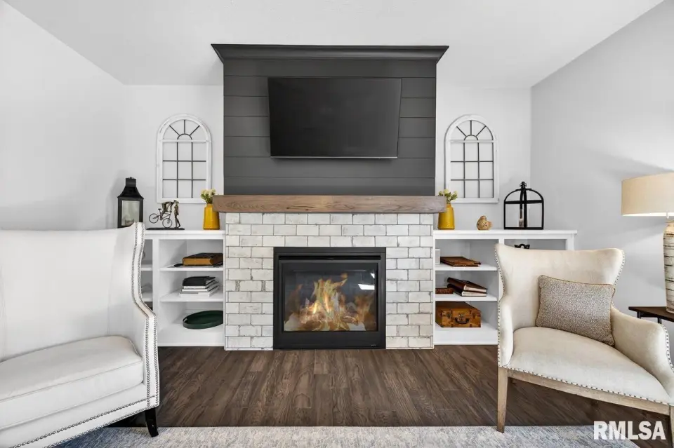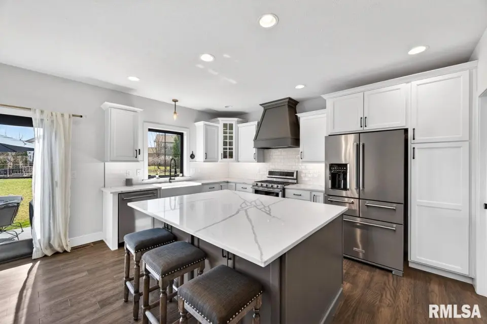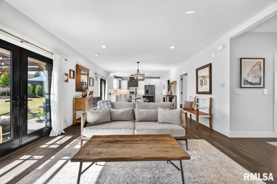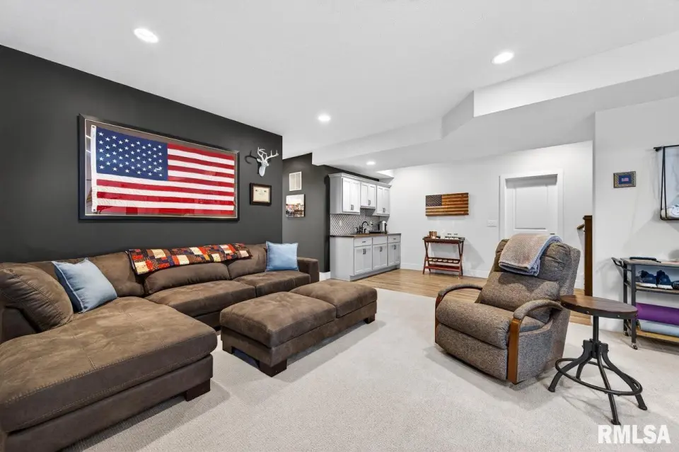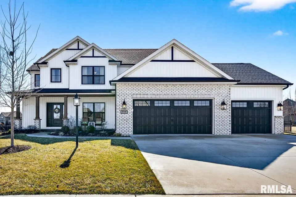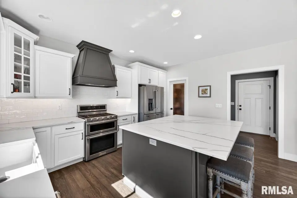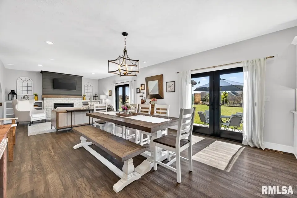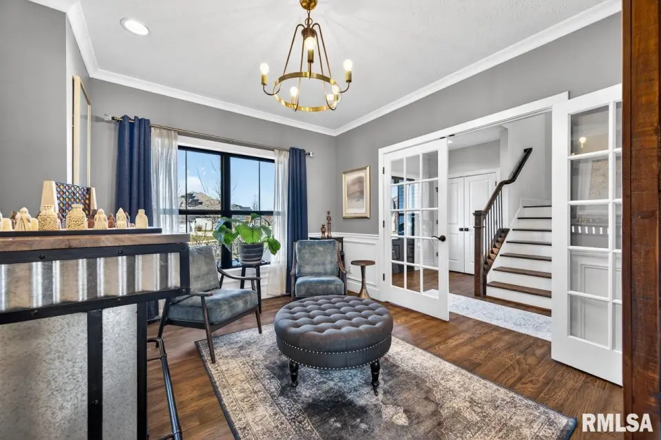 Designed for both comfort and style, the open-concept main level features a light-filled great room with a stunning shiplap and tile gas fireplace, custom built-ins, and French doors leading to the backyard. The informal dining area flows into a beautifully appointed kitchen with an oversized quartz island, white shaker cabinetry, stainless steel appliances, tile backsplash, and a spacious walk-in pantry. A versatile main-floor flex room with French doors is perfect for an office, dining room, or retreat. The three-stall garage includes slat wall panels and a built-in pet wash station. Upstairs offers four bedrooms, a full bath with double vanity, and convenient laundry. The primary suite features vaulted ceilings, pond views, a large walk-in closet, and a luxurious bath with double vanity, custom tile shower, and built-in vanity. A secondary bedroom with French doors and sink adds flexibility. The finished basement includes 9’ ceilings, a rec room with wet bar, full bath, and fifth bedroom. Enjoy outdoor living with a stamped patio, pergola, gas fireplace, fenced yard, fire pit, garden beds, shed, and Monarch Waystation.