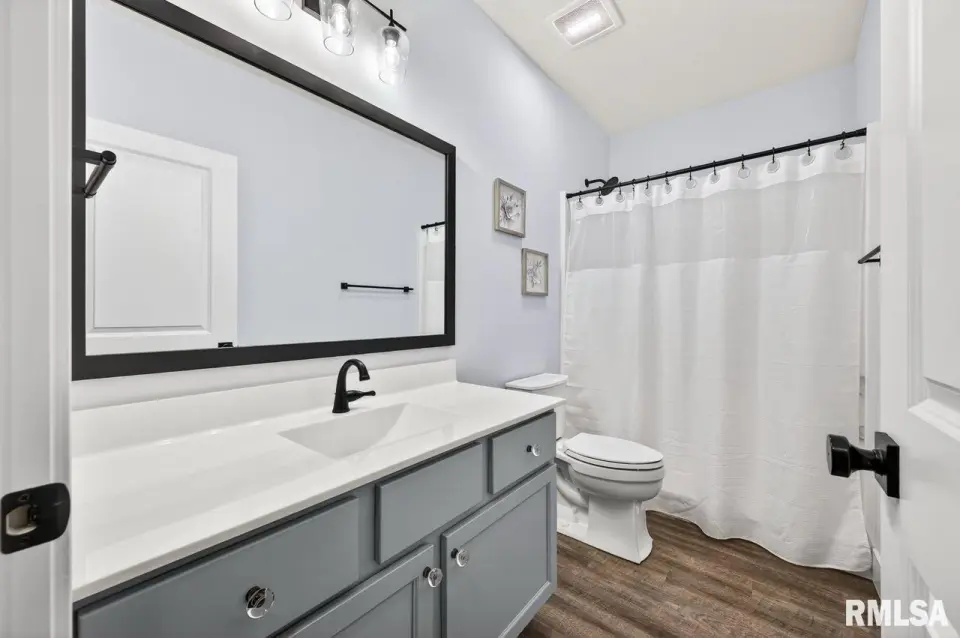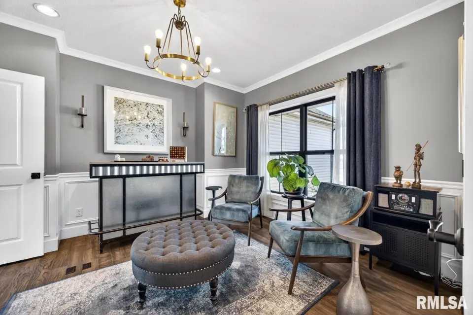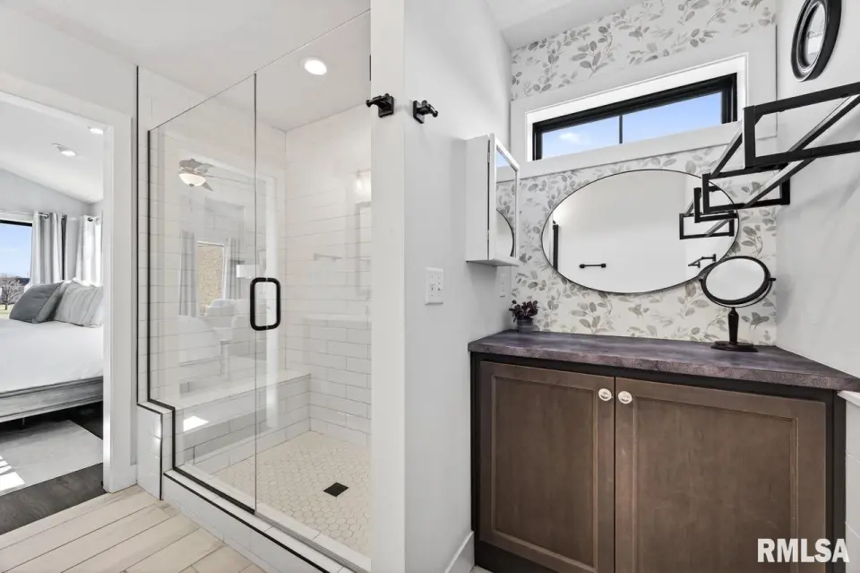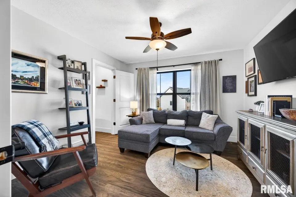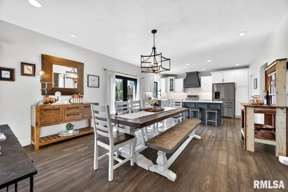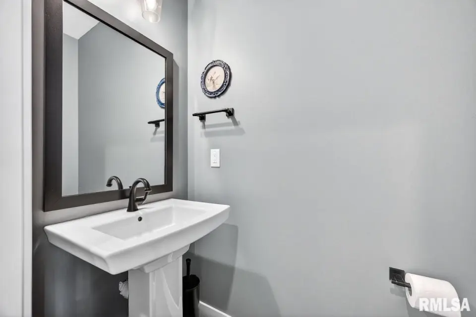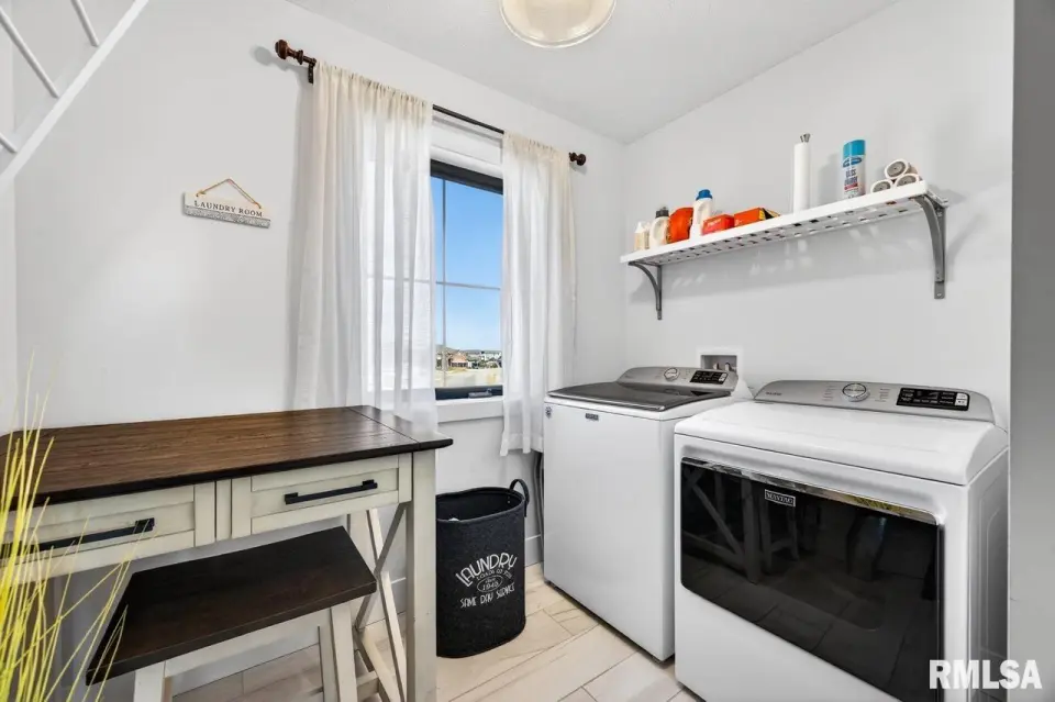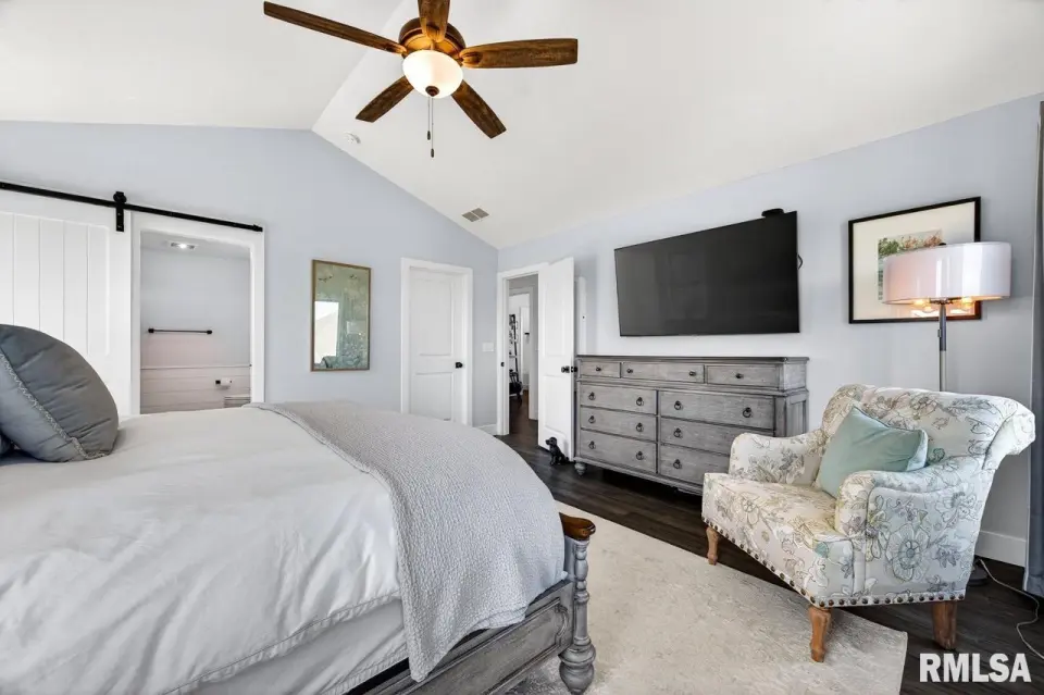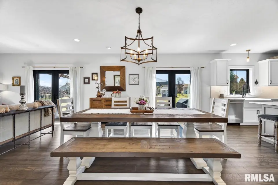 Designed for both comfort and style, the open-concept main level features a light-filled great room with a stunning shiplap and tile gas fireplace, custom built-ins, and French doors leading to the backyard. The informal dining area flows into a beautifully appointed kitchen with an oversized quartz island, white shaker cabinetry, stainless steel appliances, tile backsplash, and a spacious walk-in pantry. A versatile main-floor flex room with French doors is perfect for an office, dining room, or retreat. The three-stall garage includes slat wall panels and a built-in pet wash station. Upstairs offers four bedrooms, a full bath with double vanity, and convenient laundry. The primary suite features vaulted ceilings, pond views, a large walk-in closet, and a luxurious bath with double vanity, custom tile shower, and built-in vanity. A secondary bedroom with French doors and sink adds flexibility. The finished basement includes 9’ ceilings, a rec room with wet bar, full bath, and fifth bedroom. Enjoy outdoor living with a stamped patio, pergola, gas fireplace, fenced yard, fire pit, garden beds, shed, and Monarch Waystation.
