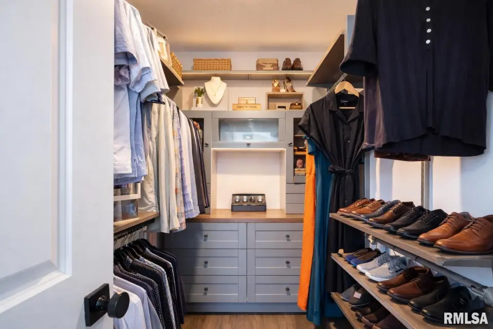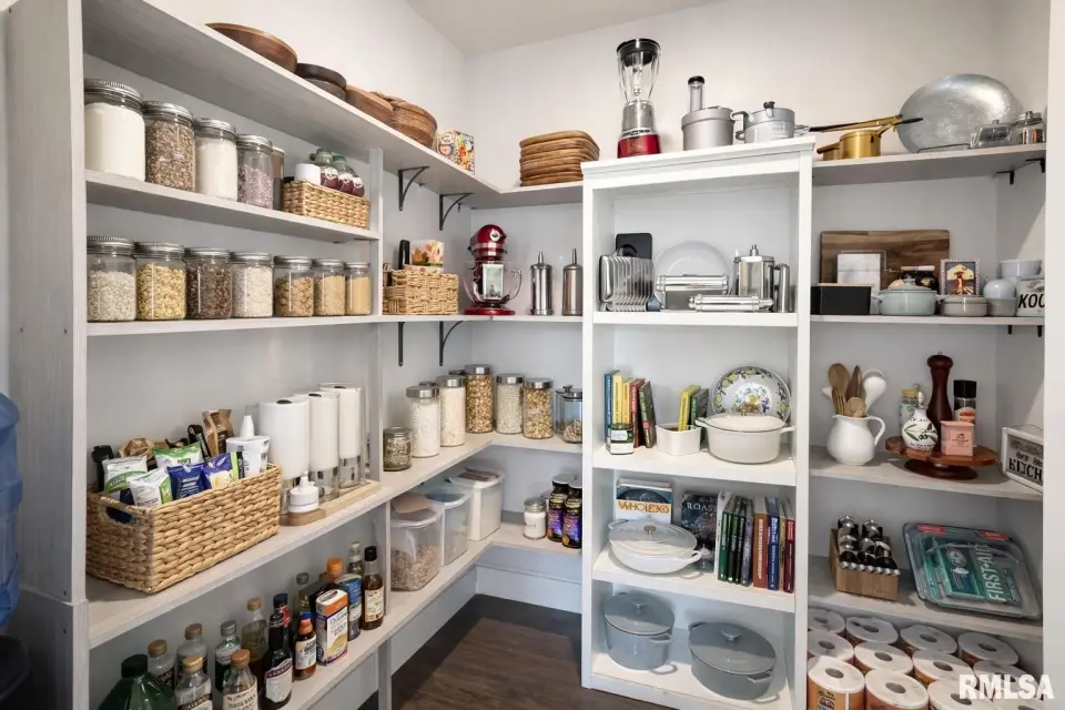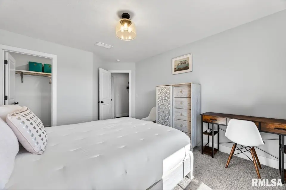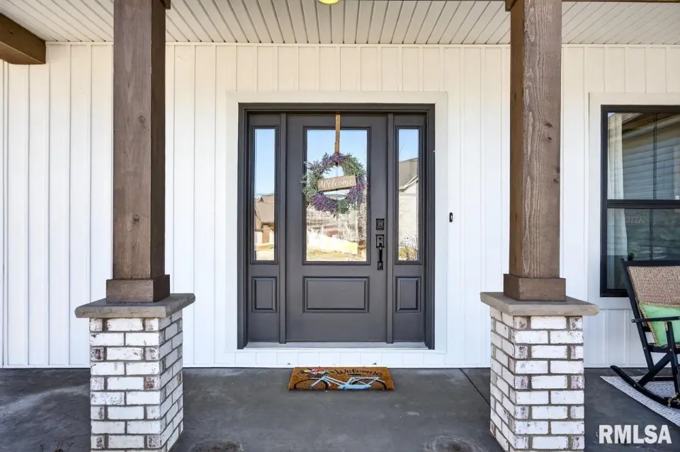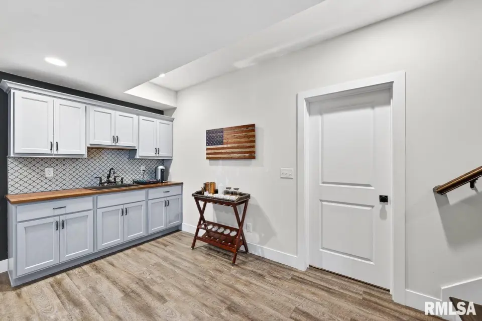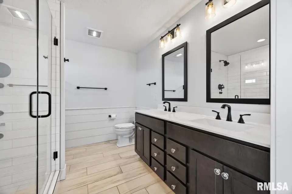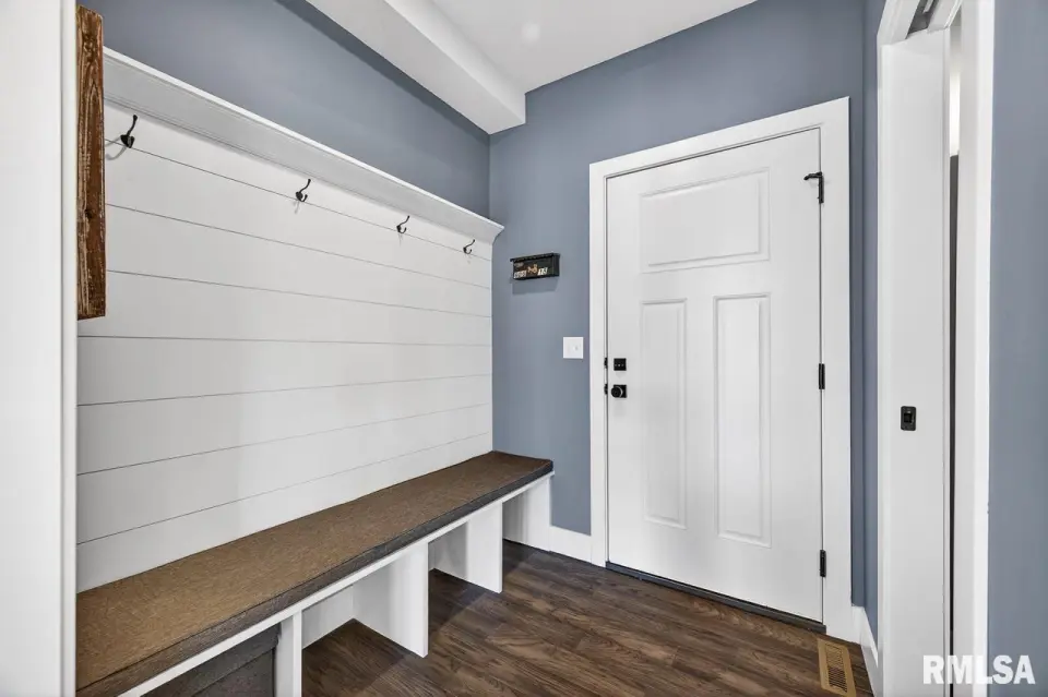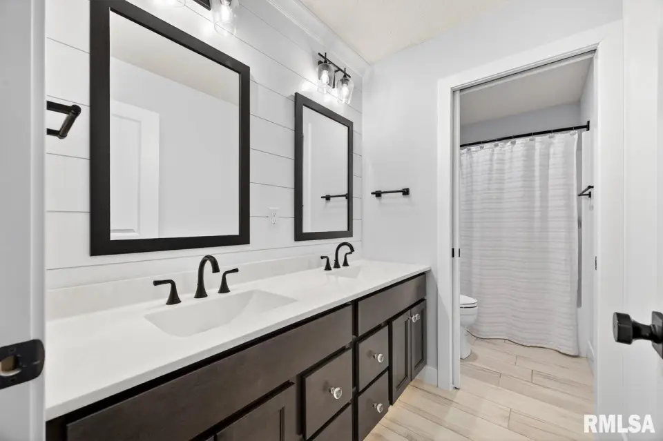 Designed for both comfort and style, the open-concept main level features a light-filled great room with a stunning shiplap and tile gas fireplace, custom built-ins, and French doors leading to the backyard. The informal dining area flows into a beautifully appointed kitchen with an oversized quartz island, white shaker cabinetry, stainless steel appliances, tile backsplash, and a spacious walk-in pantry. A versatile main-floor flex room with French doors is perfect for an office, dining room, or retreat. The three-stall garage includes slat wall panels and a built-in pet wash station. Upstairs offers four bedrooms, a full bath with double vanity, and convenient laundry. The primary suite features vaulted ceilings, pond views, a large walk-in closet, and a luxurious bath with double vanity, custom tile shower, and built-in vanity. A secondary bedroom with French doors and sink adds flexibility. The finished basement includes 9’ ceilings, a rec room with wet bar, full bath, and fifth bedroom. Enjoy outdoor living with a stamped patio, pergola, gas fireplace, fenced yard, fire pit, garden beds, shed, and Monarch Waystation.