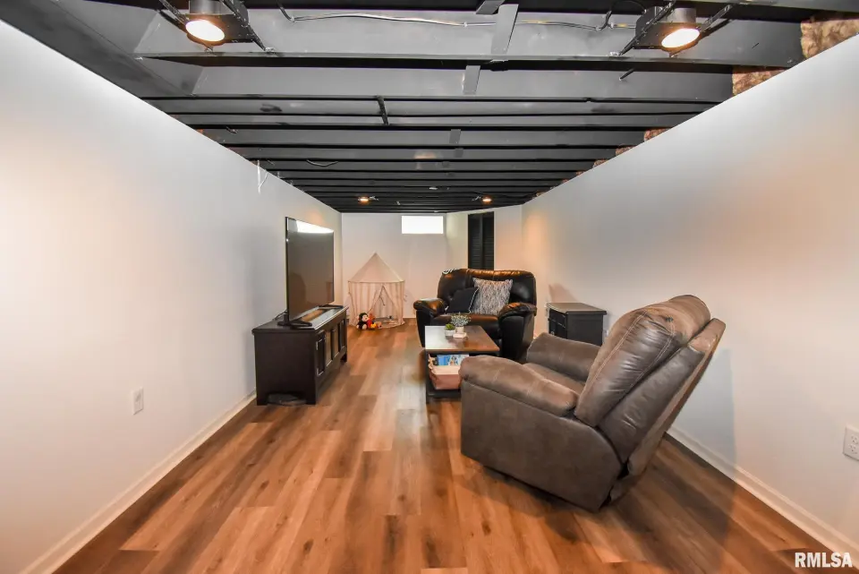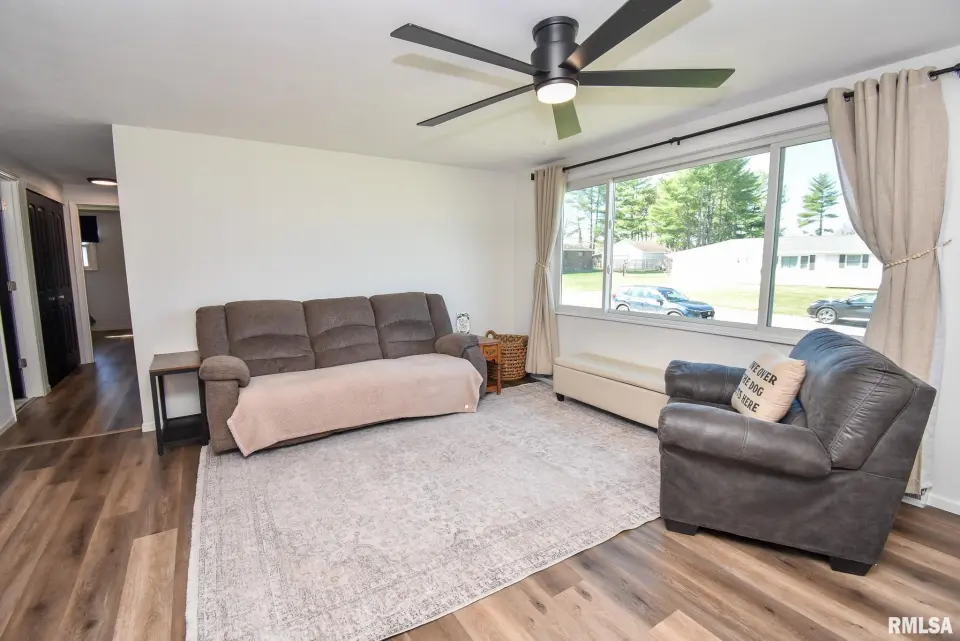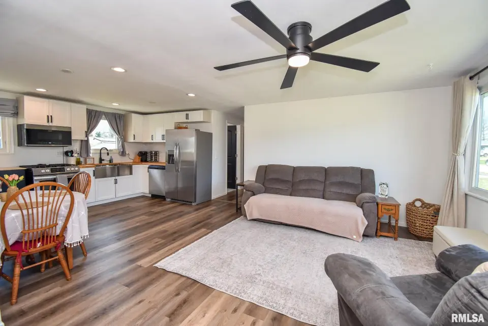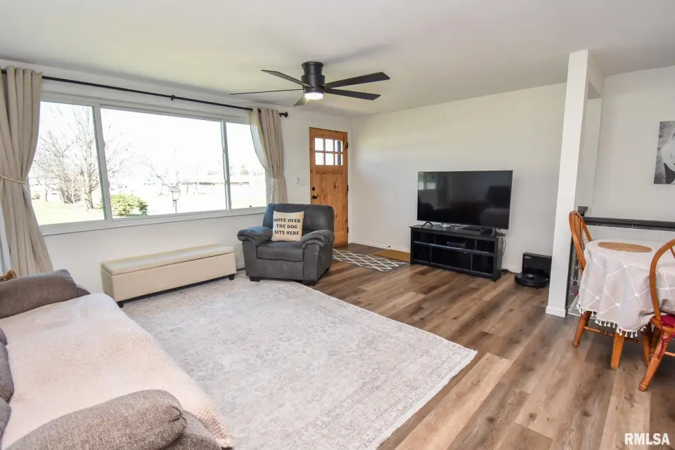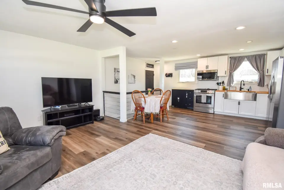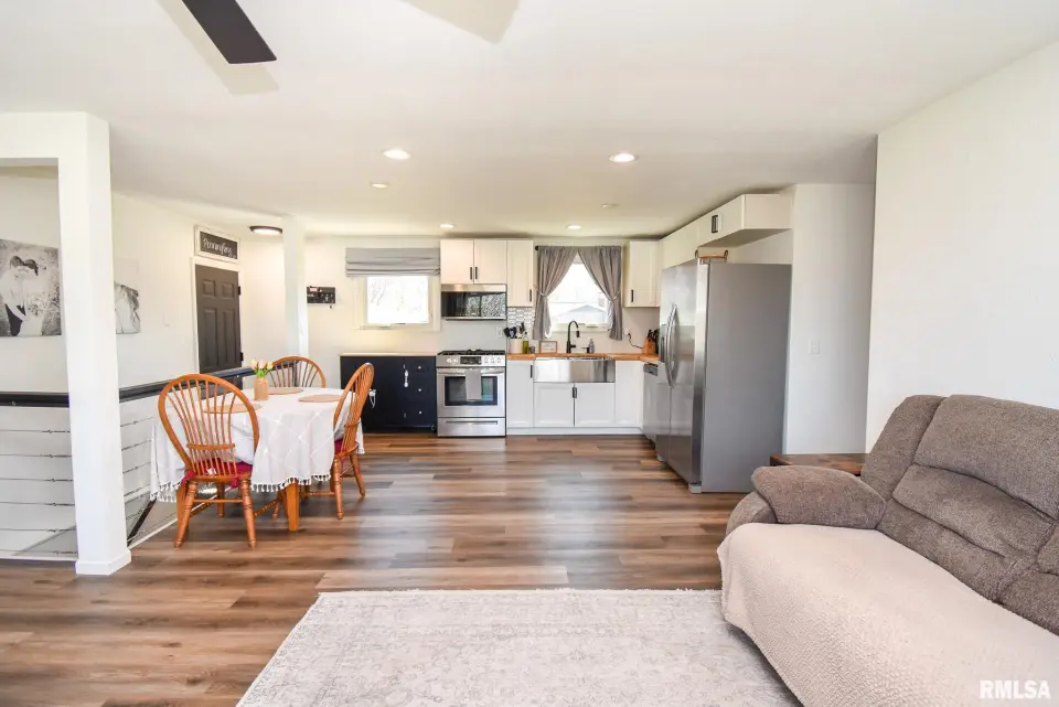 The home was remodeled in 2022, with additional improvements including new windows in the living room, kitchen, and bathroom (2023), a new roof, gutters, and gutter guards (2023), a new water softener (2024), and a shed roof replacement (2023). The main level features an open-concept layout combining the living room and kitchen, along with luxury vinyl plank flooring throughout and updated light fixtures. The bathroom includes a tiled shower, updated vanity, and tile flooring. A finished basement offers additional living space with recessed lighting and flexible use options. The property also includes a level backyard, fenced yard area, and a large shed for storage. Move-in ready with recent updates throughout. Schedule your showing today to see all this home has to offer.
