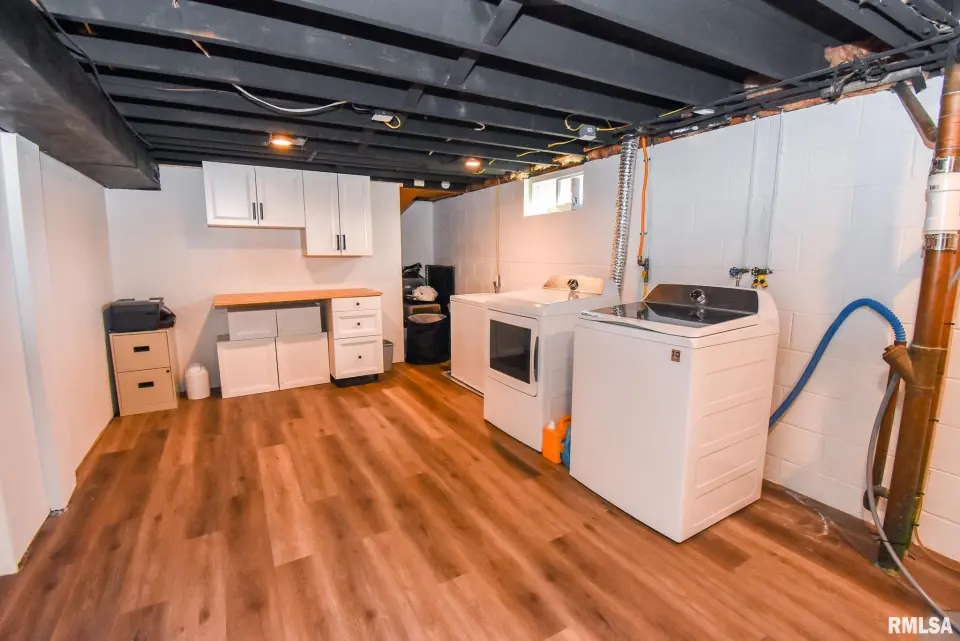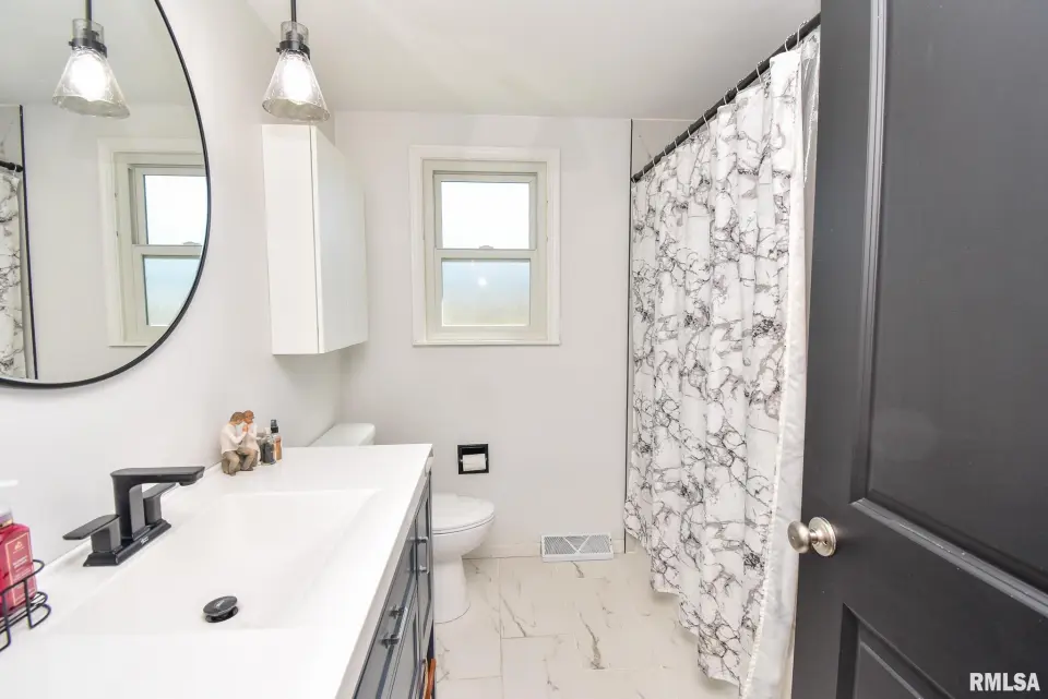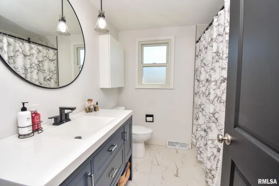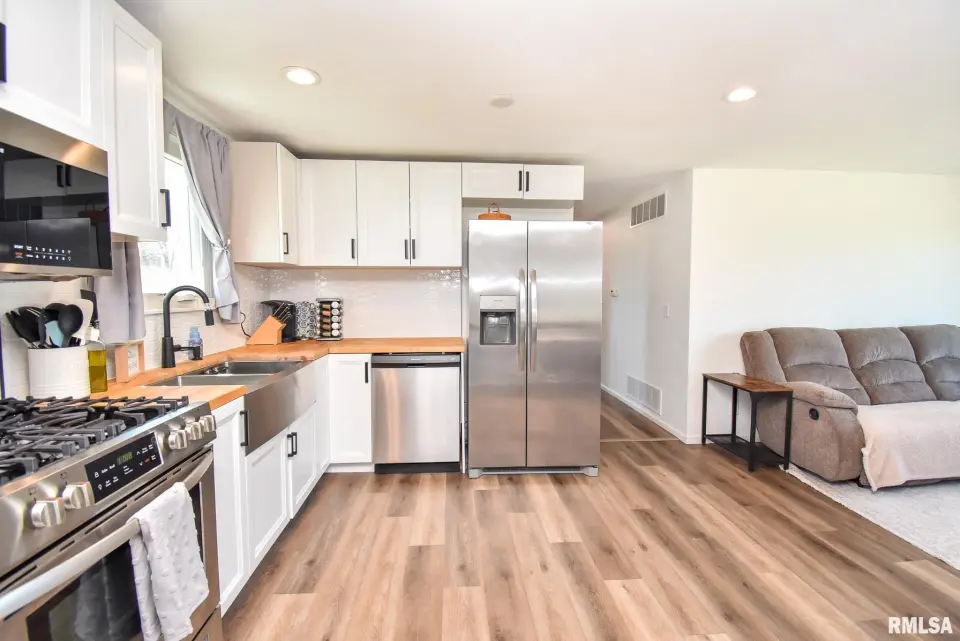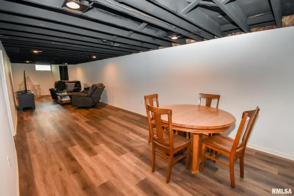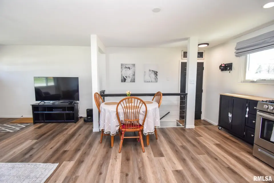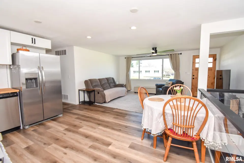 The home was remodeled in 2022, with additional improvements including new windows in the living room, kitchen, and bathroom (2023), a new roof, gutters, and gutter guards (2023), a new water softener (2024), and a shed roof replacement (2023). The main level features an open-concept layout combining the living room and kitchen, along with luxury vinyl plank flooring throughout and updated light fixtures. The bathroom includes a tiled shower, updated vanity, and tile flooring. A finished basement offers additional living space with recessed lighting and flexible use options. The property also includes a level backyard, fenced yard area, and a large shed for storage. Move-in ready with recent updates throughout. Schedule your showing today to see all this home has to offer.
