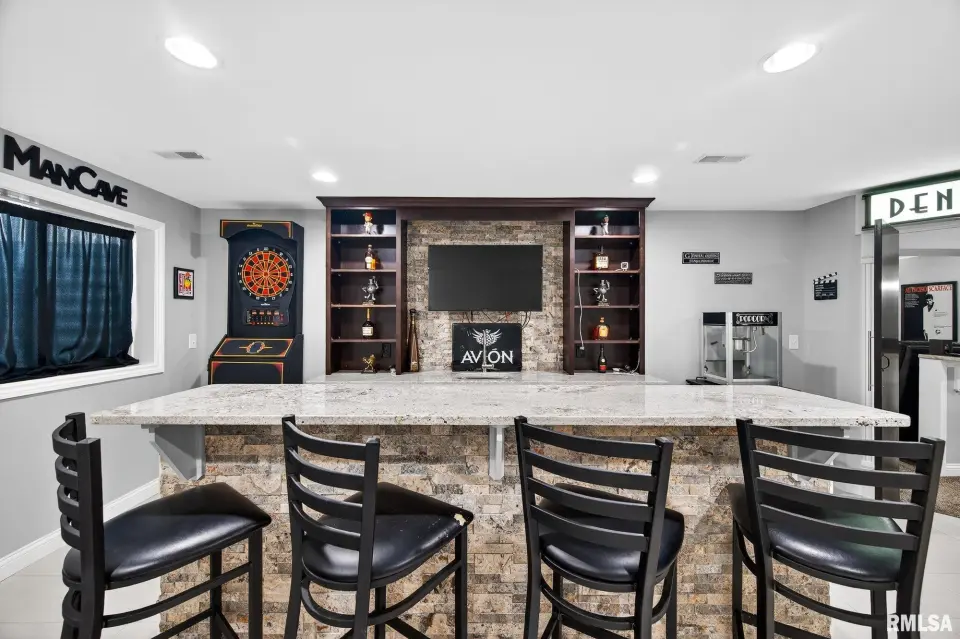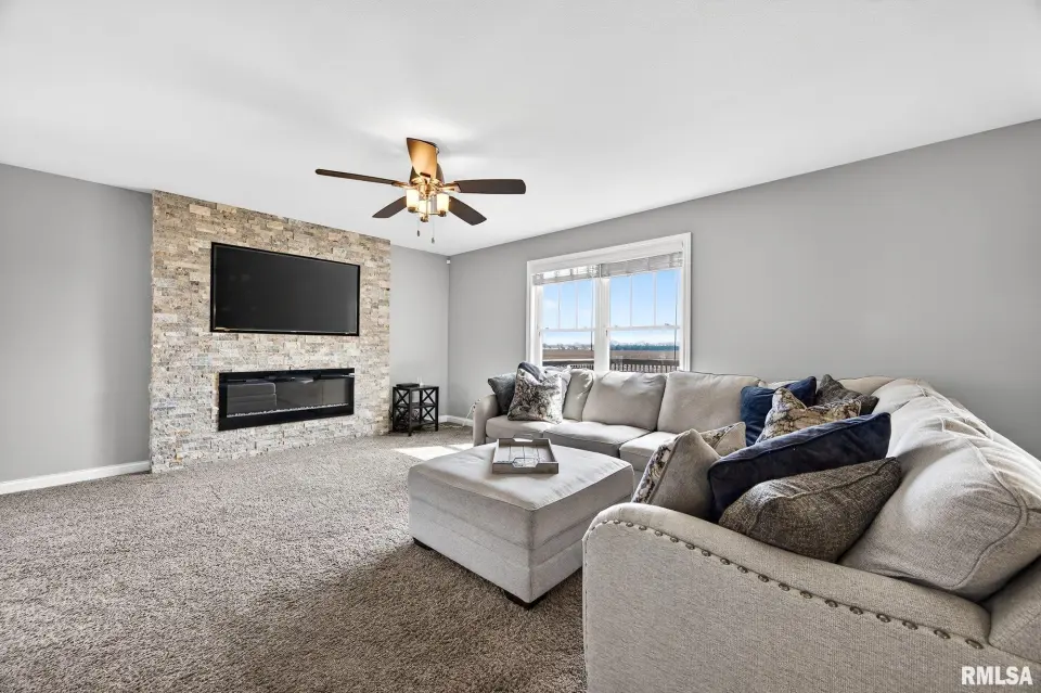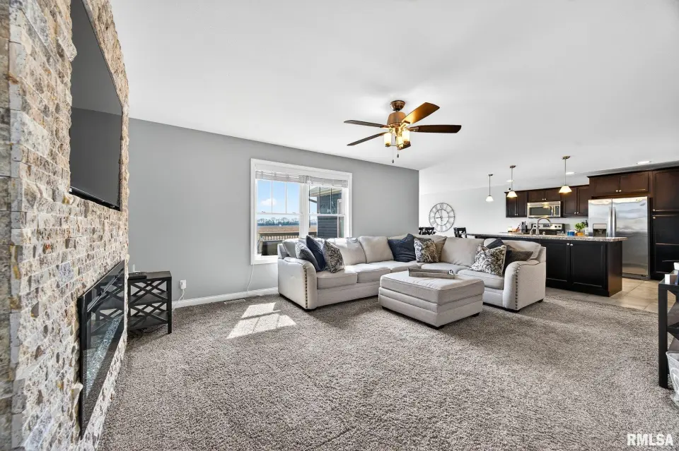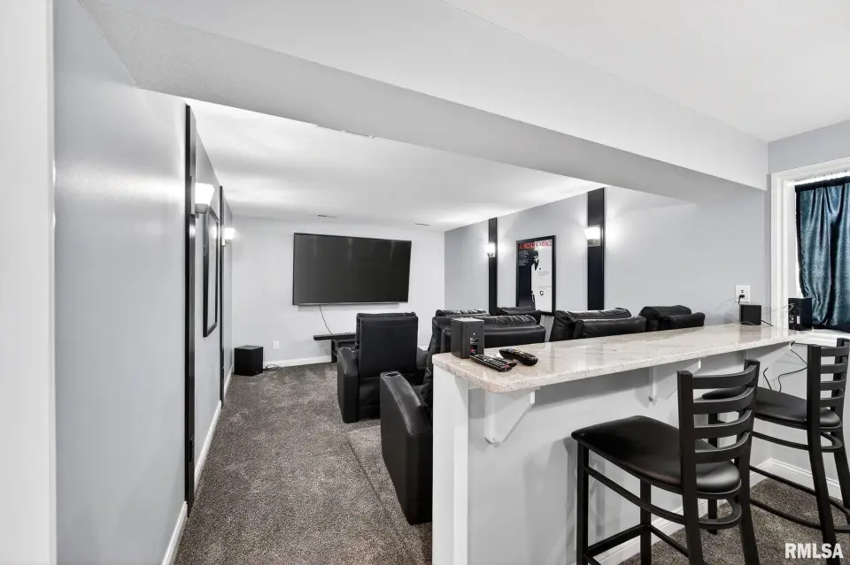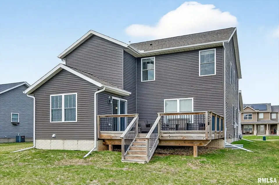 The exterior features an attractive combination of brick & vinyl for strong curb appeal. Step inside to a welcoming foyer that leads into the great room, highlighted by a beautiful stone fireplace. The kitchen offers stainless steel appliances, a generous island with breakfast bar seating that flows seamlessly into the informal dining area, creating an ideal layout for everyday living & entertaining. There is also a half bathroom on the main level. Upstairs, you will find all four bedrooms, including a spacious primary suite with a private full bath & dual walk-in closets. Three additional bedrooms, a laundry room with washer & dryer included, and another full bathroom complete the upper level. Get ready to be WOWED! The professionally finished basement adds even more living space & includes a rec area with a bar with granite tops & beautiful stonework, a media room that has been fully insulated for sound, that includes a snack bar with granite tops. There is also plenty of room for storage & another half bathroom in the basement. Enjoy outdoor living with an expansive deck just off the informal dining area overlooking the backyard. Additional features include an attached 3 car garage, custom blinds, a high-efficiency furnace, a high-efficiency water heater, & a radon mitigation system.