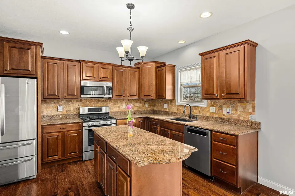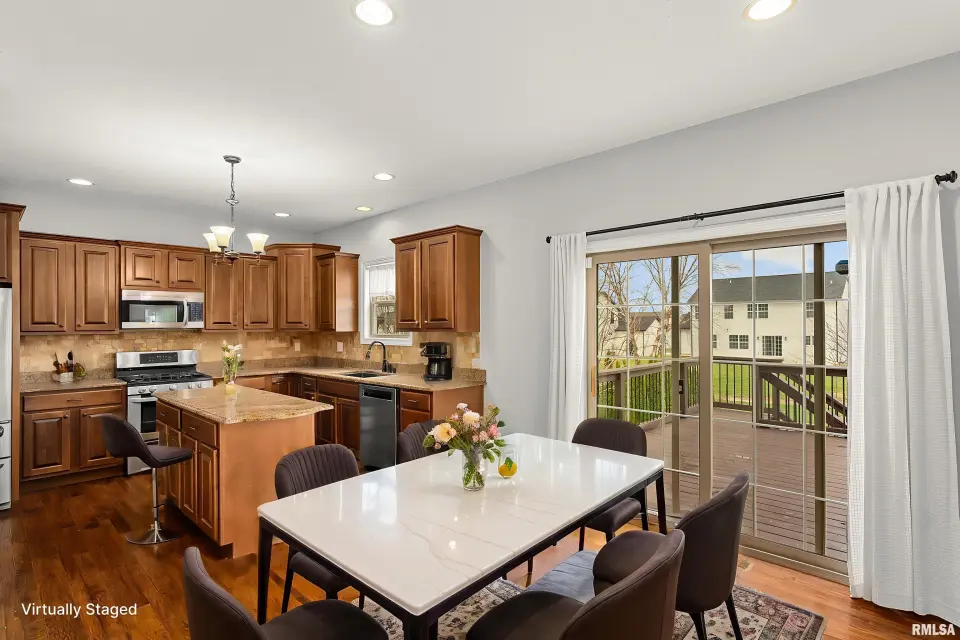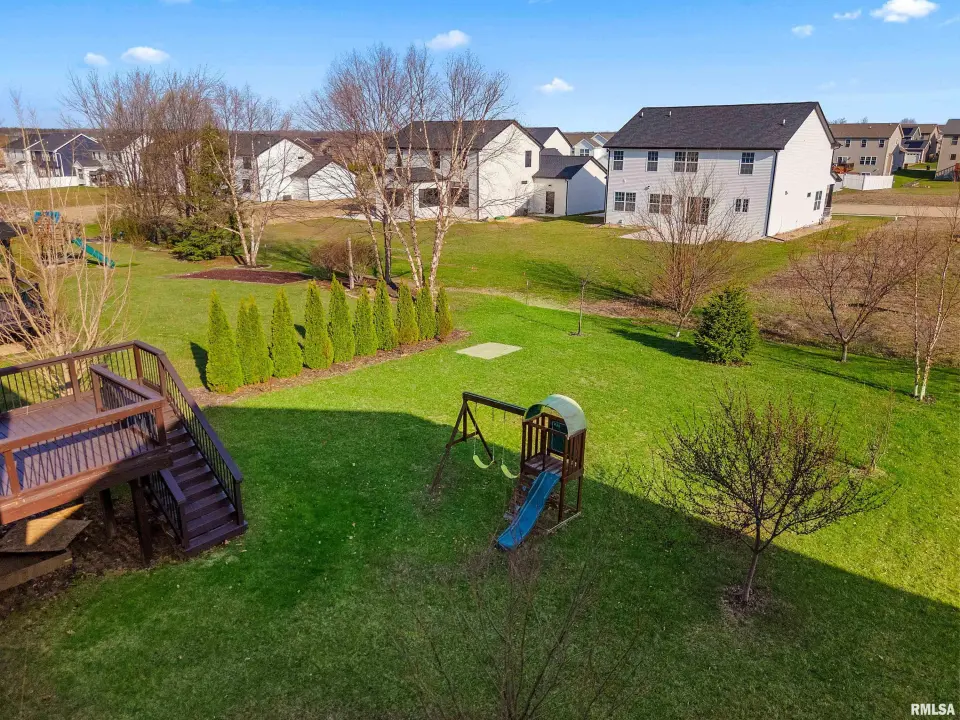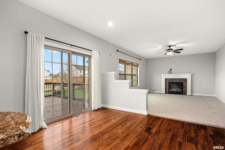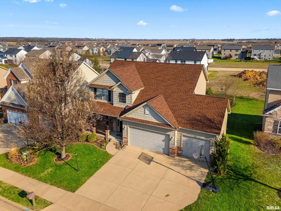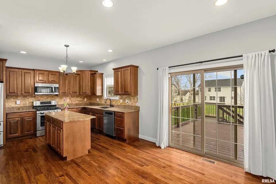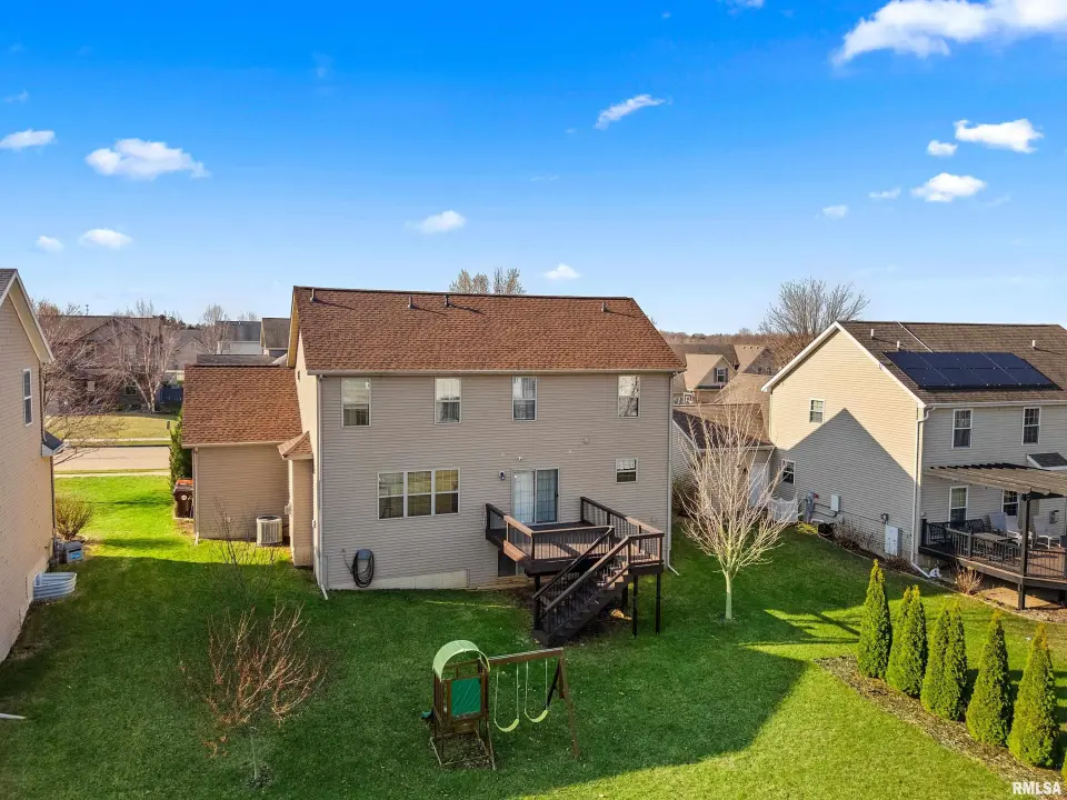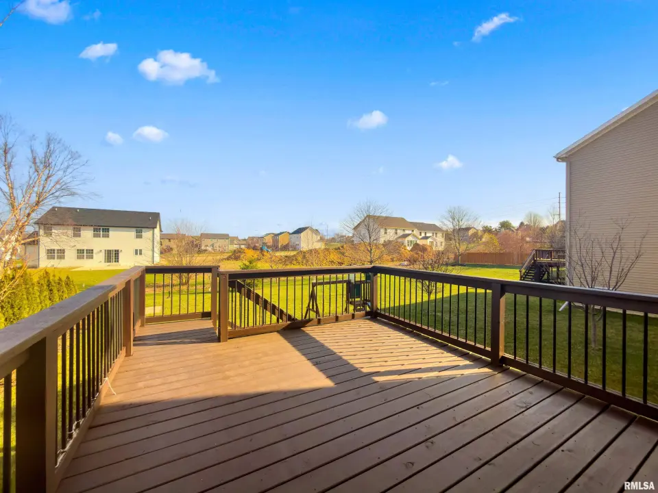 The main floor features abundant hardwood flooring & an open layout, including a versatile flex space perfect for a living or formal dining room. The great room is filled w/ natural light from windows & showcases a cozy fireplace, creating a warm & inviting atmosphere. The kitchen offers granite countertops, a center island, tile backsplash, wood cabinetry & stainless steel appliances, blending style & functionality. A main-floor laundry adds everyday convenience. Upstairs, each bedroom features a vaulted ceiling & a charming lighted display nook above the closet. The primary suite includes a jetted tub, separate standing shower & dual vanities. Three additional bedrooms provide ample space for family or guests, all w/ walk-in closets. The finished basement is ideal for entertaining, featuring daylight windows, a spacious recreation room, a 5th bedroom, full bath & additional storage space. Step outside to the main-floor deck, perfect for relaxing or hosting gatherings. Recent updates: Hybrid water heater in '23, New roof in '24, updated deck boards in '25, Fresh Paint for whole house & New Carpet in the Main and Upper Floor in '26. Includes a 14-month home warranty.