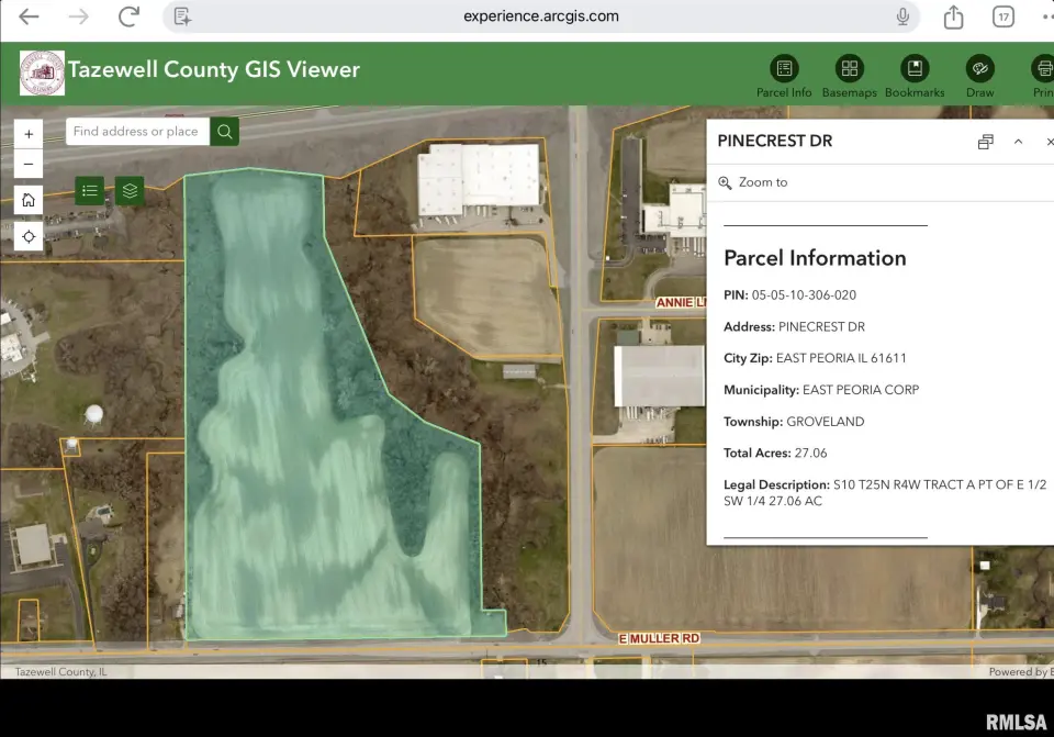 East Peoria City limits. This property currently is farmed agricultural. This property is subject to a Solar lease. Use of the property for a solar project is subject to approval by East Peoria Zoning and Planning Commission. A copy of the provisions of the solar lease is available upon request, only by prospective purchasers of the property. Utilities nearby. EP fire station located on the corner of Mueller Rd and Pinecrest Dr.