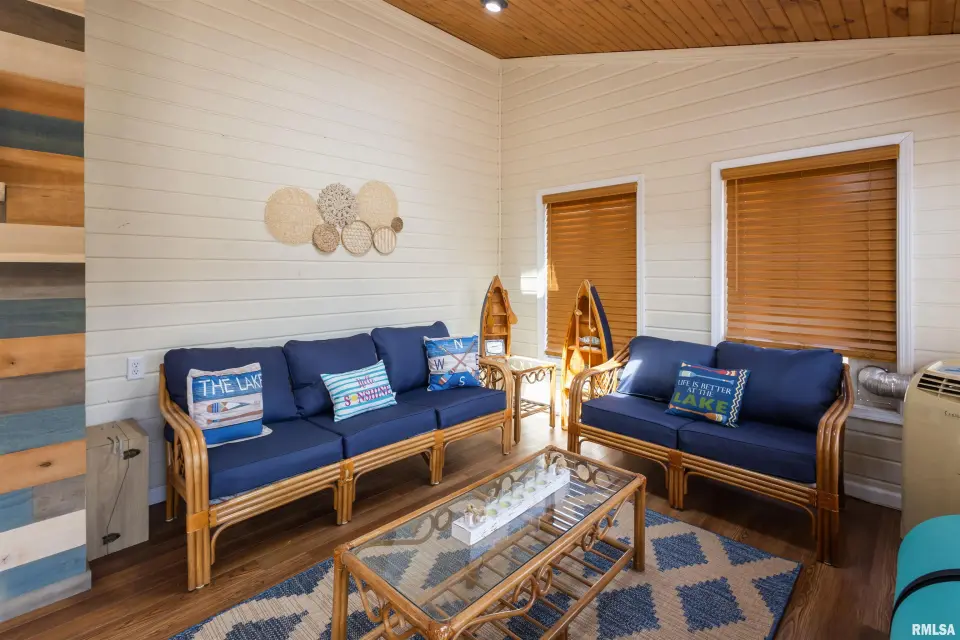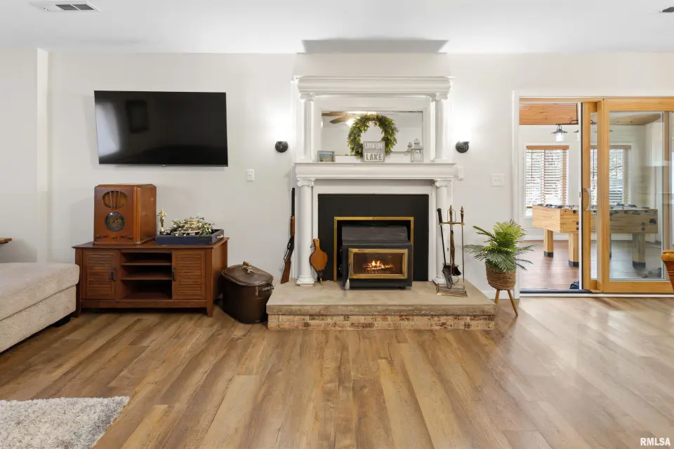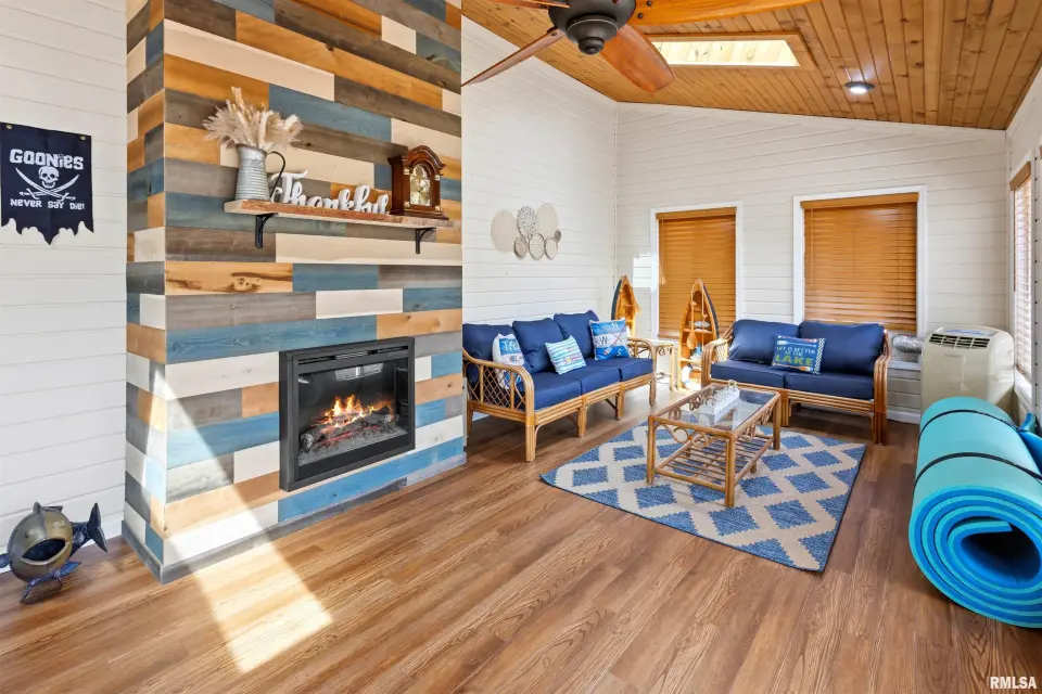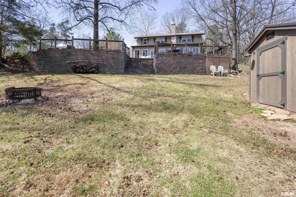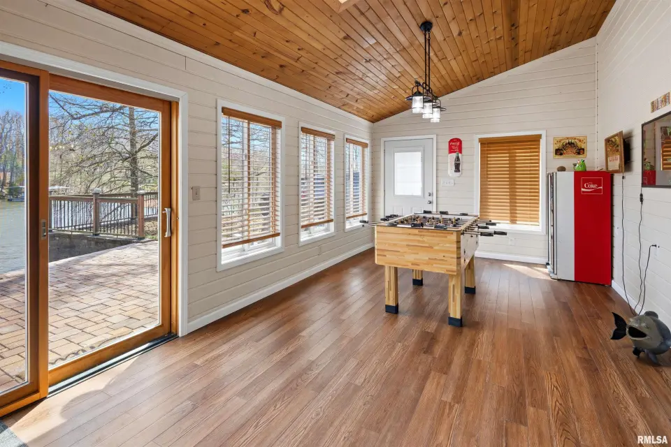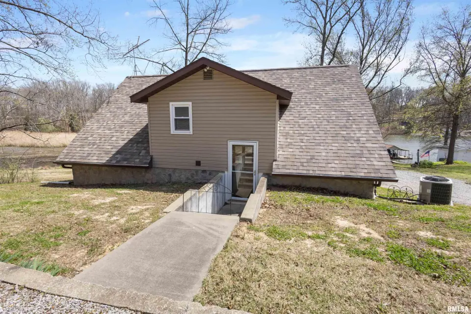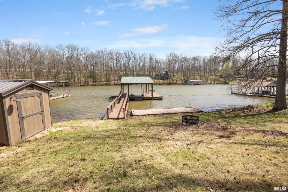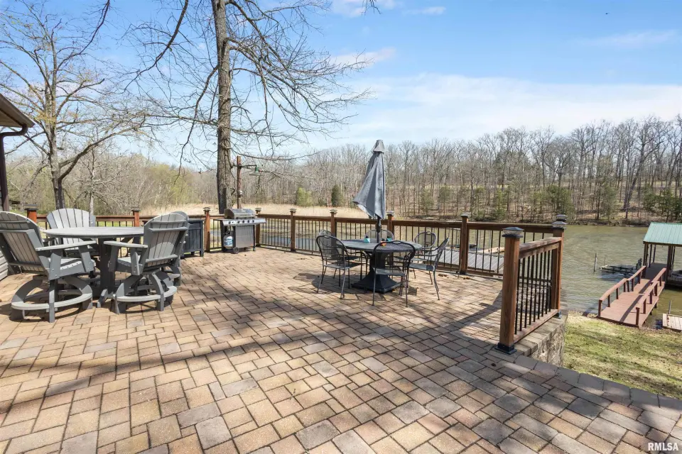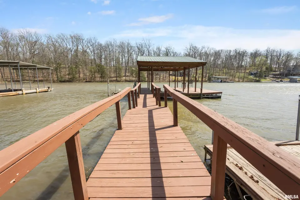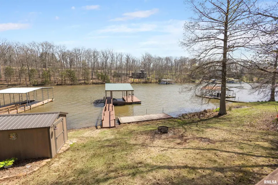 The main level features a beautifully designed kitchen with gorgeous countertops, crisp white cabinetry and a convenient laundry/pantry area. You'll also find a half bath, a welcoming living room and a spacious primary bedroom complete with a private en suite bath. Upstairs the home offers three generously sized bedrooms with ample storage, along with a full shared bath-perfect for family and guests. Enjoy the outdoors year-round from the beautiful screened and glassed-in back porch, or step outside to the impressive -450 sq ft block patio-an ideal space for relaxing or entertaining while gazing at the water. Recent updates include new a new roof (2024) and a totally renovated, tastefully decorated full bathroom. Owner has also installed new gutter guards and back porch had brand new skylights installed when new roof was done in 2024. This property truly shines outside also featuring a covered dock with a boat slip, plus an additional uncovered exterior lift-perfect for a fishing boat, a 22x22 detached garage provides parking while the 30x40 pole barn offers storage and space for all kinds of projects! There is also a new 8x12 ft storage building by the dock and a new sun deck added onto the dock. There is electricity in shed, dock, garage and pole barn!
