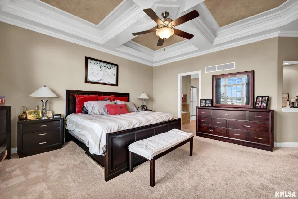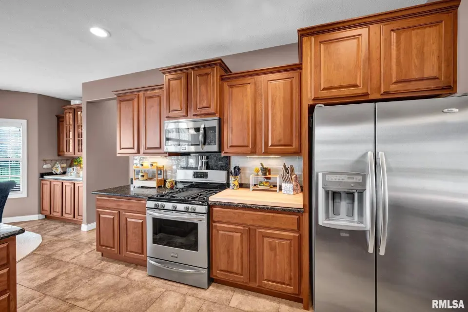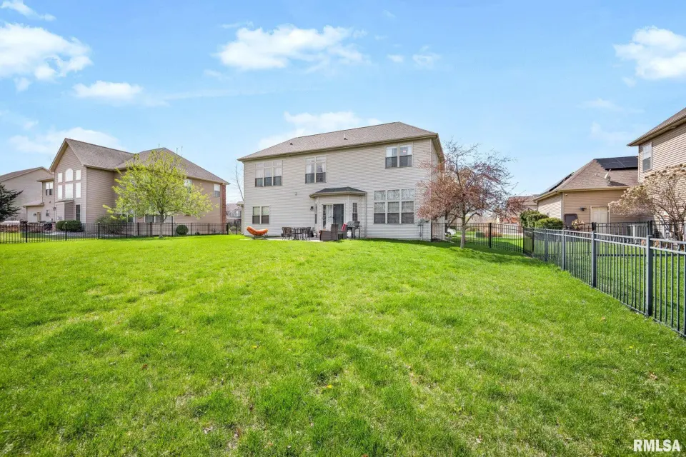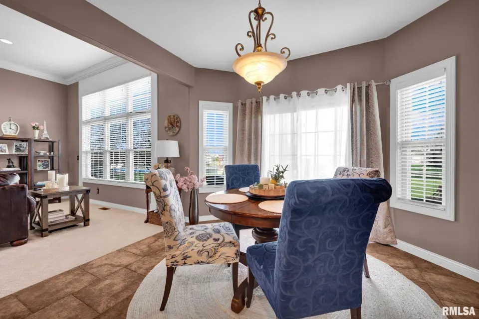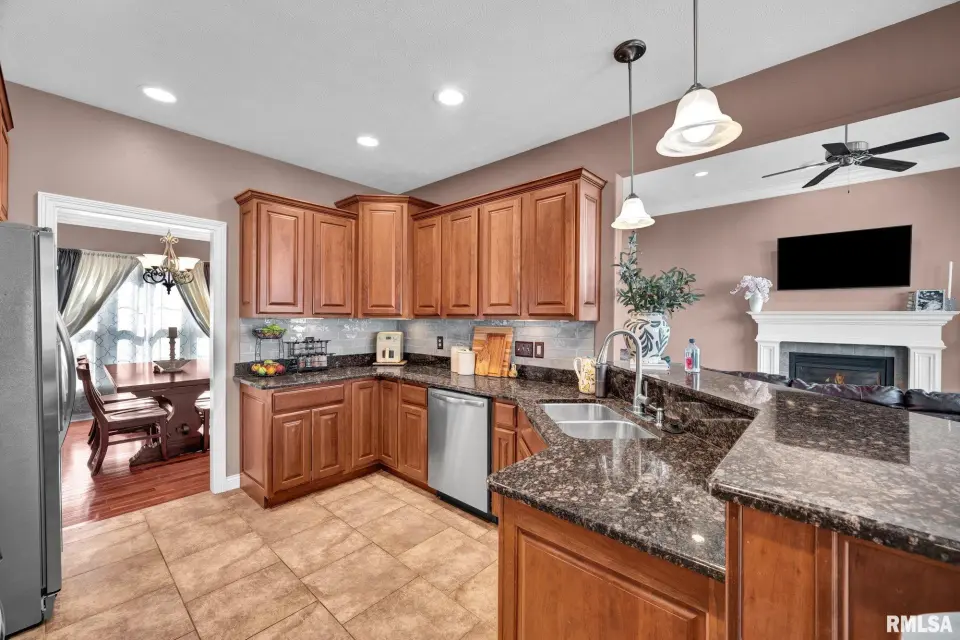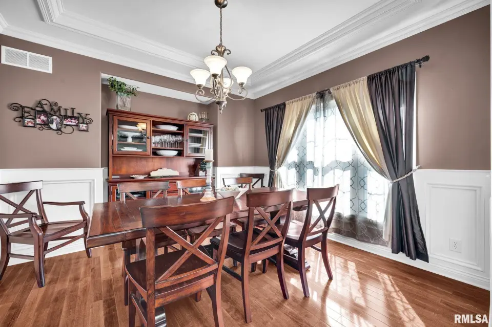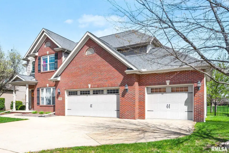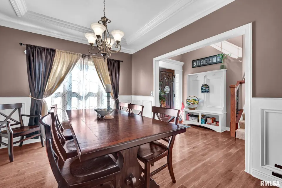From the moment you enter, rich wood flooring, elevated ceilings and thoughtfully designed built-ins set the tone for a home that blends warmth with sophistication. The main living area features a cozy gas fireplace, fresh carpeting, and expansive windows that fill the space with natural light while seamlessly connecting the living and dining area. The kitchen is designed for both everyday living and effortless entertaining, complete with ample custom cabinetry, granite countertops, an eat-in bar, and a buffet station-perfect for hosting. A formal dining room offers an elegant setting for holidays and special occasions. Upstairs, the spacious primary suite serves as a private retreat, highlighted by coffered ceilings, ambient rope lighting, and a well-appointed en suite bath. Three additional generously sized bedrooms, laundry room and a full bath provide ample space for family or guests. The finished basement expands your living options with a large family room, full bath, and 5th bedroom. A main-level den could easily function as a 6th bedroom. 3 stall heated garage has utility sink, workbench and a perfect bonus space. Step outside to professional landscaped grounds featuring mature trees, irrigation and a peaceful setting perfect for relaxing and entertaining. Close to walking trails.