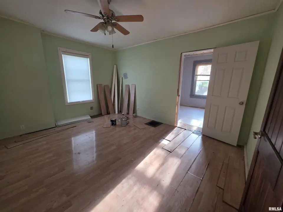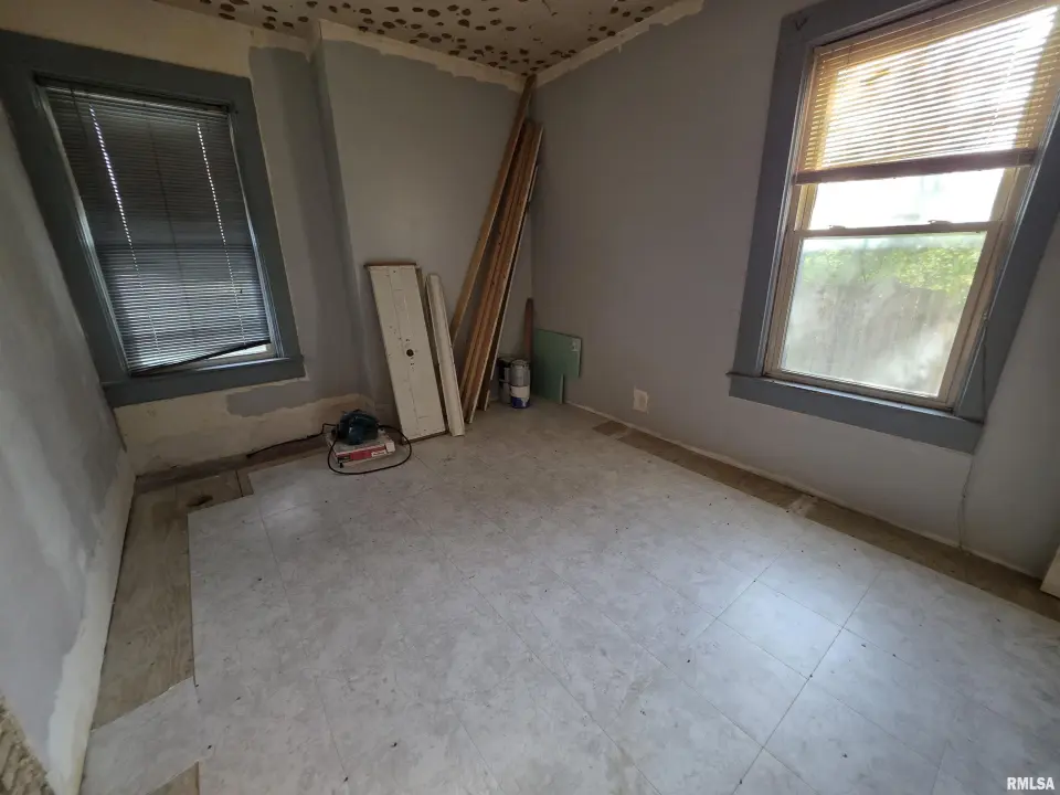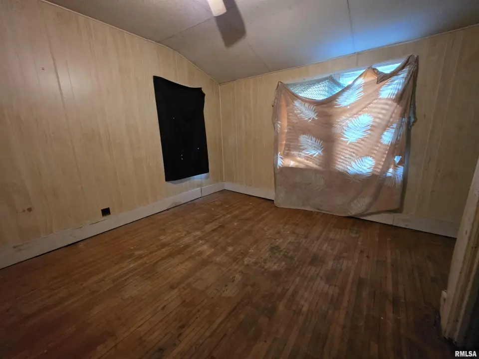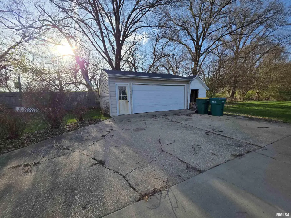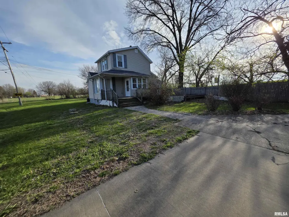 Enclosed entry porch, main level living room, dining room, kitchen and bedroom. Second story has two bedrooms and bathroom. 2 car detached garage.