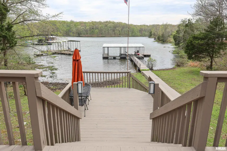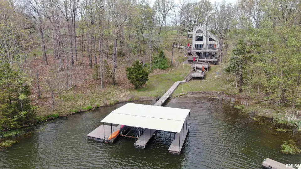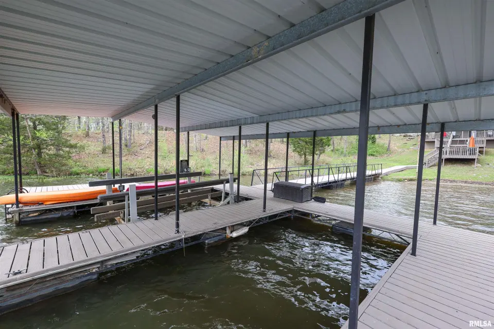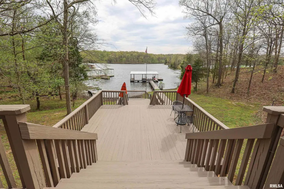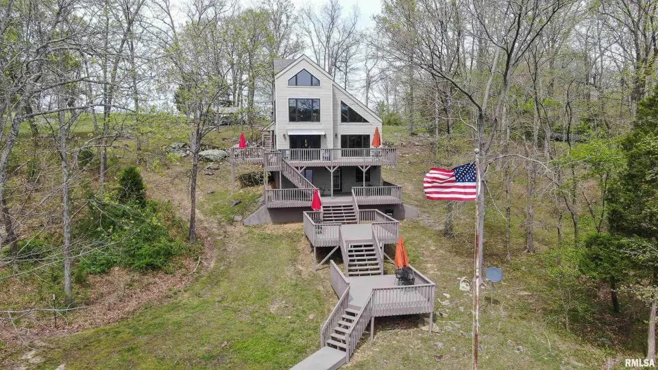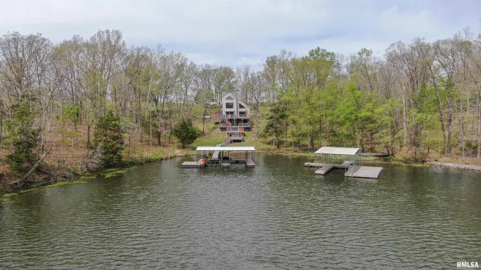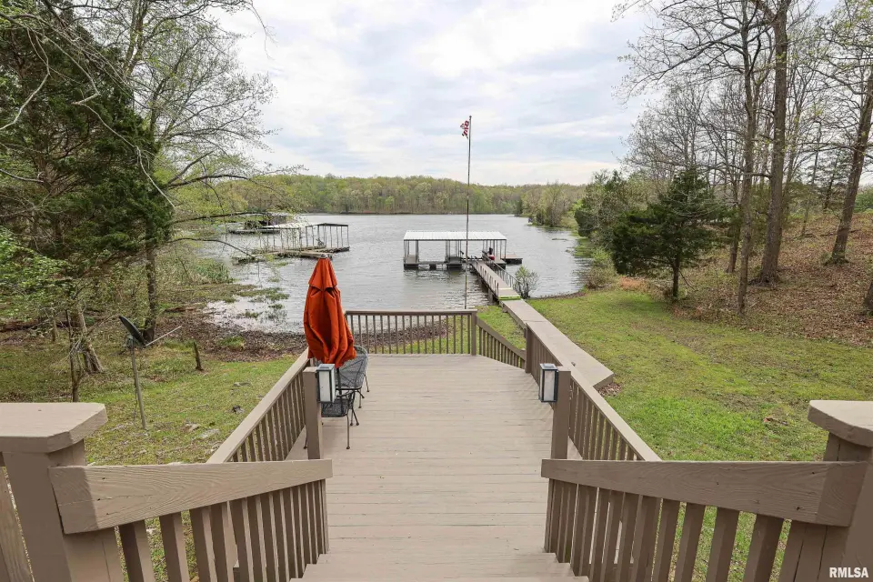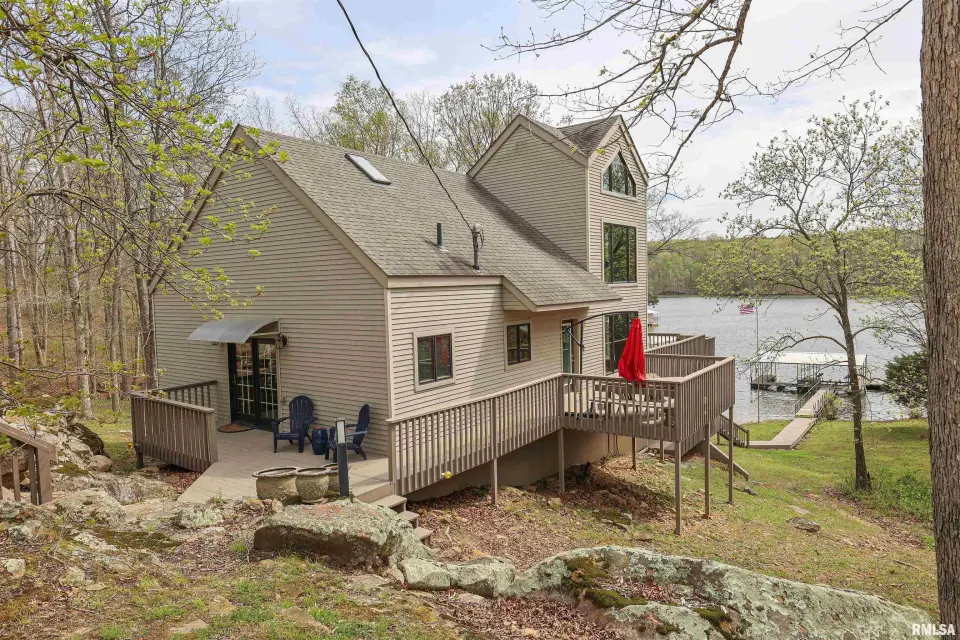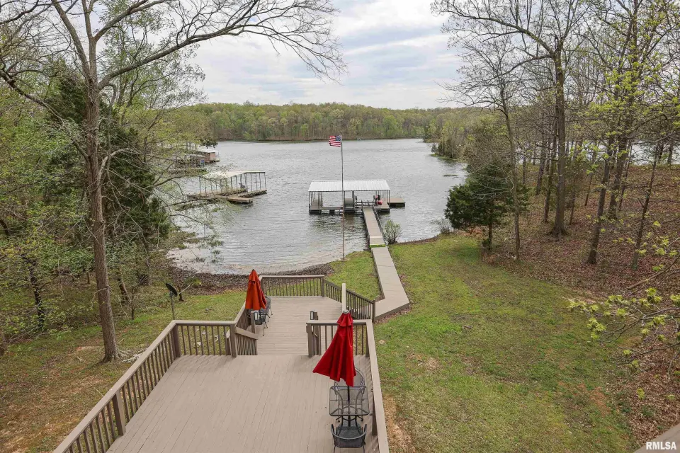 Tucked away in a quiet cove, the property features a gentle slope to the water and a private walkway leading to a covered two-slip dock with lift. Ideal for boating, fishing, or enjoying lake life. Take in stunning views of the Shawnee National Forest from the wraparound deck or unwind on the covered patio. Expansive decking and large windows bring in natural light and showcase serene water and wooded views, creating a seamless connection to the outdoors. Whether you’re looking for a full-time residence, weekend getaway, or investment opportunity, this home offers the perfect blend of seclusion, scenery, and ultimate waterfront living.