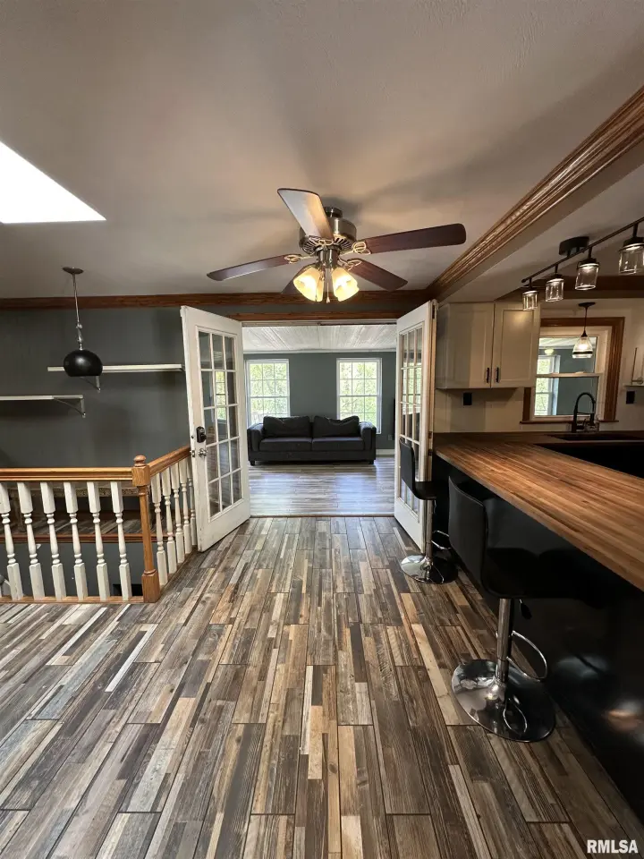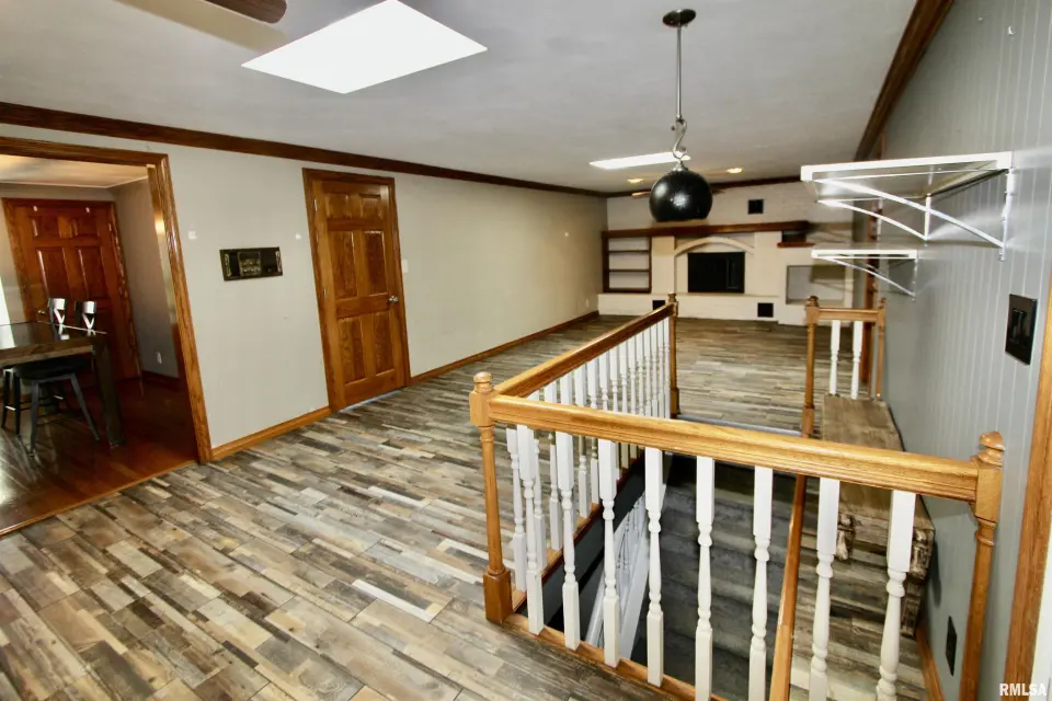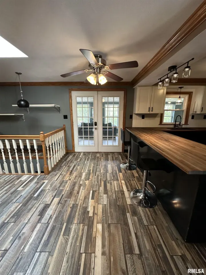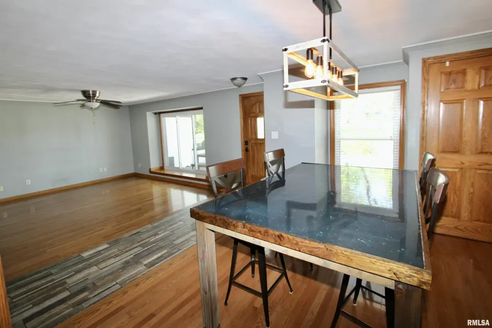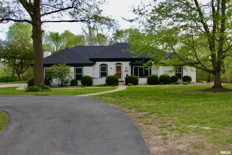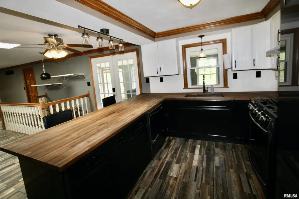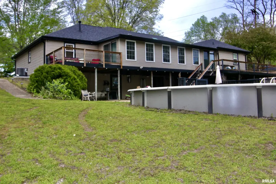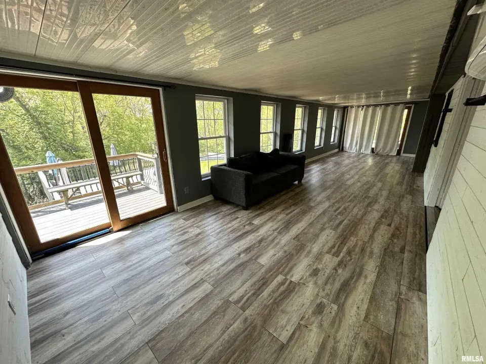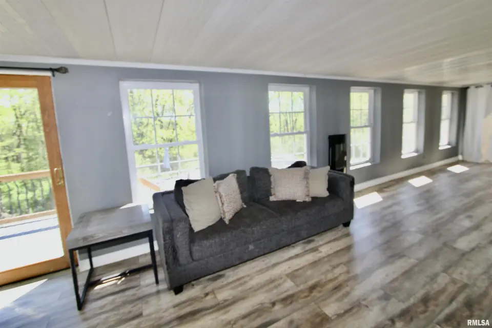 Inside you will find a living room/formal dining combo with stunning hardwood floors. The remodeled kitchen offers walnut butcher block countertops, large breakfast bar, and newer appliances. The kitchen overlooks the inviting family room showcasing a striking brick fireplace creating the perfect cozy gathering space. The kitchen flows seamlessly into the sunroom just off the back ~ an ideal spot to enjoy your coffee while taking in the view. Step outside to the wraparound composite deck overlooking the 30' partial in-ground pool. The primary suite includes its own private remodeled bath and dual closets. Solid wood interior doors throughout the home add warmth and timeless character. The finished walkout basement features newer luxury vinyl flooring, built in bar, wood burning stove, and a fourth bedroom or great home office! Updates include bathroom remodels in 2020, roof 2022, windows 2022, gutters 2022, composite deck in 2023, and the circle top driveway blacktopped in 2022. An incredible bonus to this property is the impressive 80x36 commercial/outbuilding. This versatile space includes a half bath and its own furnace. The building features multiple overhead garage doors for easy access. Appliances and fireplaces are not warranted.