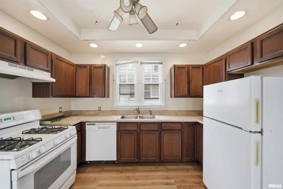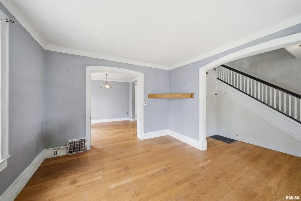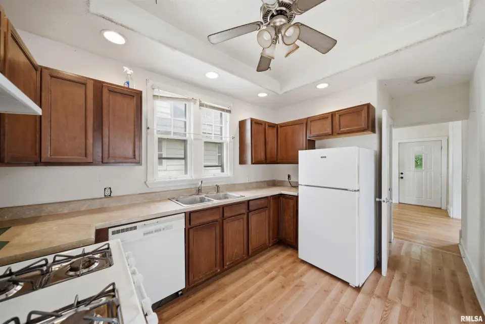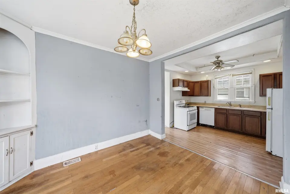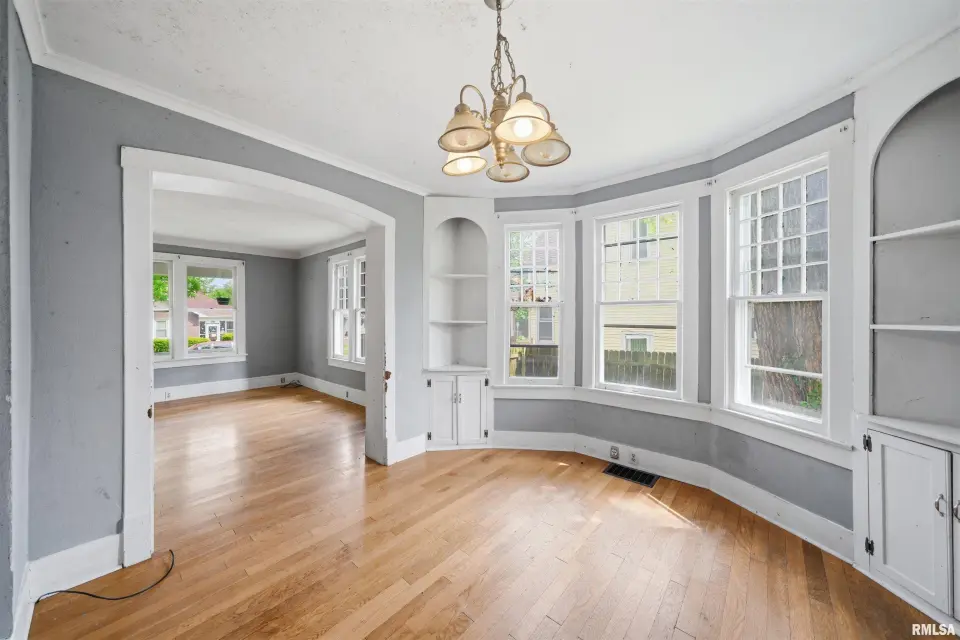 The home features original hardwood floors, traditional built-in cabinetry, and a bright bay window in the formal dining area. With a functional galley kitchen, a welcoming front porch, and a detached garage, the property offers a great foundation for a refresh. This sale is strictly as-is, with no repairs or credits provided by the seller, making it a straightforward project for anyone looking to build equity or expand a rental portfolio.